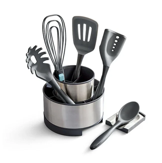 Utensil Starter Set These versatile kitchen tools have a stainless steel or nylon core under the seamless silicone exterior, so they can easily pick up, scoop, stir, chop, or whisk your food without scratching your cookware. The silicone outer layer is safe to use on all cookware surfaces and loved for its durability, heat resistance, and slip-resistance. The ergonomic soft-grip handle is comfortable to hold. Keep these essential cooking tools within reach in the Stainless Steel Rotating Utensil Holder. Product Details Set includes: Silicone Spoon The Silicone Spoon can stir and serve whatever you're dishing out. The spoon's head features a nylon core that is durable for scooping food. Silicone Pasta Fork The Silicone Pasta Fork is great for serving pasta or mixing it with sauce, veggies, or meat. The fork's head features a nylon core that is durable for scooping spaghetti, linguine, fettuccini, and angel hair pasta. The tines easily hold on to noodles without tearing or breaking them. Silicone Slotted Turner The Silicone Slotted Turner can flip, stir, lift, and transfer foods with grease or liquid like burgers. The head of this turner has a stainless steel core that is sturdy but also flexible enough to give it just the right bend to glide under food easily. Mix 'N Chop Spatula Chop, drain, scoop, and serve all with one tool. It has a curved design for the rocking and chopping motion you need to crumble and brown ground beef, turkey, and sausage. It has a spatula area and drain holes to scoop ground meat out of grease and serve it easily. You can also mash and serve avocadoes and eggs or crushed tomatoes for a sauce. The chopper-spatula hybrid features a head with a nylon core that is durable for chopping and scooping food. Whisk Tongs These multipurpose flat whisk tongs, the ultimate kitchen tool, make cooking easy and reduce tool clutter in your kitchen. With just one tool, you can whisk cake mix, grab hard-boiled eggs, flip burgers or bacon, toss salad, and serve food. The adjustable handle helps you easily switch between locking it in a whisk or tong position—saving you tons of space when you’re storing it away. Plus, the tongs are dishwasher-safe for easy cleanup. Stainless Steel Rotating Utensil Holder Keep your favorite cooking tools and utensils at your fingertips any time in the Stainless Steel Rotating Utensil Holder. The exterior is gorgeous stainless steel, so it matches any kitchen. The interior is plastic so it's easy to clean. Remove the center compartment and the hidden spoon rest to cook any way you like. 7½" diameter, 6½" tall.