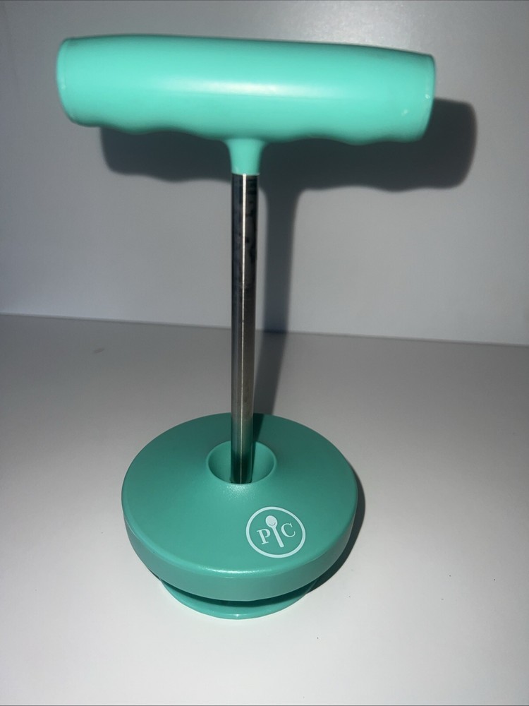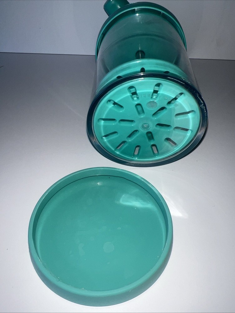 The Pampered Chef Whipped Cream Maker is a handheld whipping cream dispenser designed to easily create homemade whipped cream. This manual dispenser is in a stylish teal color and is model number 1461 from Pampered Chef. Perfect for adding a delightful touch of freshly whipped cream to desserts or beverages, this kitchen tool is a convenient and practical addition to any home cook's collection.