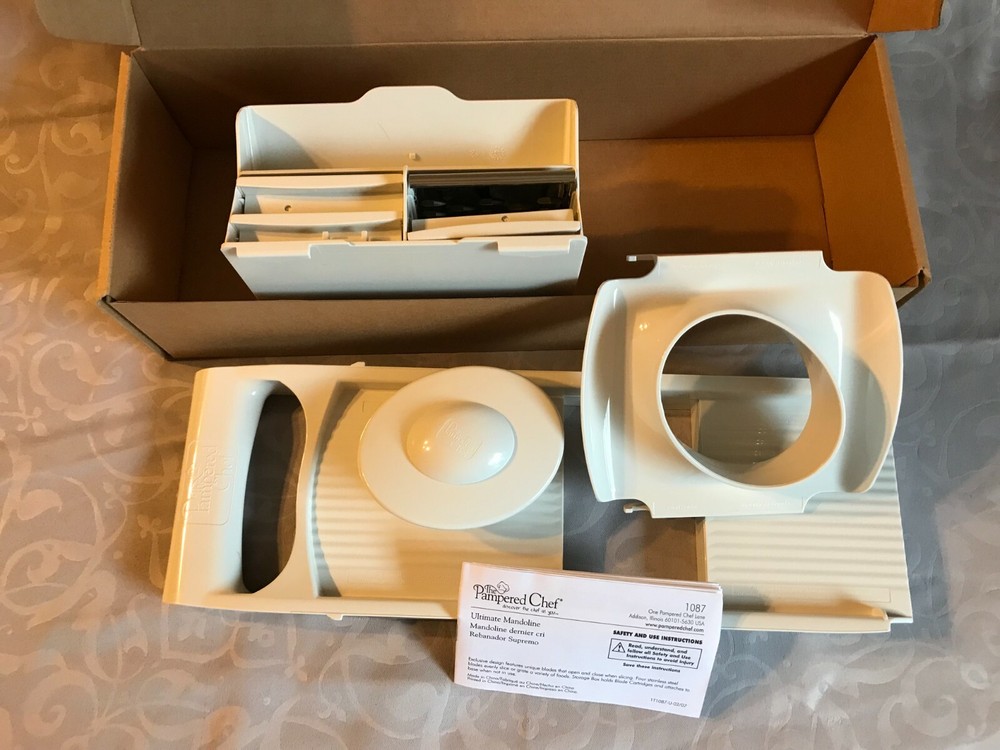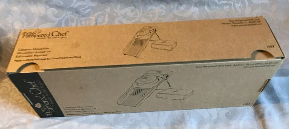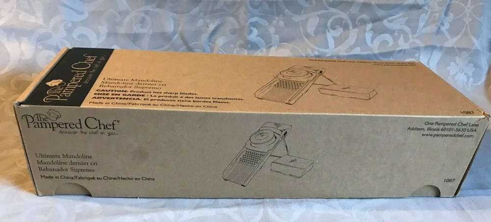 Experience the versatility of the Pampered Chef Ultimate Mandoline 1087, an essential addition to your kitchen arsenal. This multi-functional food slicer comes complete with four interchangeable blades, allowing you to grate cheese, slice fruit, vegetables, meat, and salad with ease. Its robust plastic construction ensures durability, while the non-stick surface makes for effortless food release and cleanup. The unit's lightweight design, coupled with comfortable handles, enables quick and safe operation. The adjustable thickness settings provide control for your desired slicing results. Additionally, the included stand offers stability for the slicer, and the dishwasher-safe components make maintenance a breeze. Model 1087 is a retired collectible, ensuring you've acquired a piece of culinary history for your kitchen.