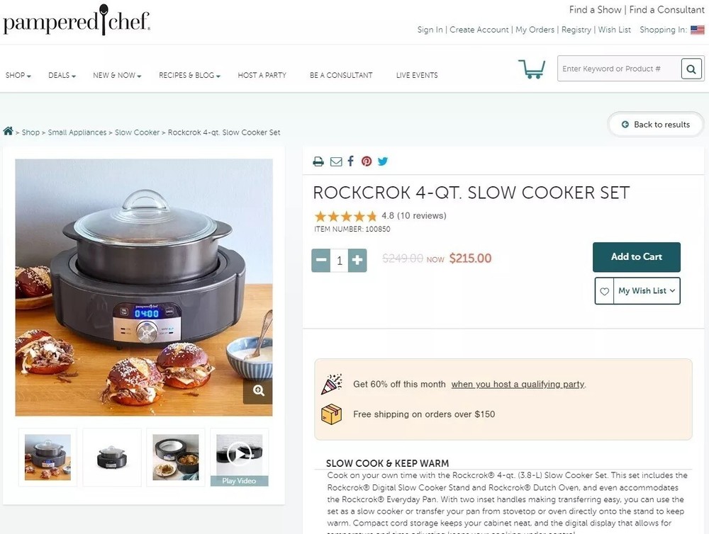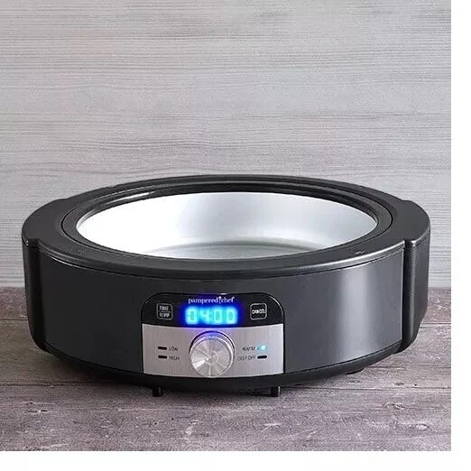 ** US STOCK - FAST & FREE SHIPPING ** PamperedChef: Rockcrok 4-qt. Slow Cooker Set - NIB FreeShip Slow Cook & Keep Warm Cook on your own time with the Rockcrok® 4-qt. (3.8-L) Slow Cooker Set. This set includes the Rockcrok® Digital Slow Cooker Stand and Rockcrok® Dutch Oven, and even accommodates the Rockcrok® Everyday Pan. With two inset handles making transferring easy, you can use the set as a slow cooker or transfer your pan from stovetop or oven directly onto the stand to keep warm. Compact cord storage keeps your cabinet neat, and the digital display that allows for temperature and time adjusting keeps your cooking under control. Guarantee 2-year guarantee Product Details Rockcrok® Digital Slow Cooker Stand Product Details 13¾" (34.5-cm) x 4½" (12-cm), 3.1 lbs. (1.4 kg) Works with the Rockcrok® Everyday Pan and Dutch Oven Two inset handles for easy lifting Internal cord storage Automatic switch to warm Digital display with time and temperature buttons Wipes clean Rockcrok® Dutch Oven Product Details 9" (23-cm) diameter, 4-qts. (3.8-L). Heat-safe to 752°F (400°C). Glass lid is heat-safe to 400°F (200°C) and lets you watch food while it cooks. No preseasoning required. Fridge- and freezer-safe. Dishwasher-safe. Includes these 10 exclusive recipes: Asian Beef Stew Deep Dish Stuffed Focaccia French Onion & Mushroom Soup Mexican Pork Stew with Salsa Verde Mocha-Braised Short Ribs Red-Wine Braised Pork Ragout Roasted Vegetable Primavera Rustic Grill-Braised Chicken Southern Style Chicken & Sausage Spinach & Seafood Chowder Shipping This item is IN STOCK from warehouse in USA and ready to ship within 24 hours. We strive to make the shipping process as easy as possible. Most of our items ship out within 24-48 hours and take 3-8 days for delivery. If you have any questions about our shipping policy or delivery times please don't hesitate to contact us. We DO NOT ship to the following: PO BOX & APO/FPO Addresses Hawaii, Alaska, Puerto Rico, & Virgin Islands. We ship to the continental 48 US States Only.