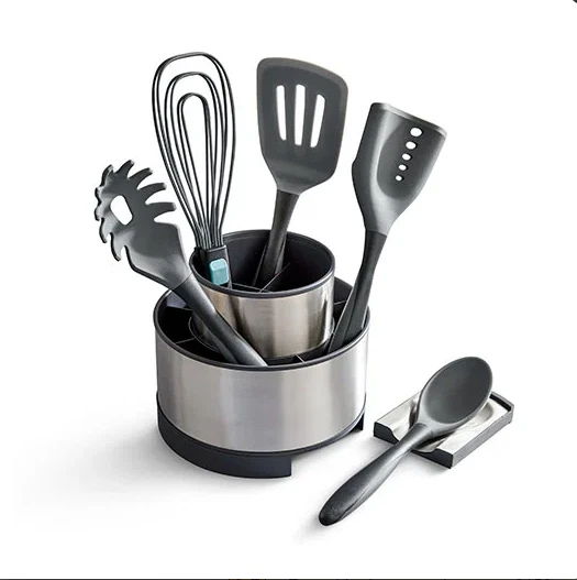 Utensil Starter Set These versatile kitchen tools have a stainless steel or nylon core under the seamless silicone exterior, so they can easily pick up, scoop, stir, chop, or whisk your food without scratching your cookware. The silicone outer layer is safe to use on all cookware surfaces and loved for its durability, heat resistance, and slip-resistance. The ergonomic soft-grip handle is comfortable to hold. Keep these essential cooking tools within reach in the Stainless Steel Rotating Utensil Holder. Product Details Set includes: Silicone Spoon The Silicone Spoon can stir and serve whatever you're dishing out. The spoon's head features a nylon core that is durable for scooping food. Silicone Pasta Fork The Silicone Pasta Fork is great for serving pasta or mixing it with sauce, veggies, or meat. The fork's head features a nylon core that is durable for scooping spaghetti, linguine, fettuccini, and angel hair pasta. The tines easily hold on to noodles without tearing or breaking them. Silicone Slotted Turner The Silicone Slotted Turner can flip, stir, lift, and transfer foods with grease or liquid like burgers. The head of this turner has a stainless steel core that is sturdy but also flexible enough to give it just the right bend to glide under food easily. Mix 'N Chop Spatula Chop, drain, scoop, and serve all with one tool. It has a curved design for the rocking and chopping motion you need to crumble and brown ground beef, turkey, and sausage. It has a spatula area and drain holes to scoop ground meat out of grease and serve it easily. You can also mash and serve avocadoes and eggs or crushed tomatoes for a sauce. The chopper-spatula hybrid features a head with a nylon core that is durable for chopping and scooping food. Whisk Tongs These multipurpose flat whisk tongs, the ultimate kitchen tool, make cooking easy and reduce tool clutter in your kitchen. With just one tool, you can whisk cake mix, grab hard-boiled eggs, flip burgers or bacon, toss salad, and serve food. The adjustable handle helps you easily switch between locking it in a whisk or tong position—saving you tons of space when you’re storing it away. Plus, the tongs are dishwasher-safe for easy cleanup. Stainless Steel Rotating Utensil Holder Keep your favorite cooking tools and utensils at your fingertips any time in the Stainless Steel Rotating Utensil Holder. The exterior is gorgeous stainless steel, so it matches any kitchen. The interior is plastic so it's easy to clean. Remove the center compartment and the hidden spoon rest to cook any way you like. 7½" diameter, 6½" tall.