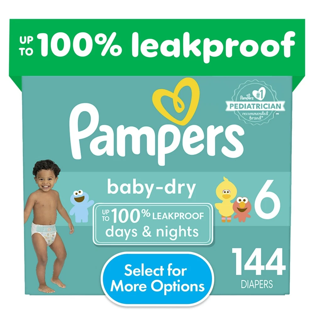 Product details A good night's sleep starts with a great diaper, and Pampers Baby-Dry diapers give you and your baby up to 100% leakproof nights and happy mornings. Made to protect your baby's delicate skin, our exclusive LockAway Channels absorb wetness and lock it safely away, while our protective Dri-Weave Liner helps keep skin healthy. Plus, our Baby-Dry Diapers are hypoallergenic and completely free of parabens and latex.* These are just a few of the many reasons Pampers is the #1 pediatrician recommended diaper brand-and your baby's best bet for comfy protection. Pampers also keep messes to a minimum. To help contain leaks and prevent blowouts, our Baby-Dry diapers feature all-around stretchy sides and large tape fasteners for a secure and comfy fit. Plus, they come equipped with our Dual Leak-Guard Barriers that are specially designed to protect around the legs, where leaks tend to happen most. And when your baby is due for a diaper change, our handy Wetness Indicator lets you know. No need for guesswork.Use Baby-Dry diapers with our Pampers Sensitive Wipes to help keep your baby's skin healthy and prevent irritation. New & improved! Packaging and prints may vary. Ships in 100% recyclable packaging. *Natural Rubber Pampers Baby Dry Diapers Size 6 144 Count Up to 100% leakproof nights and happy mornings with LockAway Channels Helps prevent leaks with stretchy sides and large tape fasteners for a secure and comfortable fit Helps keep skin dry and healthy with Dri-Weave Liner Trusted protection-from Pampers #1 pediatrician recommended brand* (*Based on a 2021 survey of U.S. and Canadian pediatricians) Gentle on baby's delicate skin-hypoallergenic and free of parabens and latex* (*Natural Rubber) Use with Pampers Baby-Clean wipes to keep baby's skin clean and dry New Look! Product & packaging may vary. Ships in 100% Recyclable Box.
