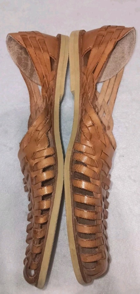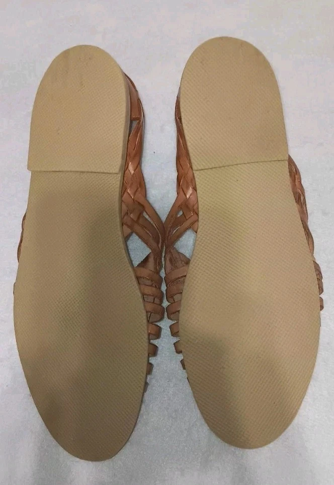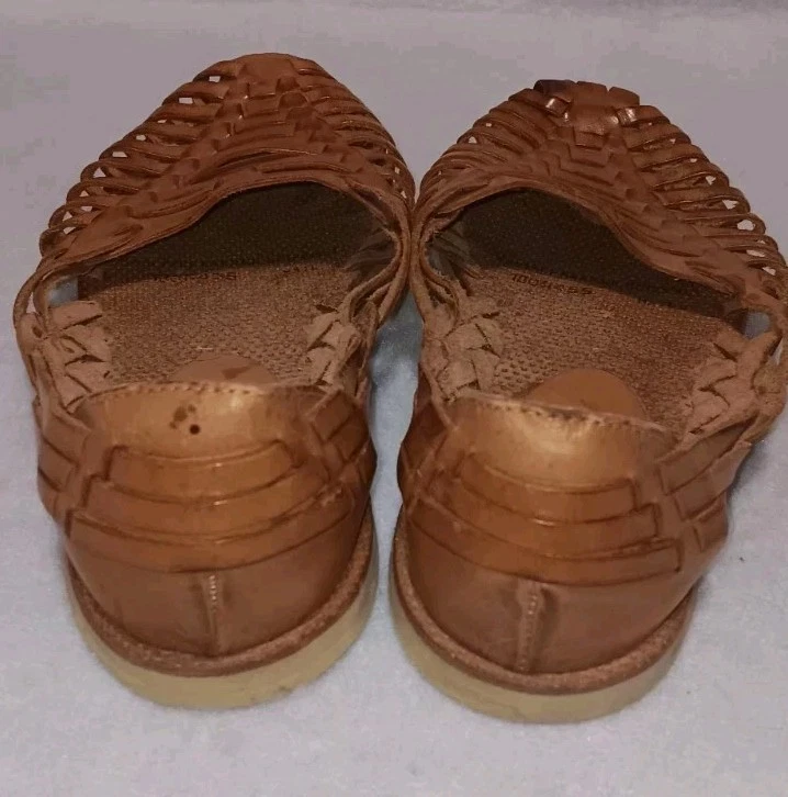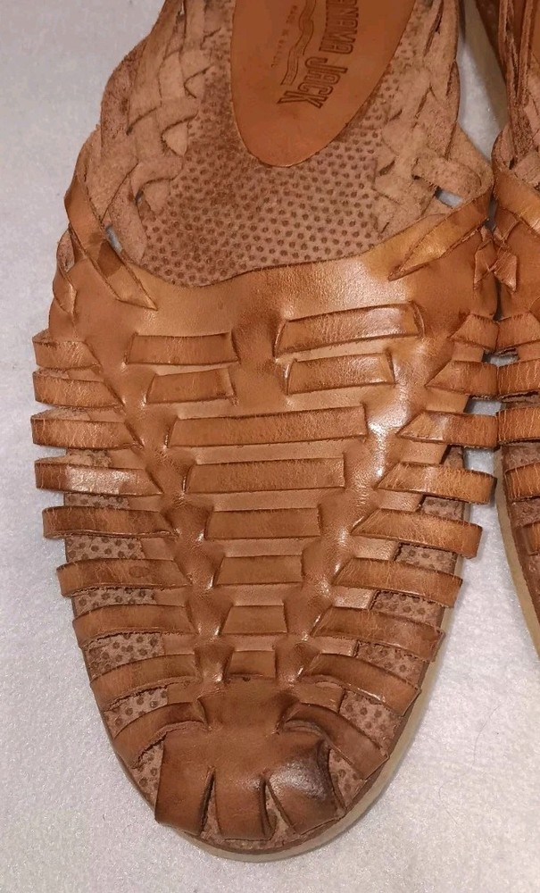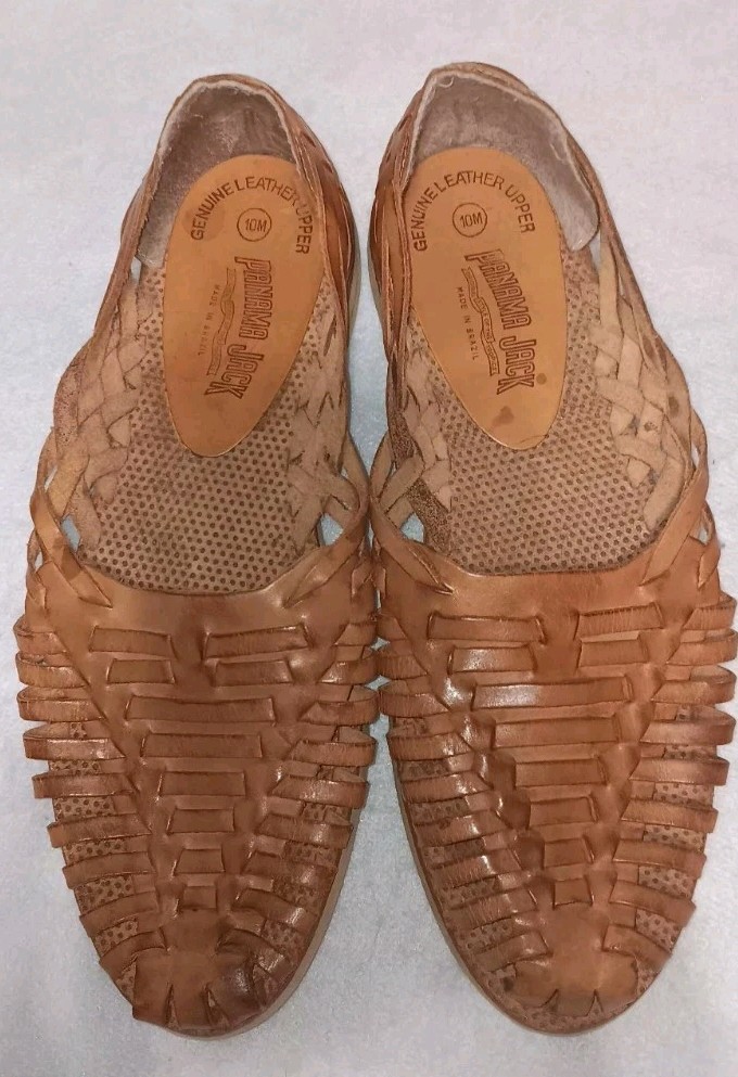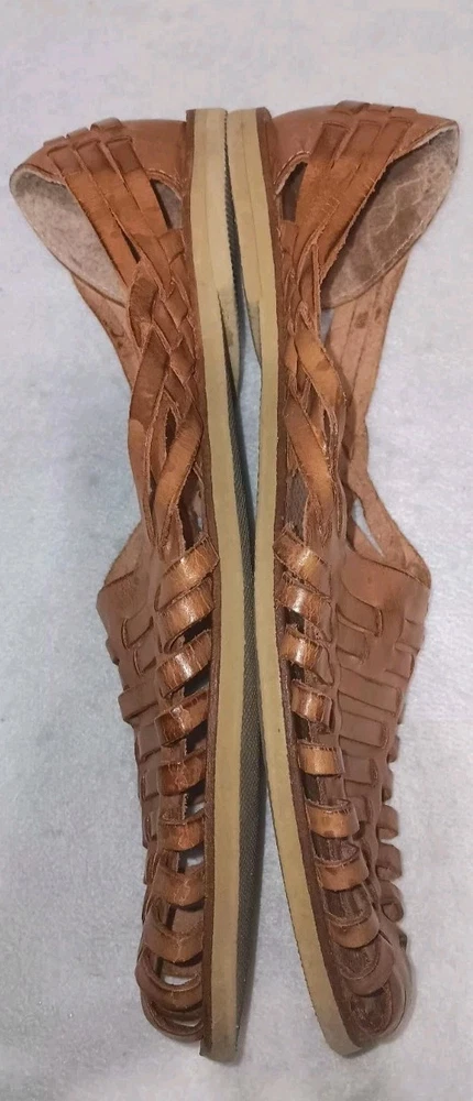 The Panama Jack Leather Huarache Sandals for men in size 10 feature a genuine leather upper in a classic brown color. These slip-on sandals are designed with a leather outsole and upper, providing durability and comfort for everyday wear. The Huarache style adds a touch of traditional flair to your casual look, making these sandals a versatile and stylish option for any man's shoe collection. ***there are a few spots as shown in photos***