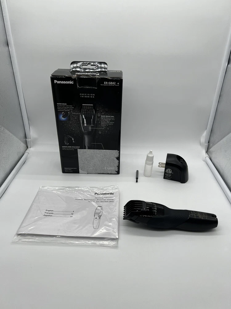 Panasonic ERGB42K Cordless Men's Beard Trimmer - Black (R3(18) Used, Tested it works. Personalized Cutting and Sculpting: An adjustable dial with 19 settings to get the exact look you want; included comb attachment raises flattened hairs for clean cutting. Cutting Length Steps: 19, Cutting Length Adjustment: 1.0-10 mm, Cutting Length w/o Attachment: 0.5 mm Precision 45-Degree Blade Cutting System: Ultra-sharp, hypoallergenic blades make this an ideal beard trimmer for men for quick, efficient hair, beard, and mustache grooming Rubberized, Ergonomic Grip for Maximum Comfort: Sleek design is easy to hold and gives total control for clean, detailed cutting and trimming Wet/Dry Mens Trimmer: Waterproof, 100 % washable cordless mustache trimmer lets you comfortably trim in or out of the shower Charges Fast & Travels Easily: The ER-GB42 beard trimmer charges quickly in AC wall adaptor for up to 50 minutes of use and packs easy. Order WER9606P replacement blade to maintain optimal trimming