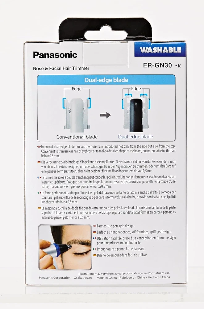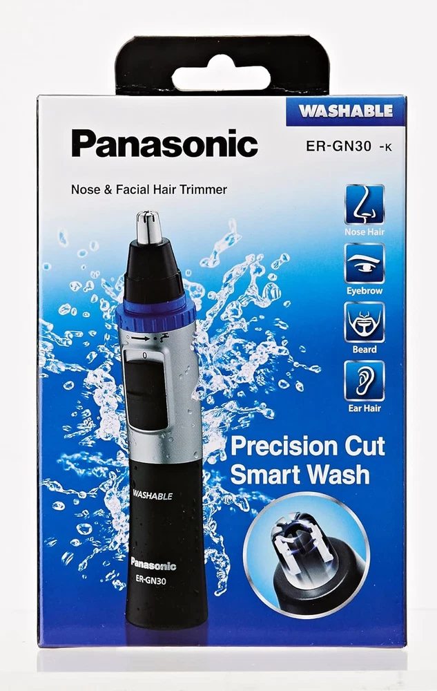 Store New Arrivals Add to Favorite View Feedback Contact Panasonic ER-GN30-K Nose, Ear N Facial Hair Trimmer Wet/Dry with Vortex Cleaning System, Black Description Item model number ER-GN30-K503 Language English Color Blue Product Dimensions 5.2 x 1.3 x 2.8 inches; 2.12 ounces Hair Type All Item Weight 0.06 Kilograms Batteries 1 AA batteries required. Recommended Uses For Product Nose Is Discontinued By Manufacturer No Brand Panasonic Manufacturer Panasonic Ergonomic Angled Body - Easy To Use Pen-grip Body & Sharp 60 Degree Inner Blade Does Not Pull On The Hair New Precise And Fast Blade - Improved Dual Edge Blade Can Cut The Nose Hairs. Convenient To Trim Useless Hair Of Eyebrow Or To Make Detailed Shape Of The Beard, But Not Suitable For Hair Below 0.5mm Washable - Easy To Clean: Simply Soak In Water And Switch On. Water Flows Like A Screw And Blows Out The Hair. Protective Cap Cleaning Brush With this compact nose, ear and detail trimmer, keeping a well-groomed appearance has never been easier. Its ultra-sharp, dual-edge blades comfortably clip nose and ear hair, detail mustaches and eyebrows, and remove unwanted facial and body hair. Fully immersible, it trims and grooms dry over the sink or wet in the shower. A powerful Vortex Cleaning system makes cleaning the blades as fast as it is simple. Uniquely curved rotating, hypo-allergenic dual-edge stainless-steel blades trim cleanly from both top and sides. And the nose clipper's precision blade alignment leaves the optimal number of nasal hairs needed to maintain the nose's healthy, natural filtering system. With Vortex cleaning, simply immerse the trimmer under running water and touch the on switch. As the blades rotate, a rapid stream of water is drawn in and flushed through the trimmer to remove stubble and residue, and ensure pristine blades for the next trim. For stubborn stubble or residue, a cleaning brush is included for quick, on-the-spot maintenance. Wipe dry with a soft towel or cloth. When you’re in a hurry, the ER-GN30 provides a quick dry trim or touch-up over the sink. And because this high-quality personal trimmer is fully immersible in water, it performs just as comfortably and efficiently in the shower. At home and away, the cordless, compact trimmer provides up to 90 minutes of power with a single AA-size Alkaline battery (not included). Specifications Blades: Dual-Edge Stainless-Steel Waterproof: Fully Immersible Power Source: One AA Battery (not included) Operating Time: Up to 90 minutes Dimensions: 5.2 x 1.3 x 1.4 in Weight: 2.2 oz Includes Panasonic ER-GN30-K Trimmer (2) Panasonic Protective Cap Panasonic Cleaning Brush Panasonic 2 Year Warranty . ABOUT US We offer the best prices around on high quality products. Our E-store includes media such as books, movies, music and games while offering electronics, toys, sporting apparel, clothing, tools, general home, garden items and more. SHIPPING We are always working hard to ensure your package arrives as soon as possible. Please understand that some factors like weather, high postal traffic, and the performance of shipping companies are outside of our control. We offer free shipping to the lower 48 states and ship within 2 business days of payment, usually sooner. We do not accept P.O. Boxes. Please provide a physical address. RETURNS We offer a 30-Day Return Policy on items which you are not completely satisfied with. You have the option for a full-refund or an exchange of the item. No returns are available on items shipped outside of the USA. PAYMENT We accept PayPal. CONTACT US This page content is yet to come Please ad us to your favorite seller and visit again later Thank You CUSTOMER SATISFACTION We try our very best to make sure every customer is completely satisfied. If there's a problem, message us! We're happy to help.