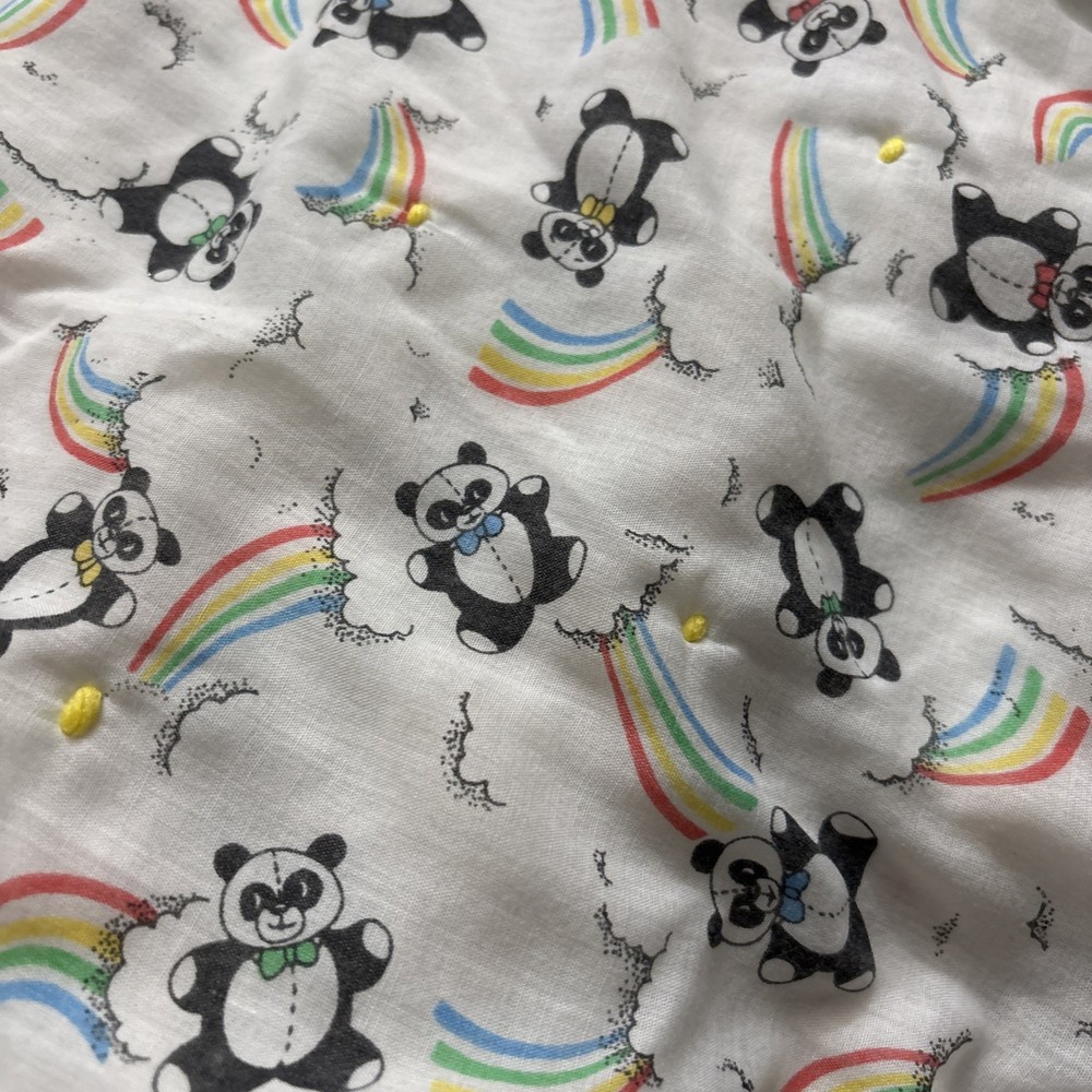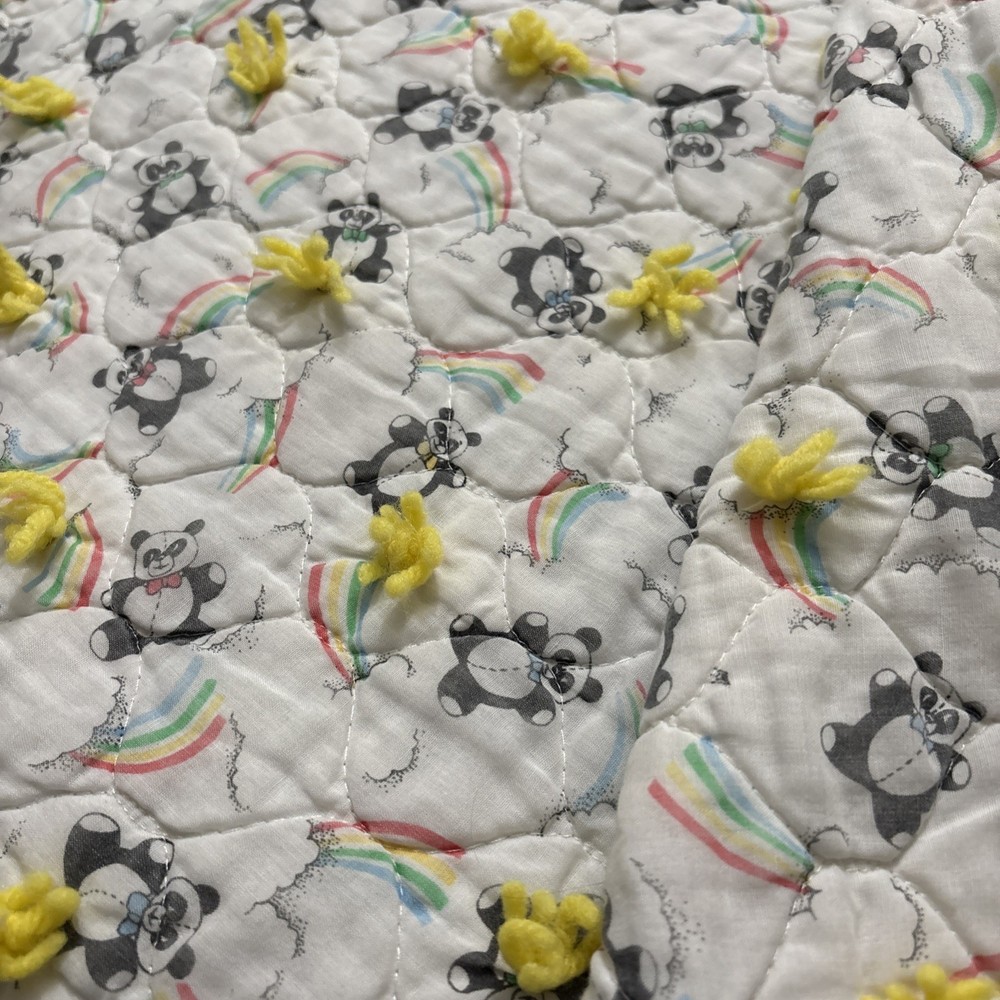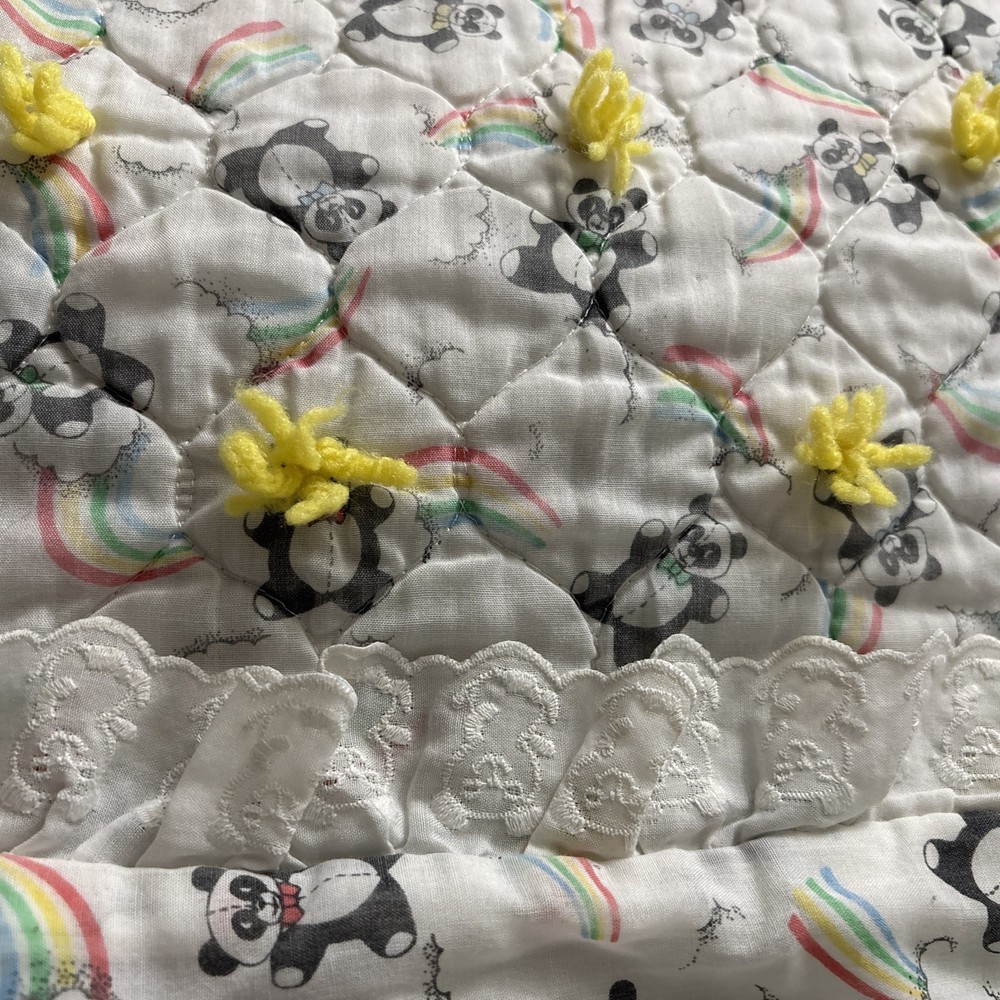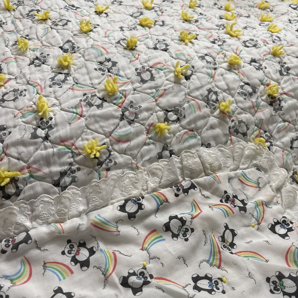 One side is a little more faded than the other but both sides are still pretty vibrant for the age of the item. Stylish and unique. This vintage crib toddler baby blanket features a charming design with panda bears and rainbows, accented with delicate panda bear lace and yarn details. Measuring 46x52 inches, this multicolor blanket is perfect for infants and toddlers. Machine washable for easy care, this cozy and whimsical blanket is sure to keep your little one warm and stylish in their crib. Reversible