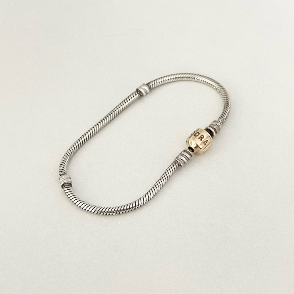 Authentic Genuine Pandora Two Tone Moments Snake Chain Bracelet •Set in sterling silver with a solid 14k yellow gold clasp •Size: 7.5" •Stamped 585 ALE •Excellent condition •Perfect to add to your Pandora bracelet collection or to gift to a friend, mom, girlfriend, daughter, wife, etc. •Please check out my other Pandora charms for sale, bundle and save on shipping! •Fast shipping! I ship same or next business day!