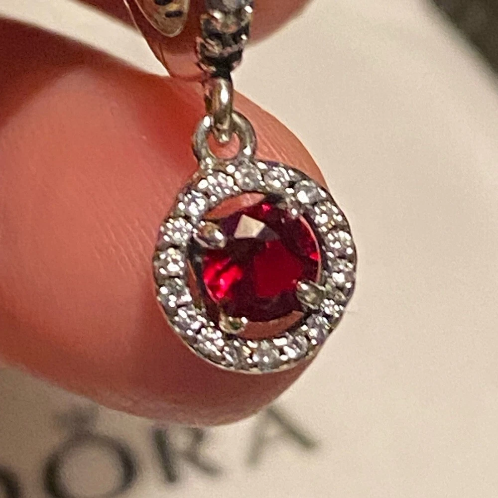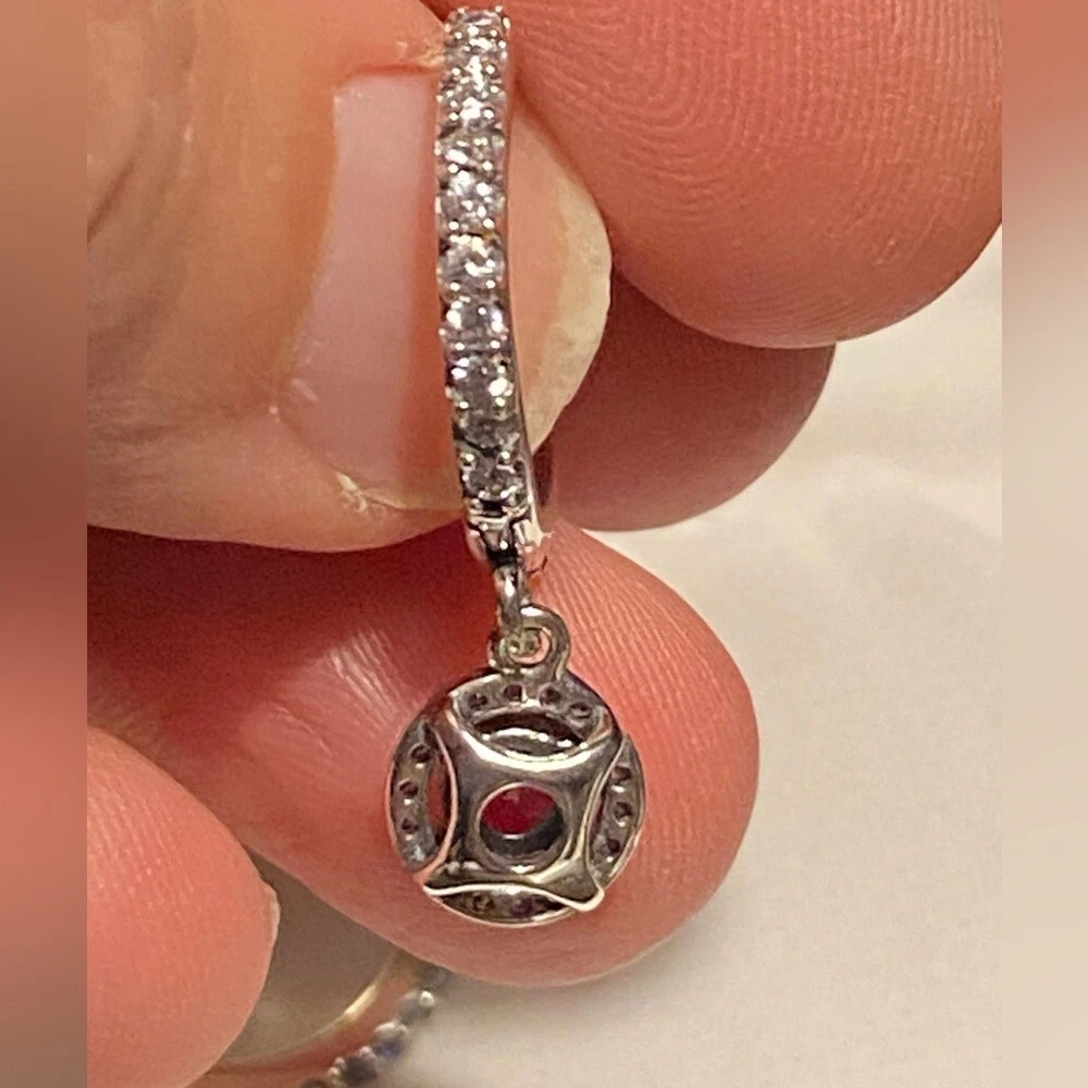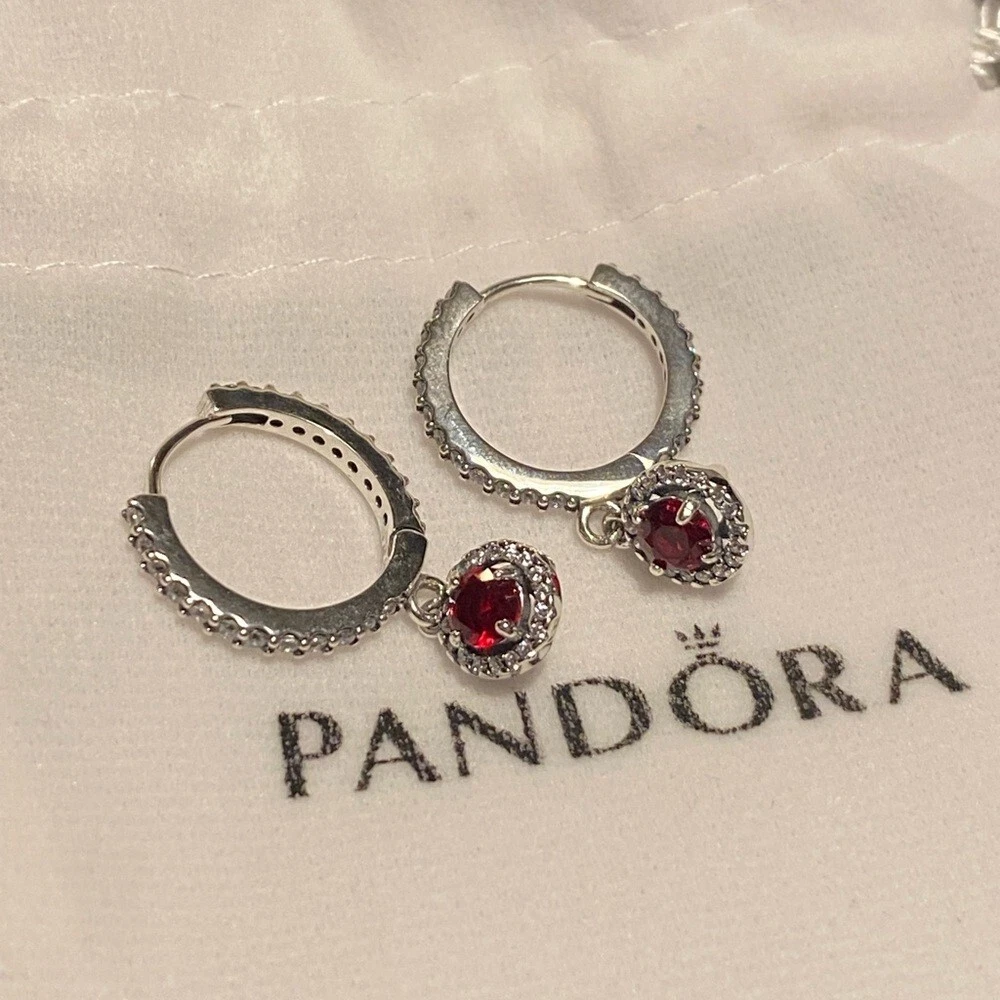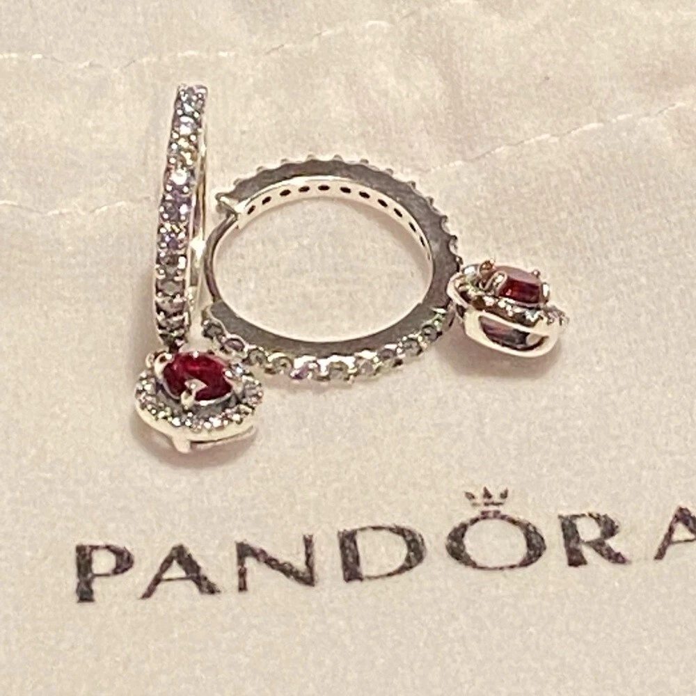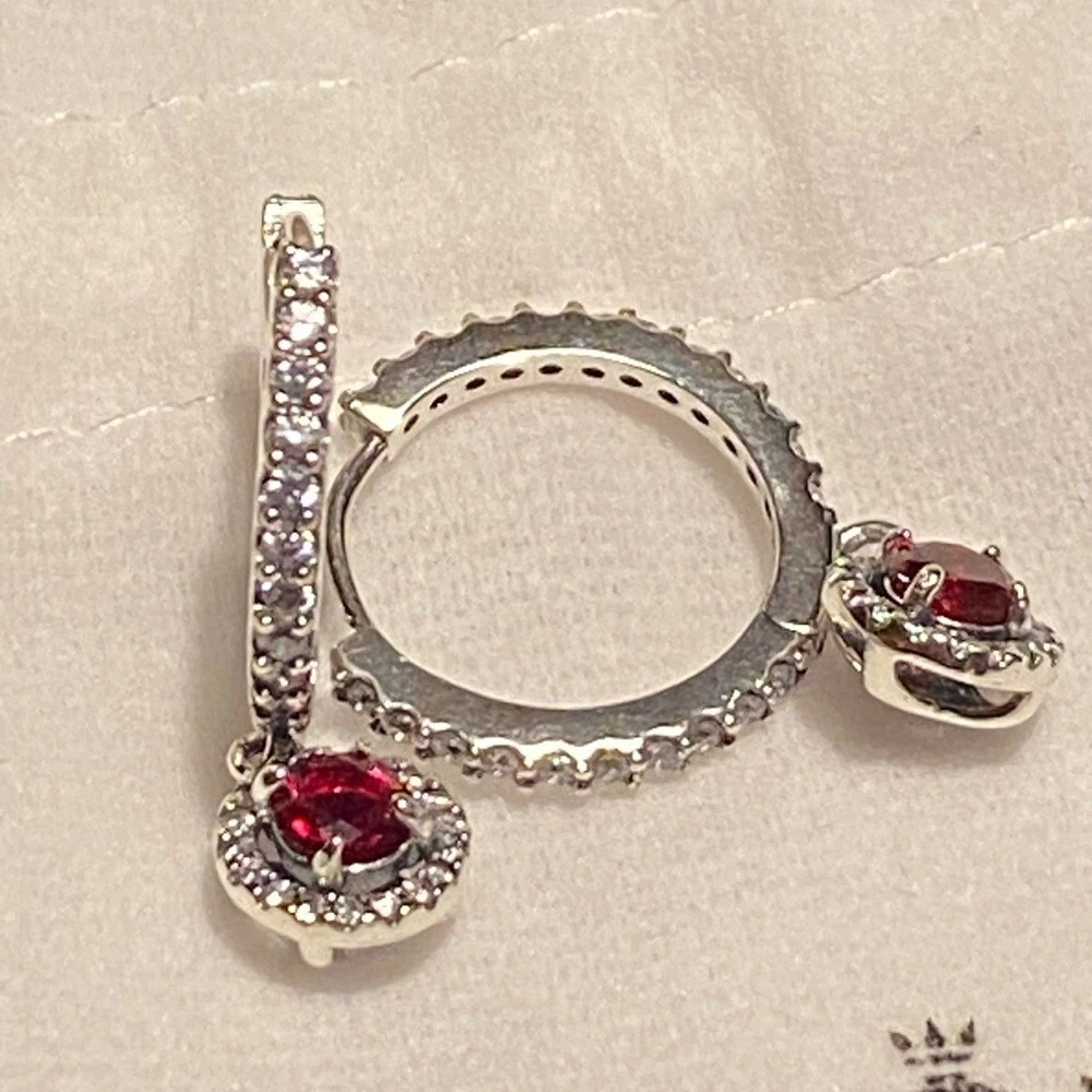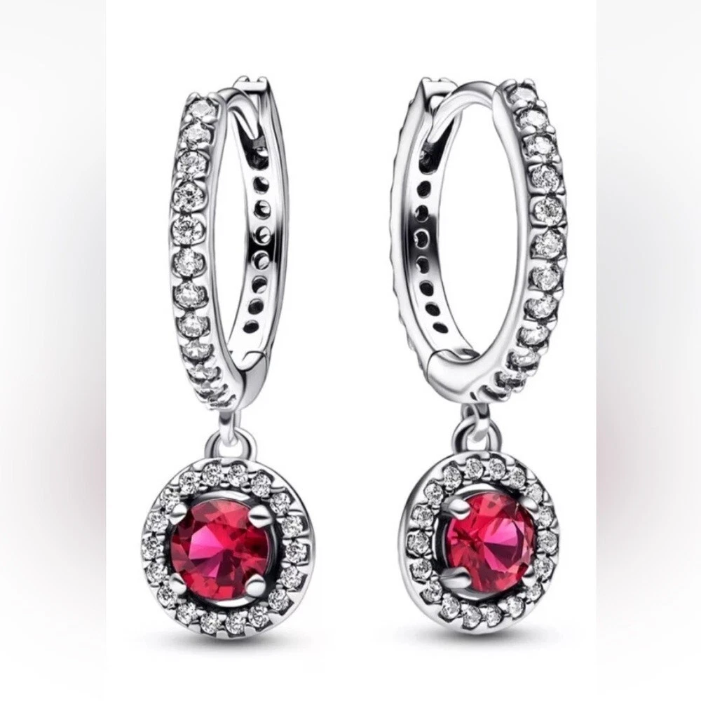 Pandora Ale red round sparkling hinged huggie hoops w/ cubic zirconia pave.