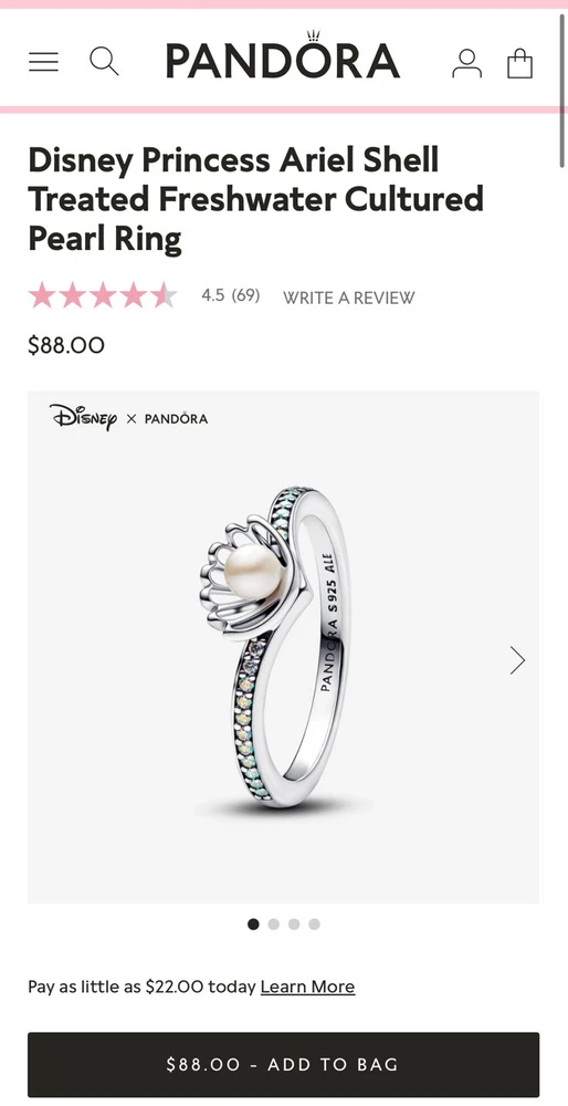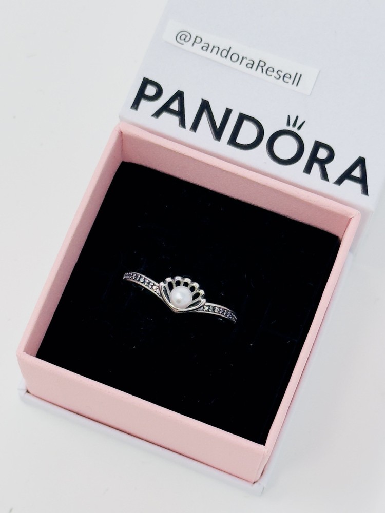 Brand new, comes with gift box MSRP: $88 Complete your collection with this sterling silver ring, inspired by Disney's Ariel. A unique openwork seashell design showcases a white treated freshwater cultured pearl at its center. A channel of stones along the wishbone-shaped band shimmer with light, recalling sunshine on ocean waves. Wear it as a symbol of Ariel's journey and the transformative power of being true to yourself.
