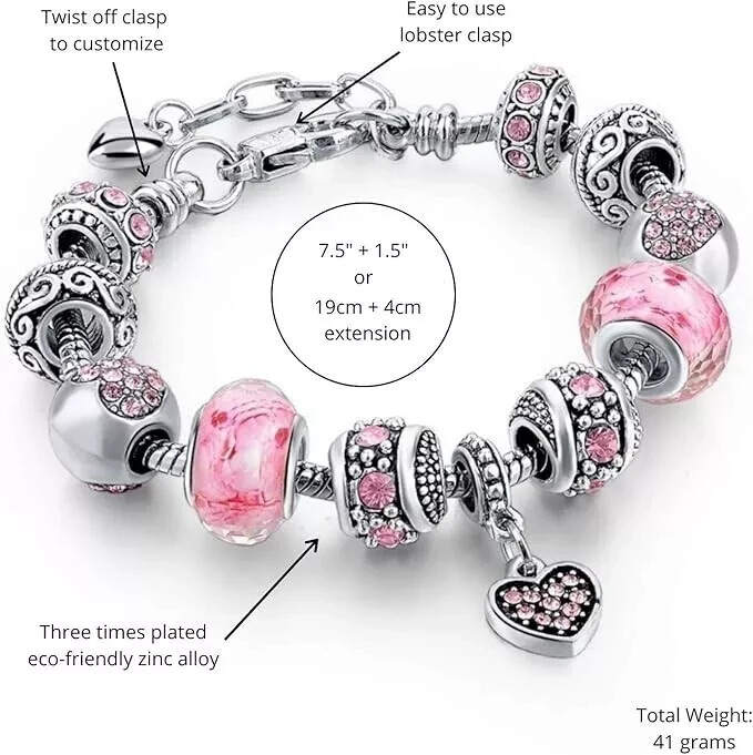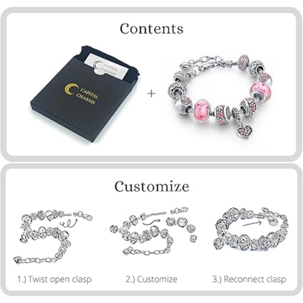 About This Item: Elegant Adjustable Charm Bracelet with Crystal Beads – Perfect Gift for Her ✨ Stylish and Customizable Jewelry This beautiful charm bracelet set is crafted with a silver snake chain adorned with sparkling crystal charms and beads. Its adjustable design and customization options make it a standout piece for any jewelry lover. Features: Adjustable Design: Features a sleek silver snake chain with a lobster clasp and link chain extension, ensuring a perfect fit and easy wear. Customizable Style: Arrives ready to wear, but you can easily customize it! Rearrange, add, or remove charms and beads to suit your personal style. Bead Stopper Included: All authentic Capital Charms bracelets include a stopper to secure beads and prevent them from falling if the clasp is accidentally opened. Gift-Ready Packaging: Comes with a branded gift box, soft protective jewelry pouch, and instruction cards, making it an excellent gift choice. 🎁 Perfect Gift Ideas for Her: Whether for your mom, daughter, sister, best friend, or girlfriend, this charm bracelet is an ideal gift for special occasions like: Valentine’s Day Birthdays Christmas Anniversaries 🌟 Why Choose Capital Charms? Elegant and versatile design. Premium materials for durability and shine. Thoughtful packaging ensures a luxurious gifting experience. ✨ Order yours today and delight someone special with this timeless piece!
