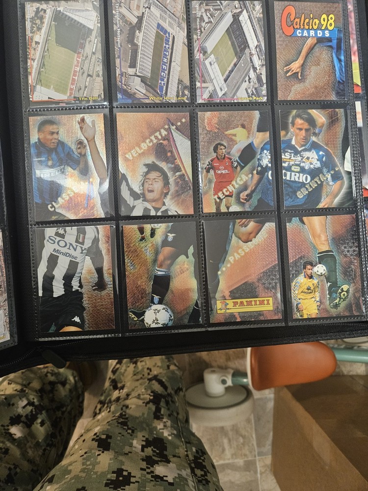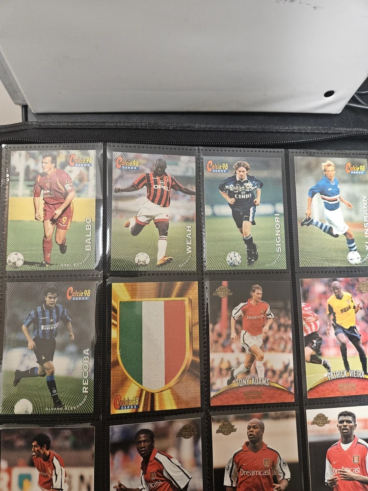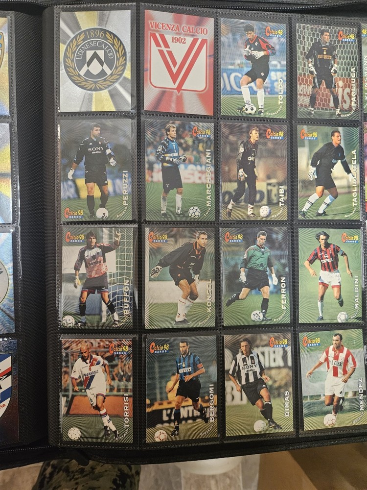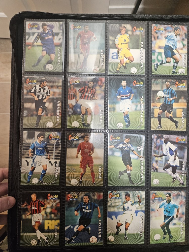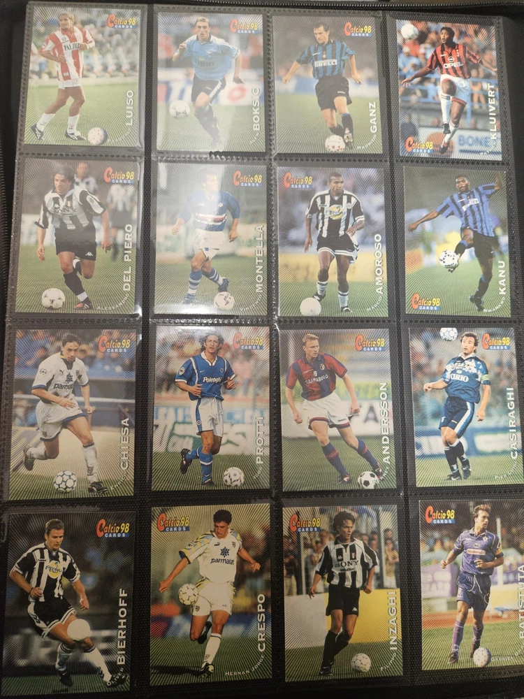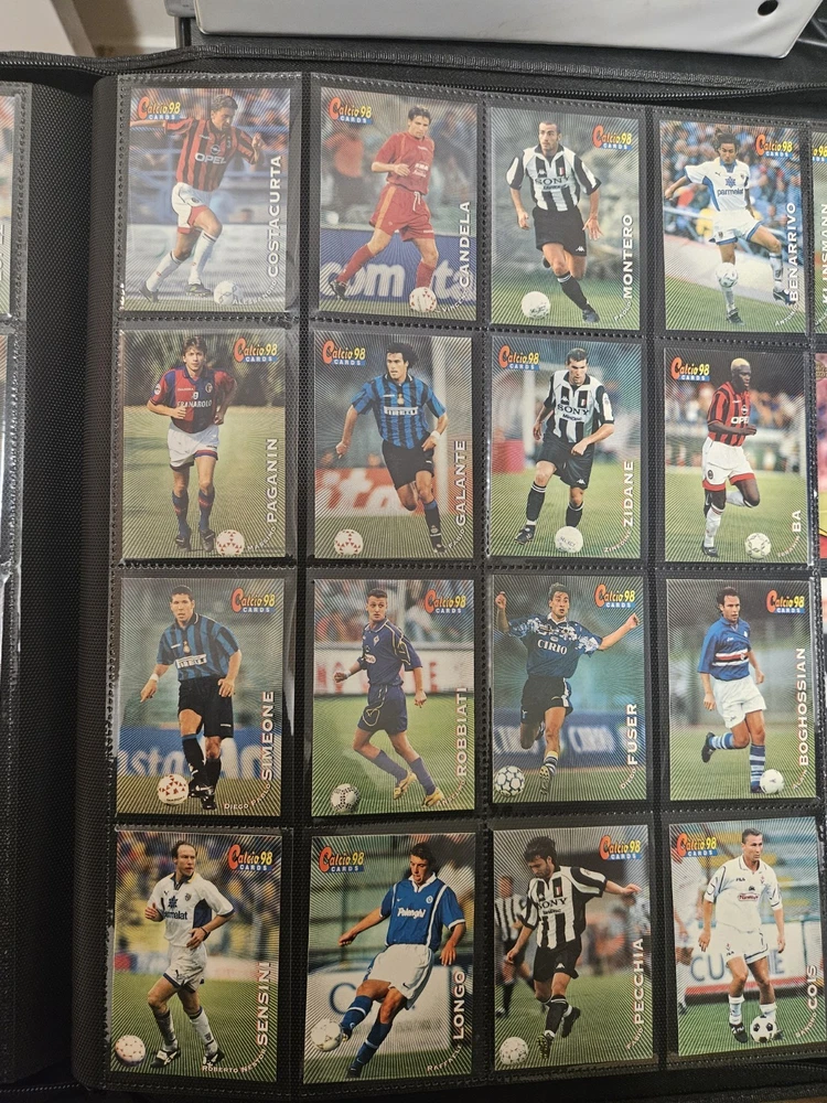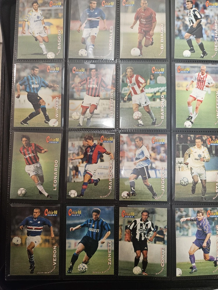 The product is a rare and vintage 1998 Panini Calcio Serie A complete set of sports trading cards in excellent condition. It includes cards featuring popular soccer players such as Ronaldo, from teams like Juventus, Inter Milan, Roma, and AC Milan. The cards are in standard size, made of paper, and are original prints licensed by Panini. This set is a valuable collector's item for fans of Italian soccer and sports trading cards from that era.