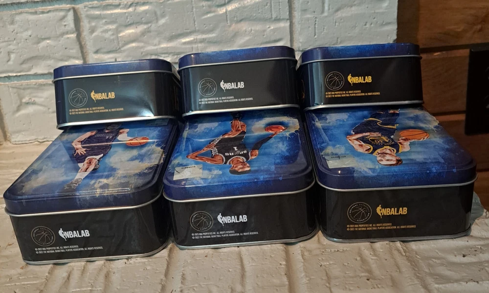 This Panini Prizm Collectible Empty Tins NBA LABS X 6 is a must-have for any basketball trading card collector. The set features some of the most popular NBA players, including Nikola Jokić, Victor Wembanyama, Stephen Curry, Giannis Antetokounmpo, and Luka Dončić. The tins are made of high-quality aluminum material Each box is perfect for storing and displaying your collection, while the durable material ensures that your cards stay safe and protected. Whether you're a fan of the Golden State Warriors, San Antonio Spurs, Dallas Mavericks, Milwaukee Bucks, or Denver Nuggets, this set is a great addition to your collection. Don't miss out on the chance to own this unique and rare set of sports trading card tins. The set includes two Stephen Curry Tins. Both tins have slight dents on the bottom, and one tin has a slight dent on the side. These imperfections are shown on the last two pictures.
