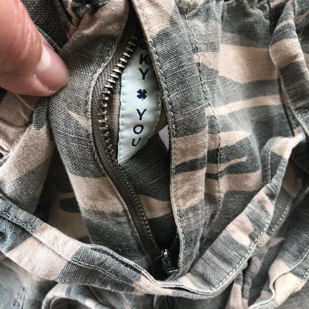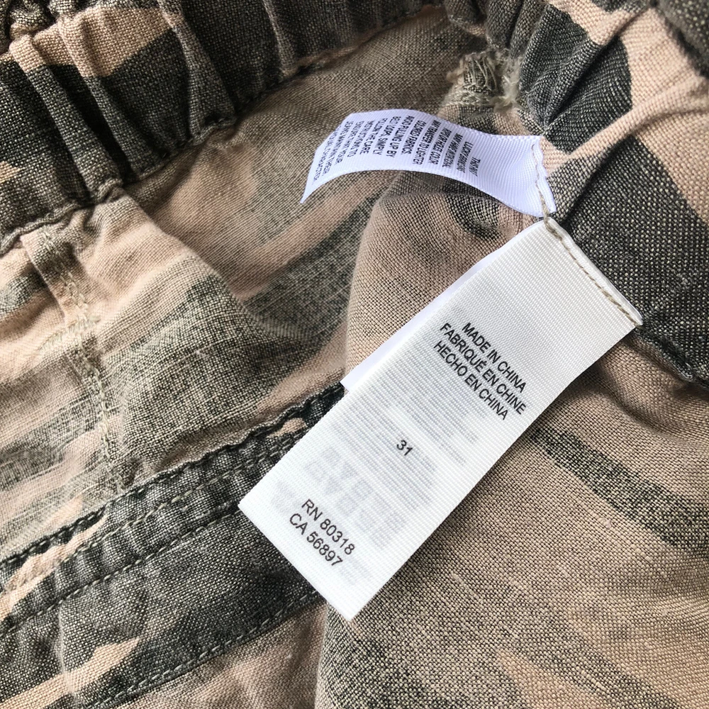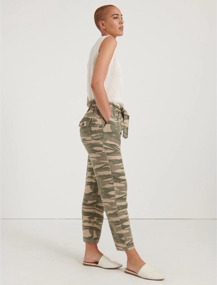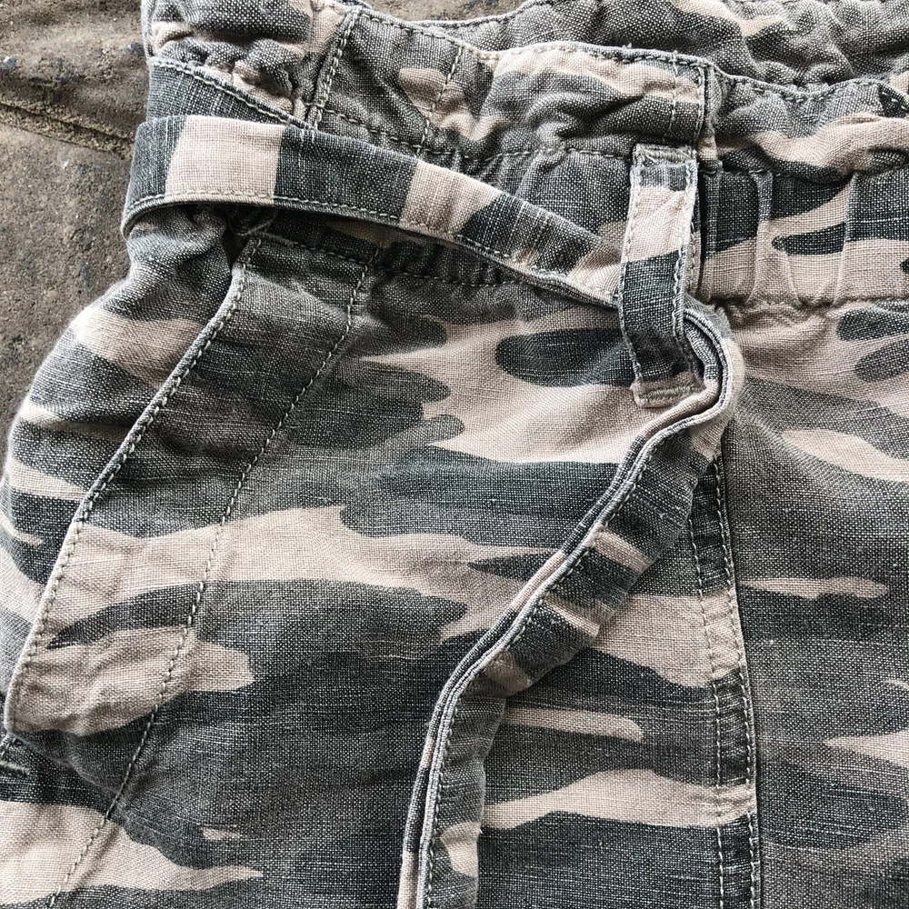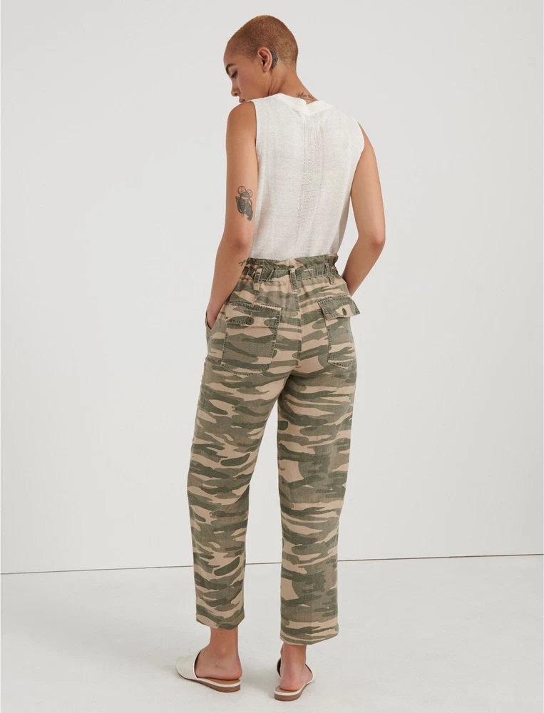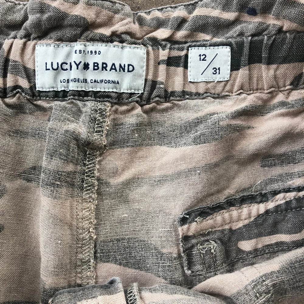 Lucky Brand Khaki Camo Soft Utility Boyfriend Ruffle Waist Linen BlenPants 12/31. Great condition 7W21002 2019 Tie waist Zip Linen rayon 17” waist flat 12” front rise 26” inseam Relaxed loose comfy fit