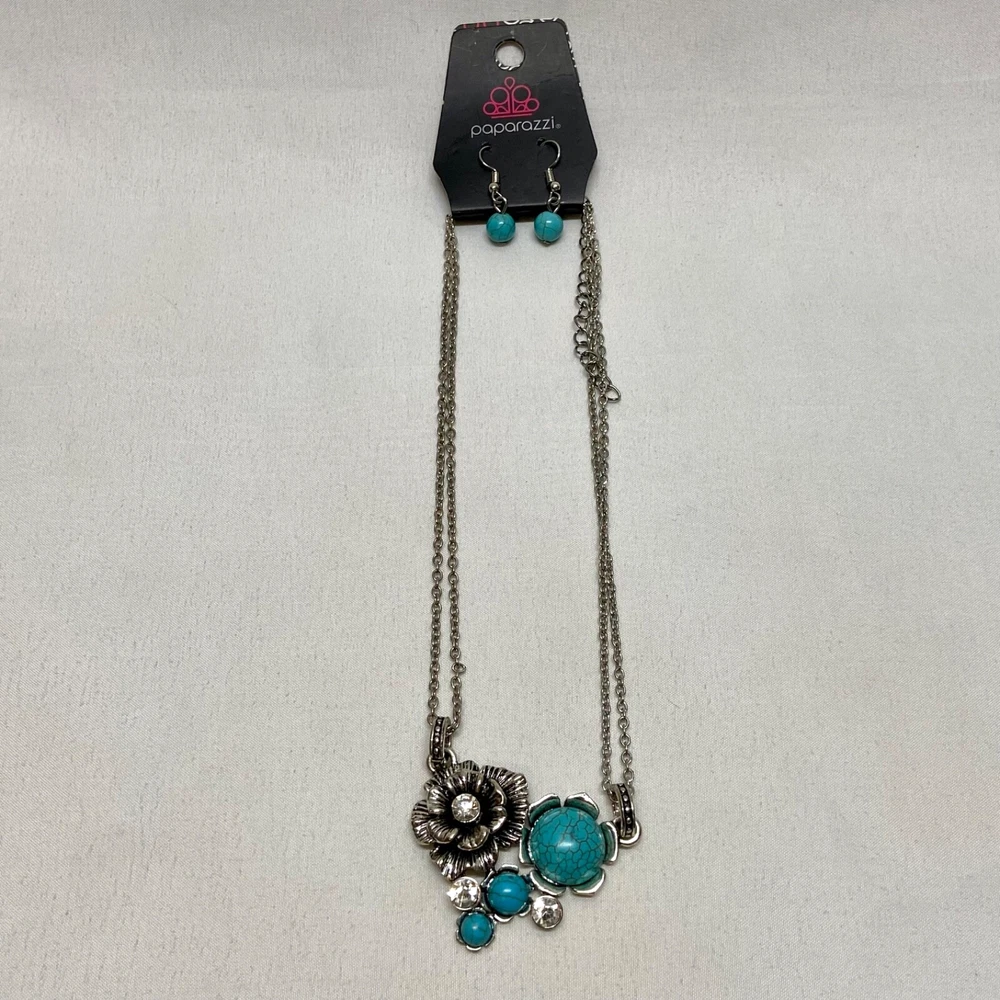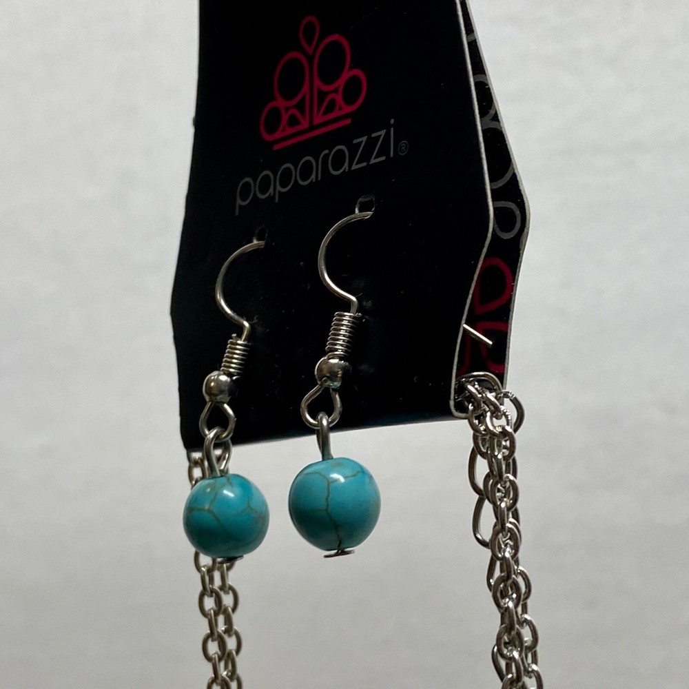 Desert Harvest Blue Fashion Necklace & Earring Set Paparazzi Accessories NWT This ladies fashion Jewelry set is brand new with tags, no noted flaws. Please see all photos as this is the exact item you will receive. Earrings are hook dangles and the necklace is silvertone. Same day shipping Thanks for looking!