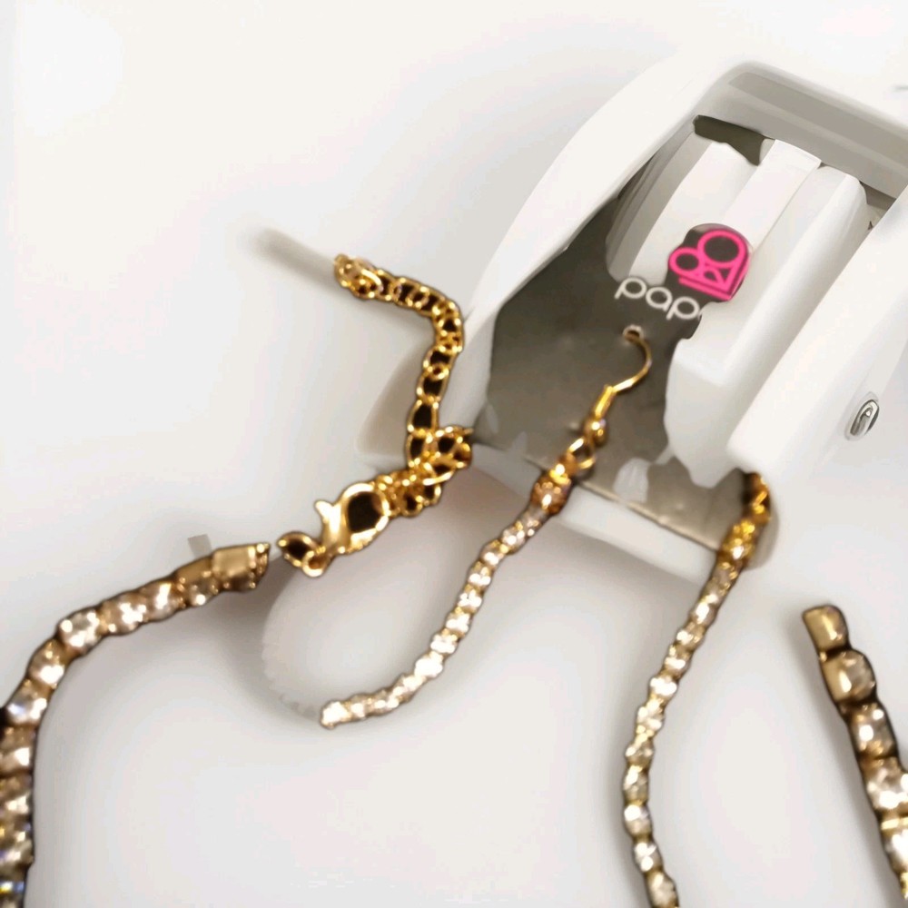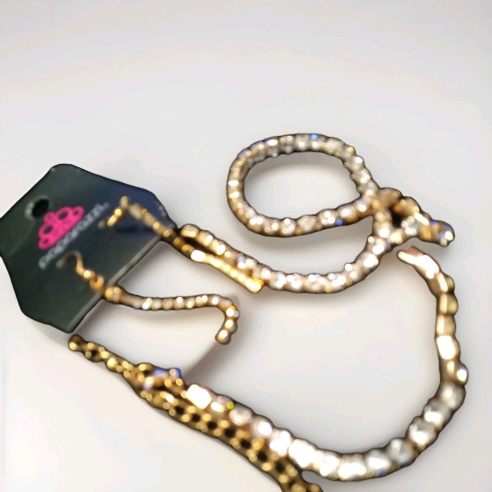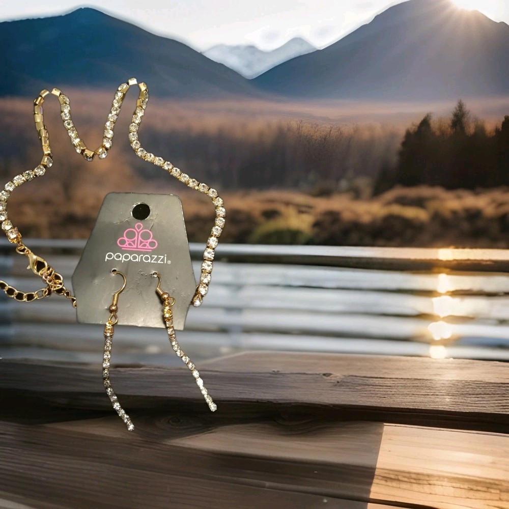 The Paparazzi Jewelry Gold Tone Drop Earring Necklace set features a stunning combination of gold tone and sparkling gemstones, perfect for special occasions like anniversaries and birthdays. The set includes a necklace with iridescent crystals as the main stone, adding a touch of beauty to the overall design. This jewelry set is adjustable and not vintage, making it a versatile and stylish addition to any outfit. Made with materials sourced from China, this set from the Paparazzi brand is sure to make a statement with its elegance and glamour. It intended For 14 yrs and up . Necklace is 16 long with 2" extender Earrings almost 2" with hooks closures.