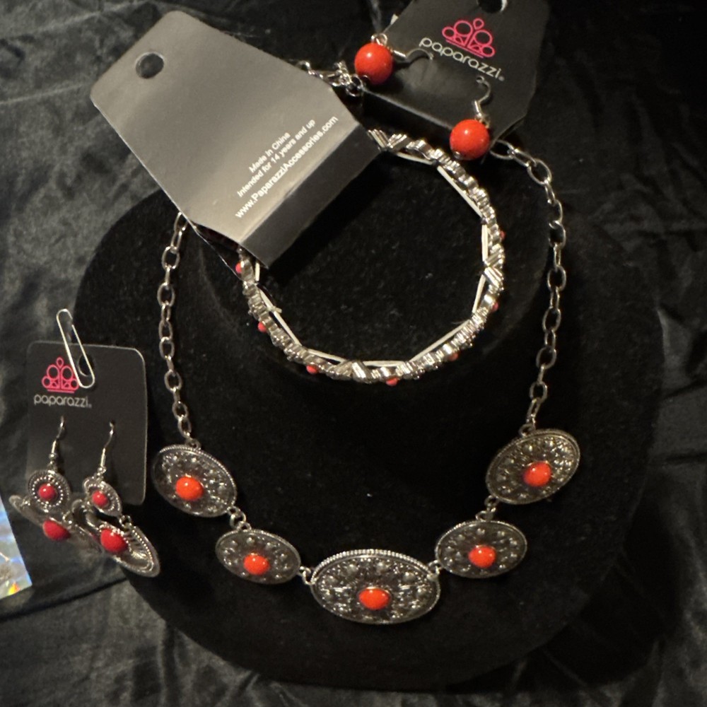 Paparazzi Jewelry Set Beautiful Red & Silver Necklace, Bracelet,Earrings