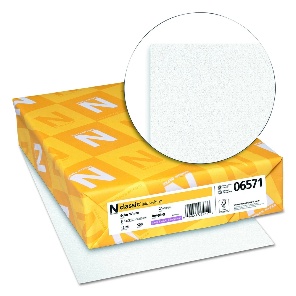 Premium watermarked papers. Guaranteed for use in laser or inkjet printers and high-speed copiers. Acid-free for archival quality. Laid (imaging) finish is reminiscent of handmade papers, providing a great surface background for businesses desiring a more personal appeal. Sold as 1 Ream. Premium watermarked papers. Guaranteed for use in laser or inkjet printers and high-speed copiers. Acid-free for archival quality. Finish is reminiscent of handmade papers, providing a great surface background for businesses desiring a more personal appeal. This product was made from wood that came from a certified managed forest.