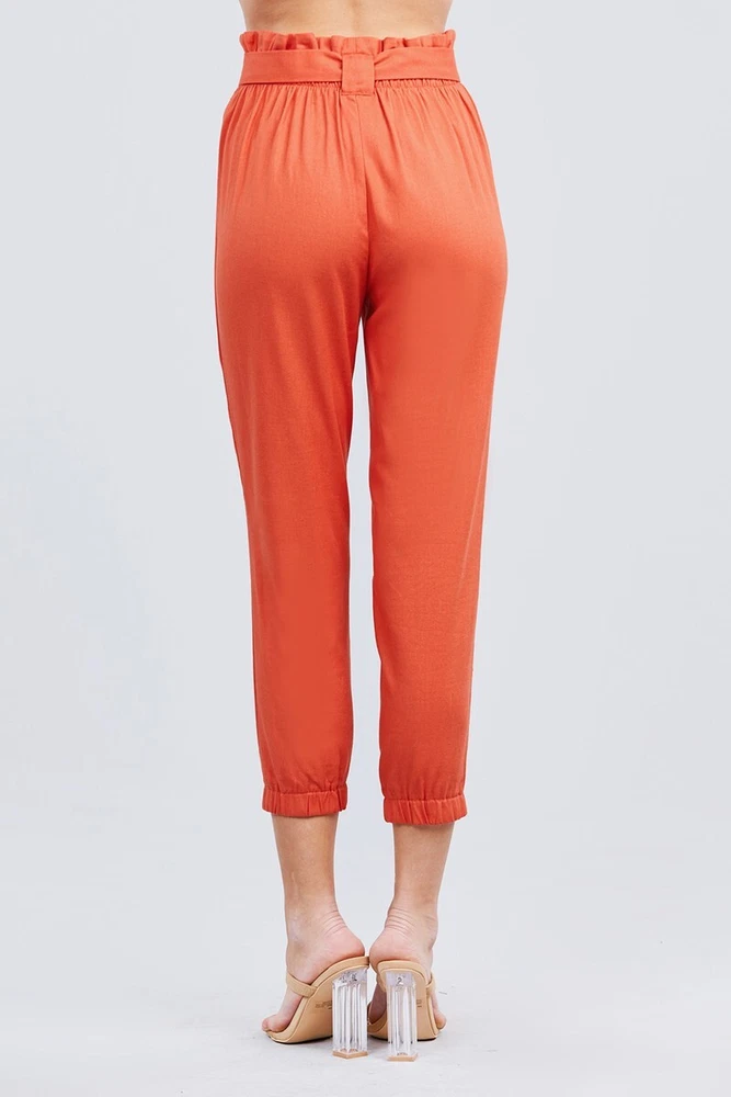 Paperbag W/bow Tie Elastic Hem Long Linen Pants