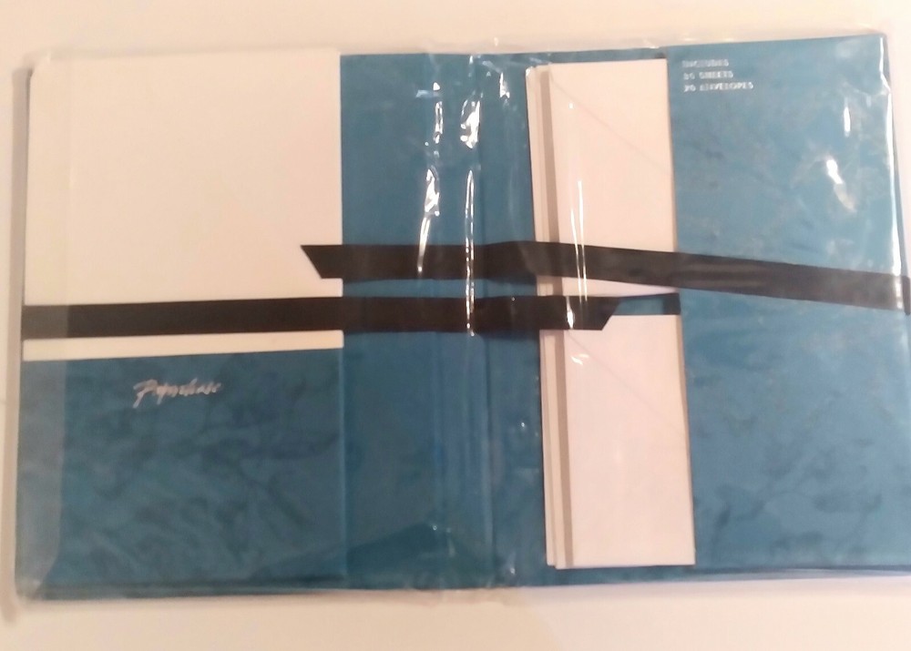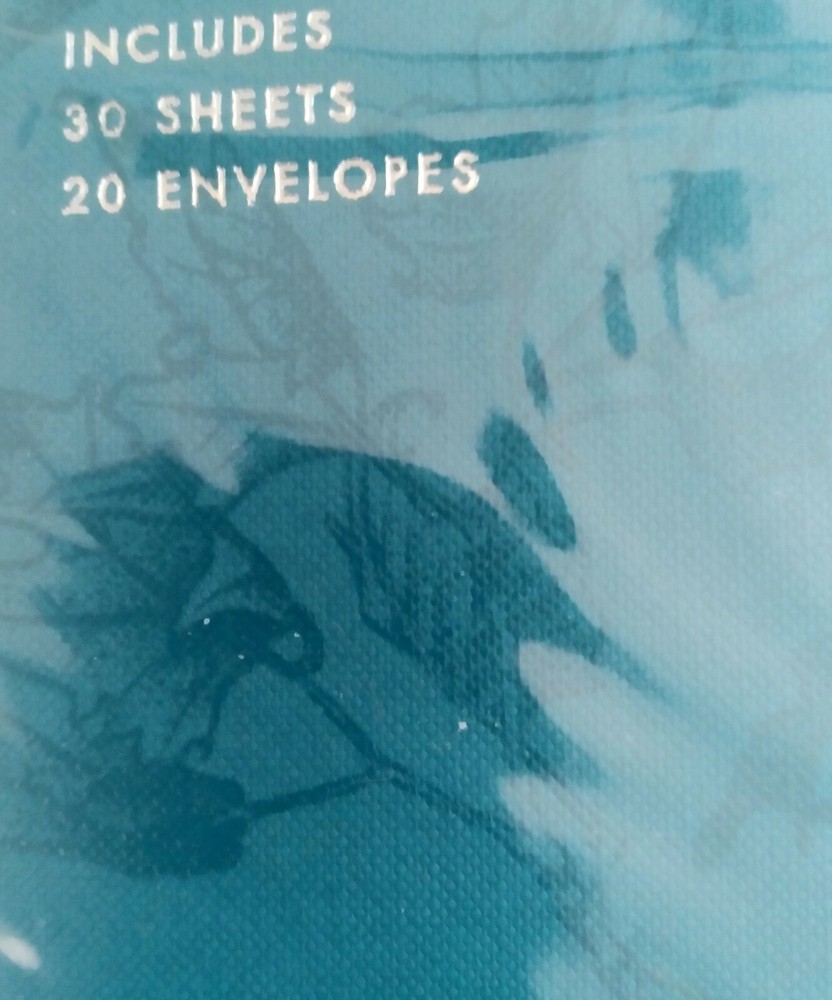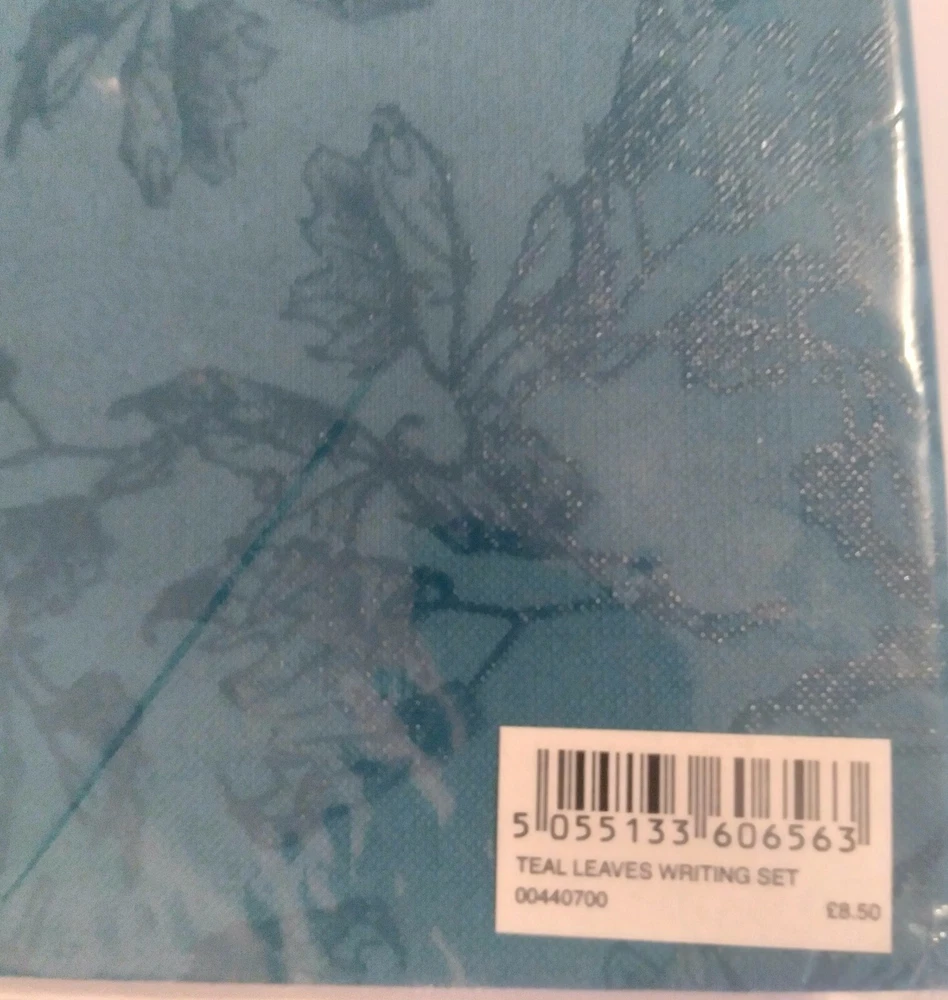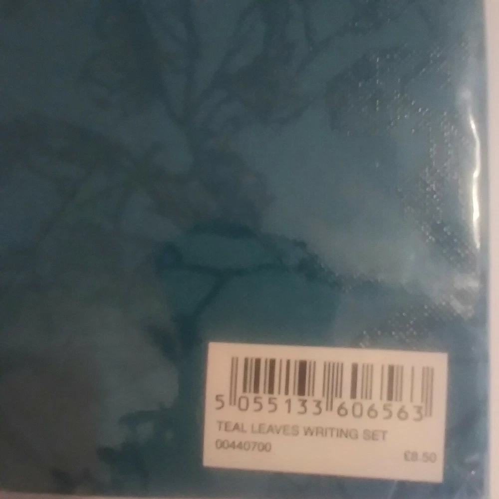 Paperchase Writing Set With Beautiful Holder Teal Leaves New. There are 30 sheets of paper/20 envelopes. The color of the holder is really lovely. This set is perfect for anyone who likes writing notes and letters the old way🙂. I bought this set several years ago while visiting my daughter in London. If you have any questions, please feel free to contact me.