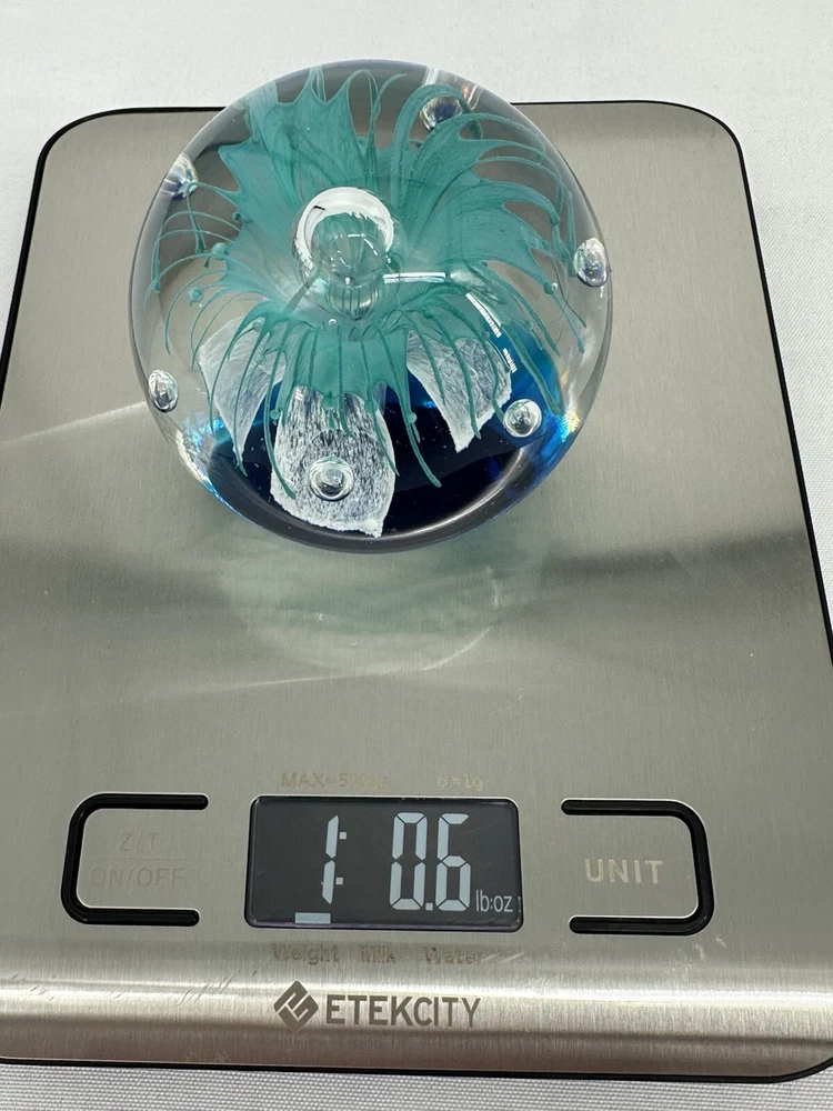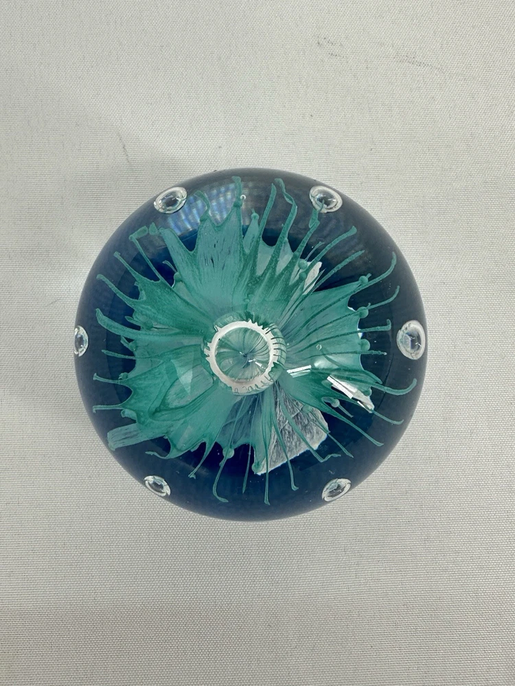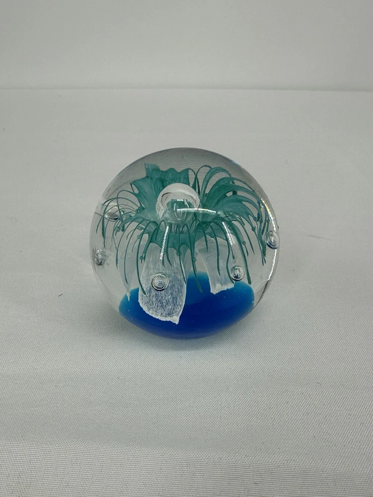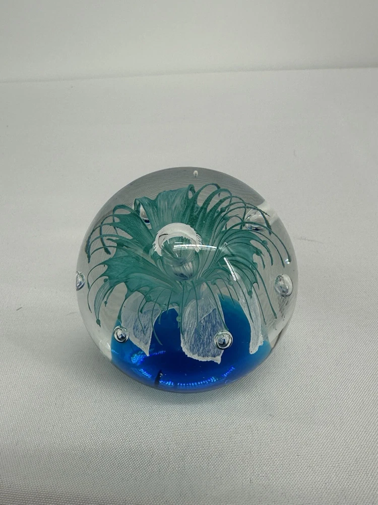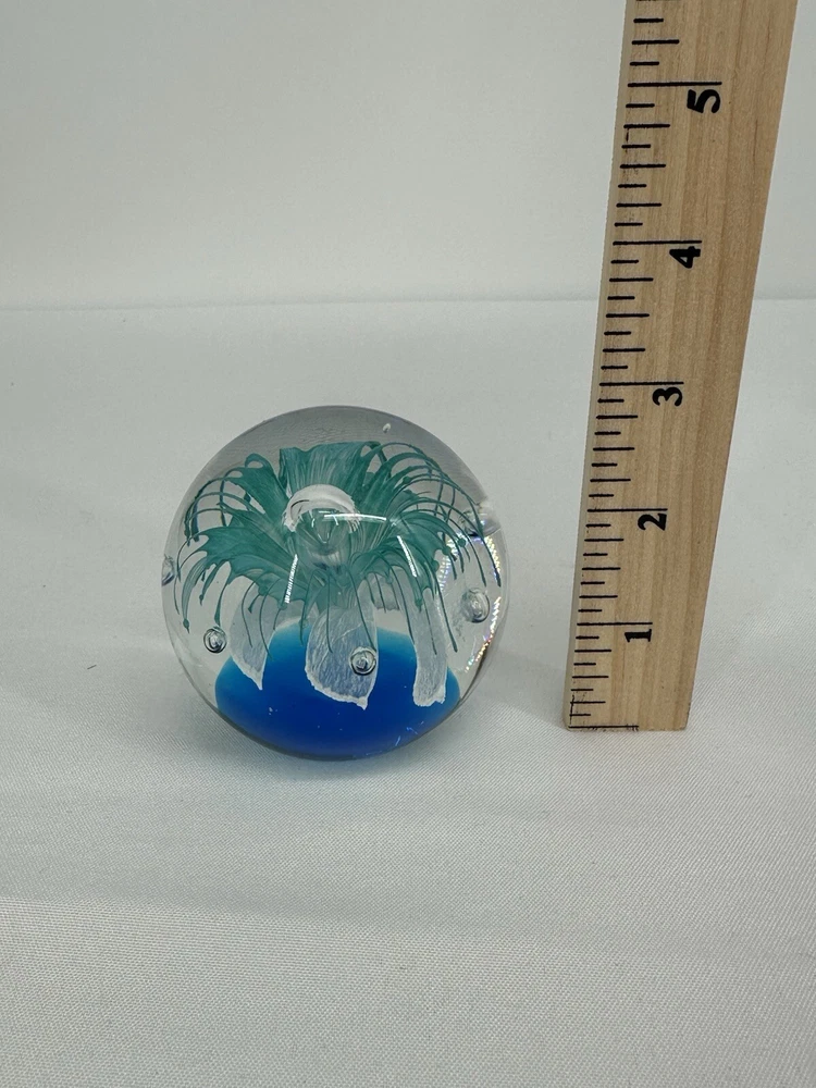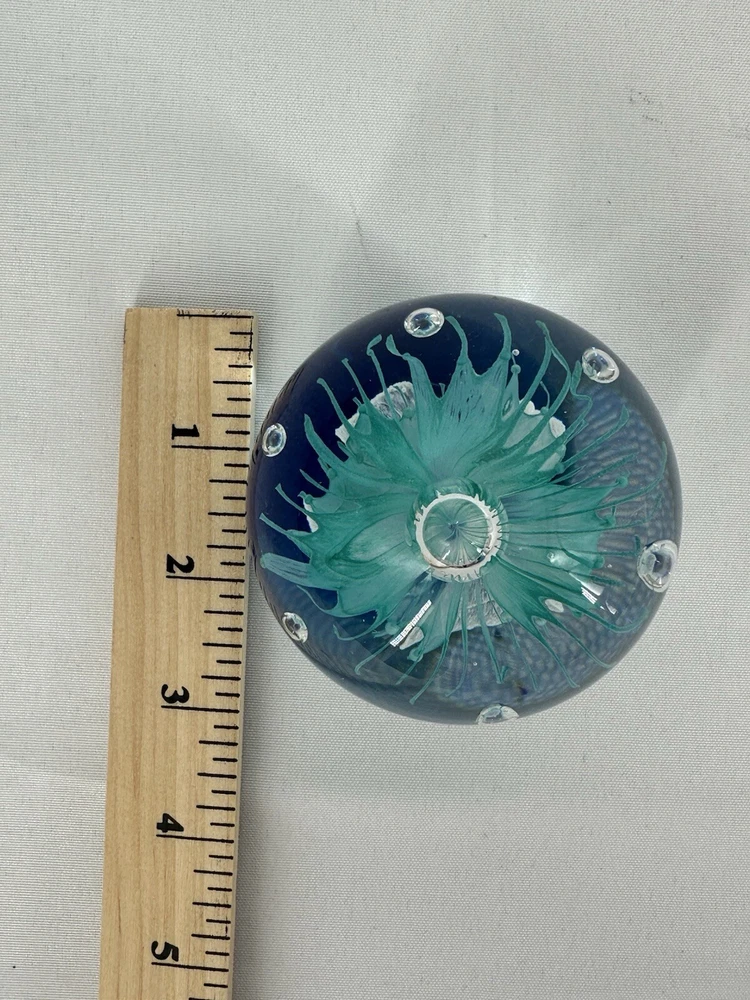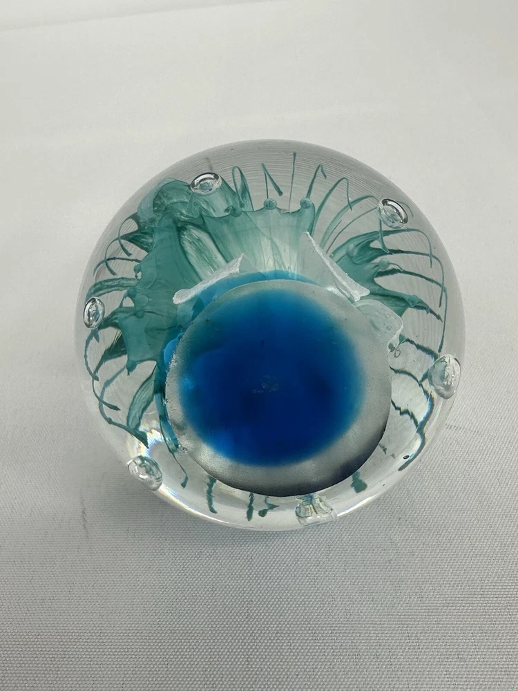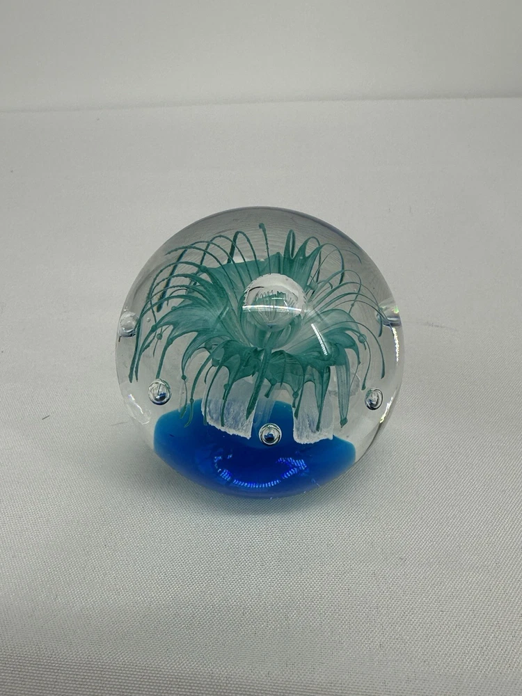 Paperweight Art Glass Sphere With Controlled Bubbles Blue & Clear 3” Jellyfish
