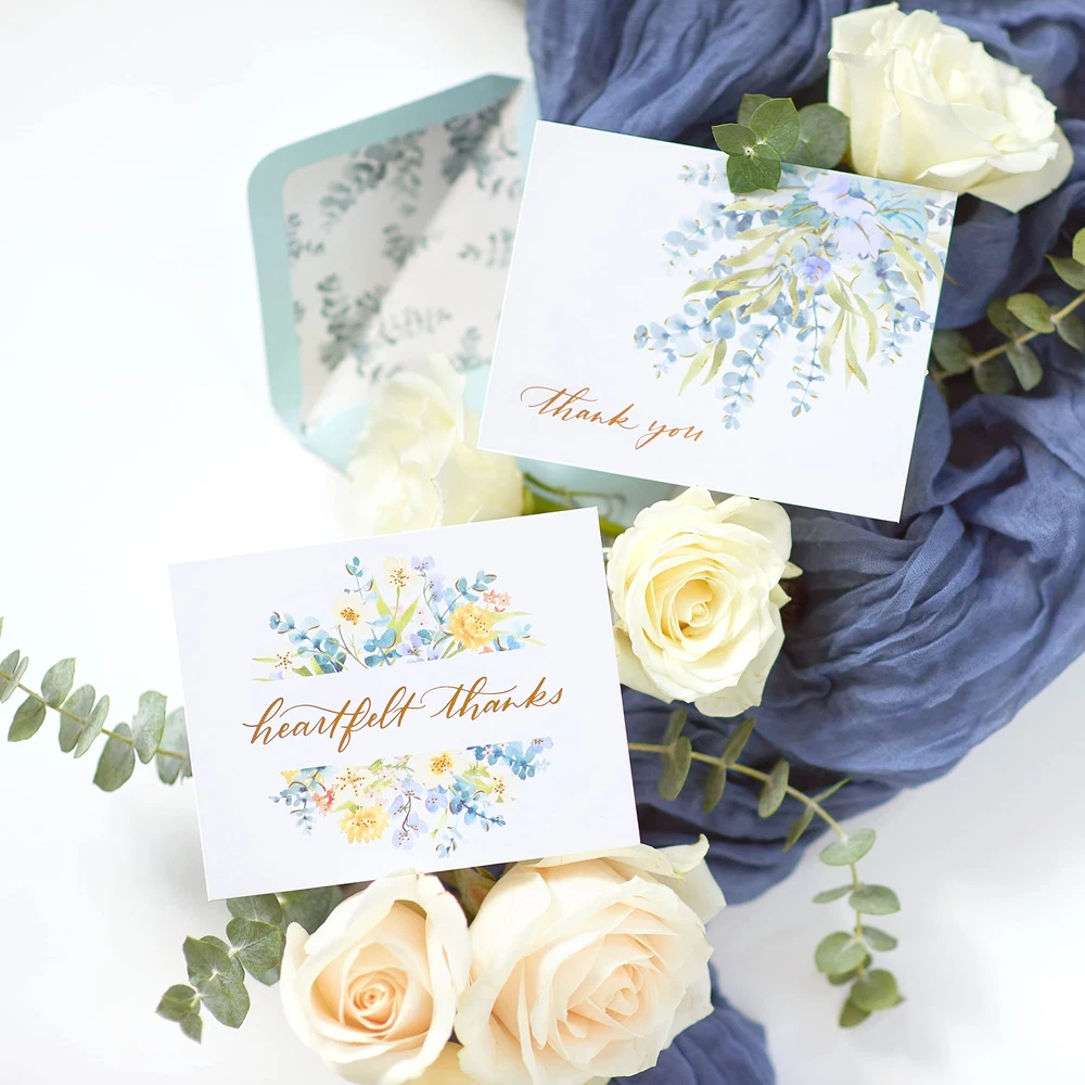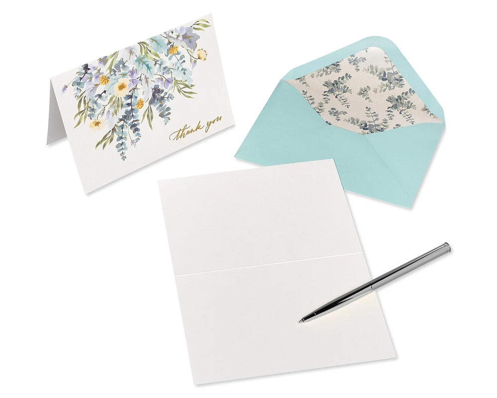 Tell someone you appreciate them with the prettiest thank you card you'll ever see! This premium design from Papyrus features beautiful leaves and flowers in soft shades of green, blue and purple and is embellished with gold foil. “Thank you” is simply stated in gold script beneath the art and the inside of the card is blank so you can add your own personal message of gratitude. They're also perfect for celebrating a happy couple on their wedding day. The lining of the sky-blue envelopes includes a lovely floral leaf pattern that complements the cards. This Papyrus boxed set includes 12 cards, 12 lined envelopes and 12 gold seals. Cards are blank inside for your personal message Papyrus boxed wedding card set includes 12 cards, 12 lined envelopes and 12 gold seals Cards measure 4.125 in. x 5.875 in. Papyrus blank cards with envelopes are perfect for a maid of honor, wedding party, wedding guests or for the newlywed couple on their special day Papyrus offers premium stationery, greeting cards, gift wrap, gift bags and entertaining products for everyday occasions and all holiday seasons--all with unique designs and quality embellishments