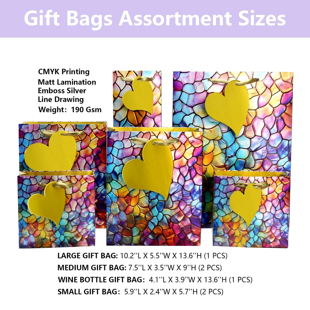 【Value Package】:These vibrant, colorful embossed seashell gift bags come in a variety of cheerful shades, making them perfect for birthdays, weddings, and other celebrations and special Days. The inclusion of handles is a thoughtful touch, making it easy to carry them around, even when filled with goodies. Each bag also comes with tissue paper, adding to the convenience. While they are not the most heavy-duty bags out there, they held up well for lighter gifts and party favors. and having 6 bags and 8pcs tissues in one package is a great deal. 【Exquisite Pattern】:Our gift bag combine exquisite pattern design with handle.It elevates your overall style by incorporate gorgeous elements ,no matter where you went and whatever you did,you always used it. 【Premium Gift bags】:The gift bags provides sturdiness and classfy, you can dress them either up or down depending on your needs. strong enough to accommodate some weight (a book or multiple items). You can use colorful tissue paper to wrap paper for gifts, what is more, you can diy all variety of art works. 【Use Widely】 : These delicate gift bags are suitable for birthday parties, Visting friends, weddings or other celebrations. Also suitable for shopping,wedding bags, party bags, graduations, Holiday, Valentine's Day, Mother's Day, Thanksgiving Day, and more. 【After-Sale Service】:If you have any problem about our product, please with us feel free,we will try our best to solve it for you,your saticfaction is the most motivation that we keep forward.