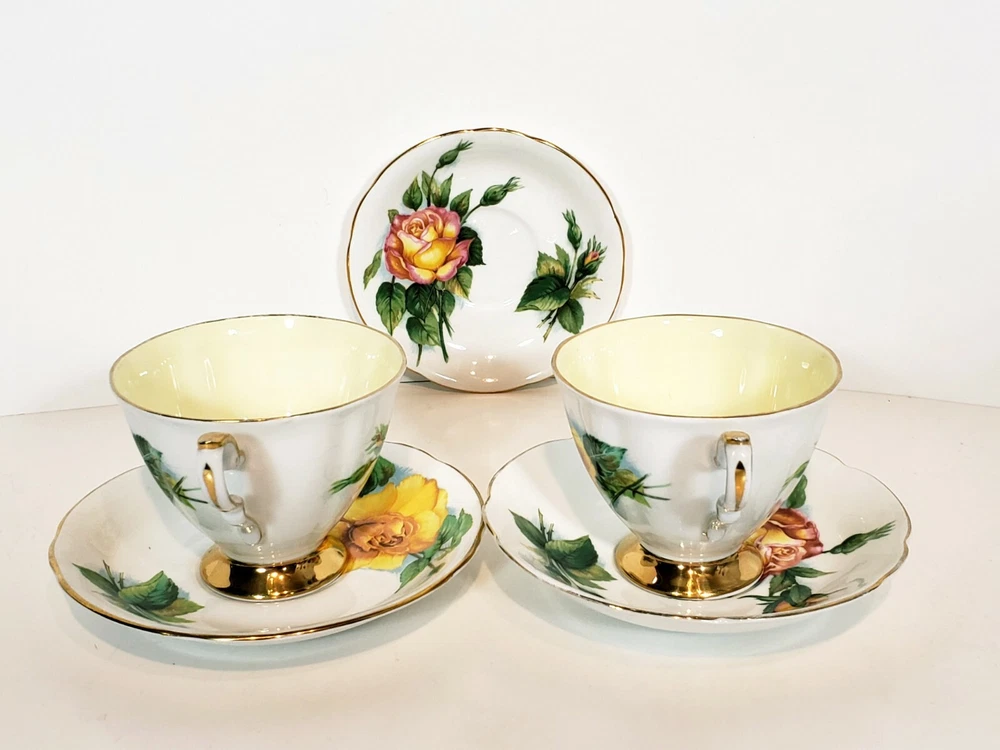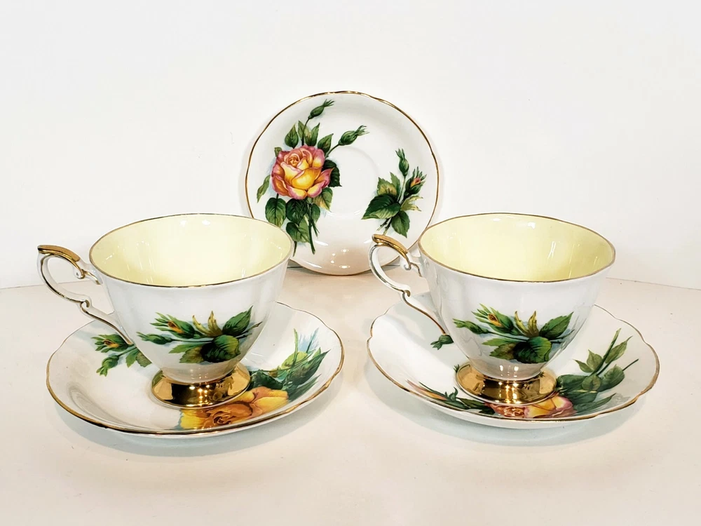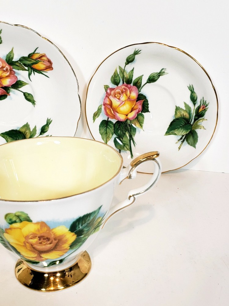 Paragon 5pcs Tea Cups & Saucers Appointment The Queen World Famous Roses. Very nice condition beautiful small mix of two patterns two peace pieces and 3 yellow rose pieces no chips or cracks some gold coloring rubbed off the top of the tea cups and one of the saucers. Two of the larger saucers measure 5 1/2" across the smaller saucer measures 4 3/4" across. Tea cups measure 3 5/16" across 3" tall
