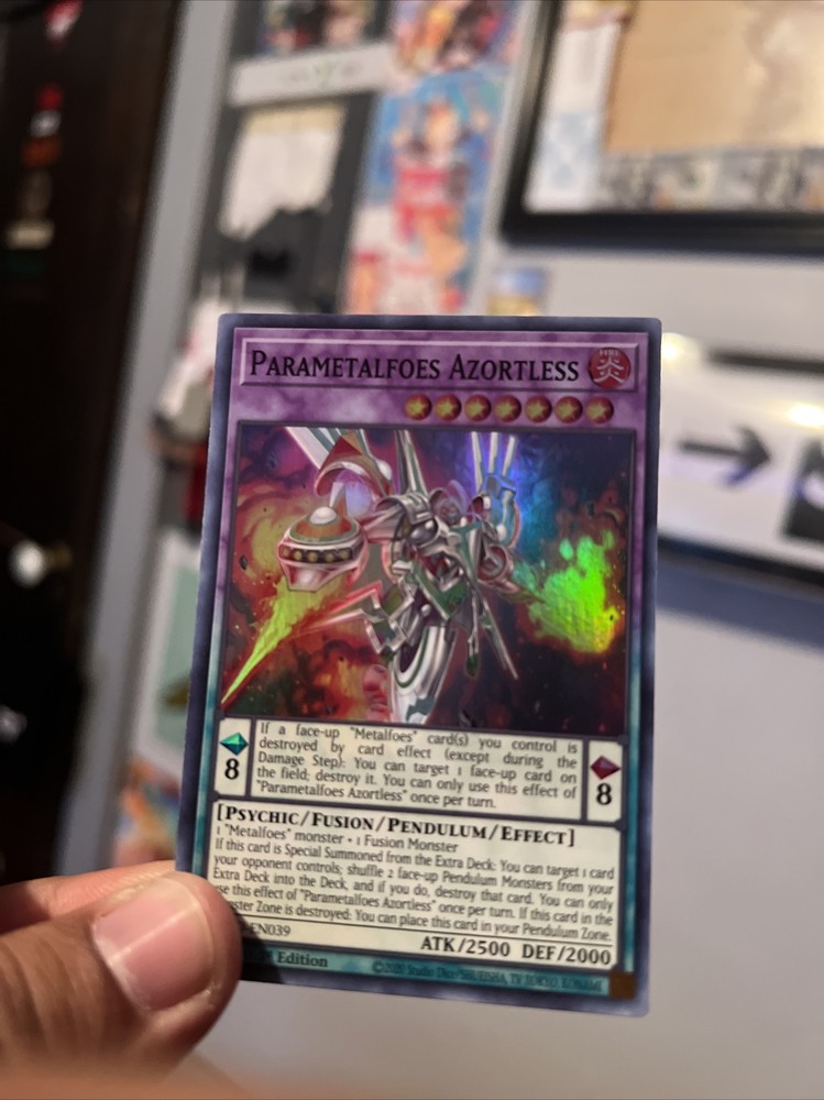 If this card is Special Summoned from the Extra Deck: You can target 1 card your opponent controls; shuffle 2 face-up Pendulum Monsters from your Extra Deck into the Deck, and if you do, destroy that card. You can only use this effect of "Parametalfoes Azortless" once per turn. If this card in the Monster Zone is destroyed: You can place this card in your Pendulum Zone.Creature/Monster Type:PsychicGame:Yu-Gi-Oh! TCGLevel:7Language:EnglishSet:Blazing Vortex