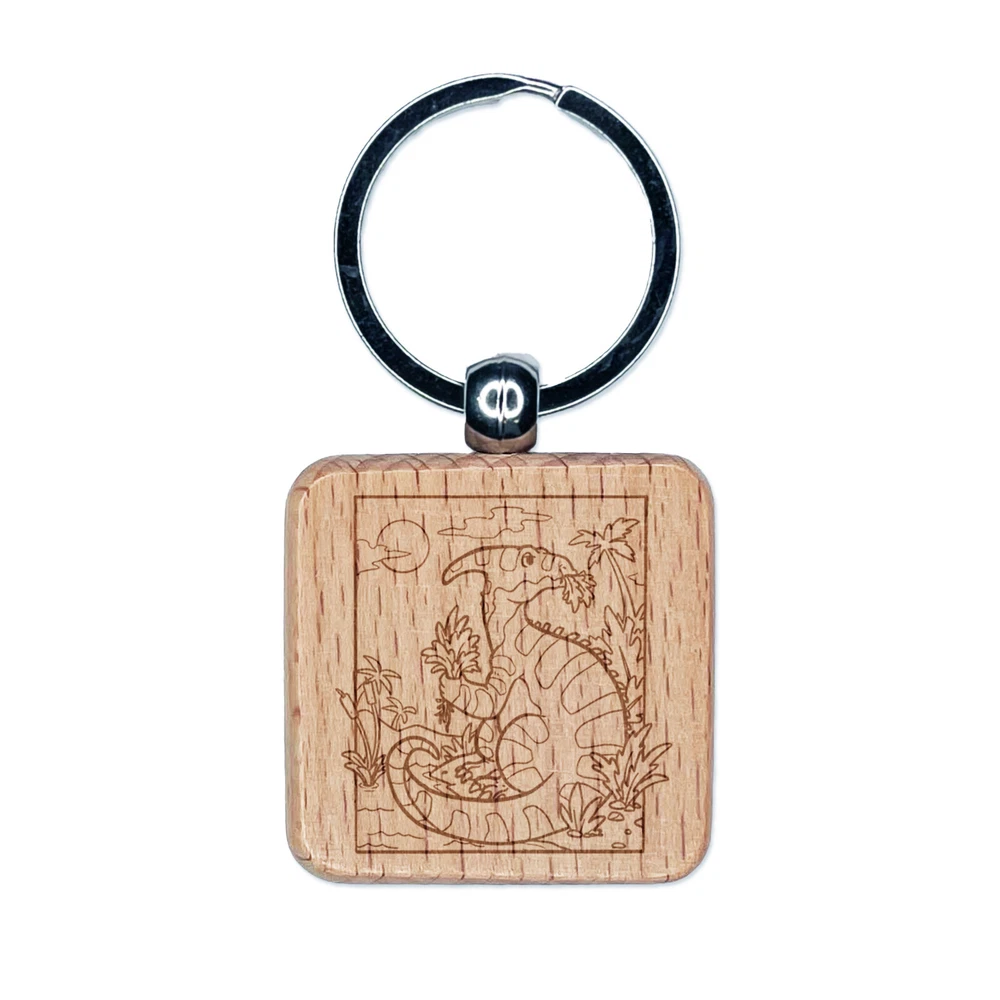 Parasaurolophus Duck Billed Dinosaur Engraved Wood Square Keychain Tag Charm