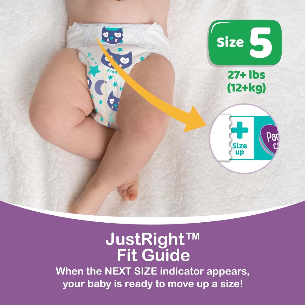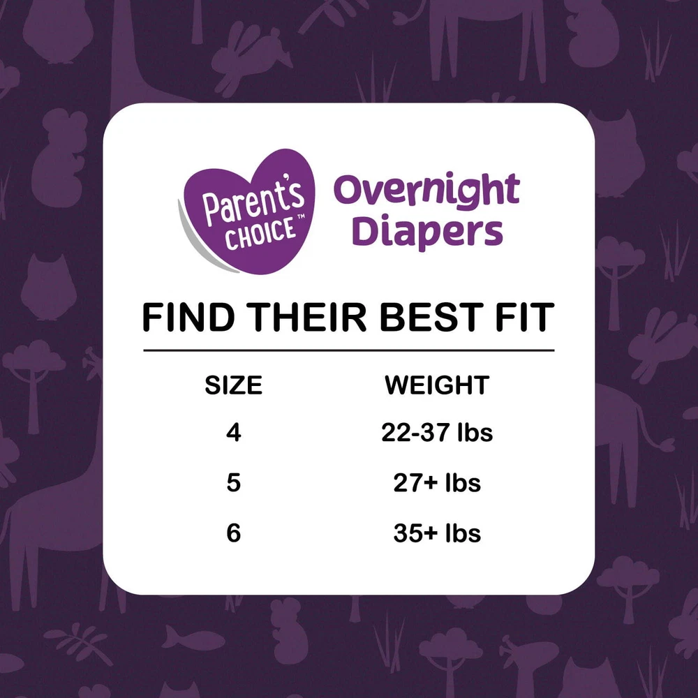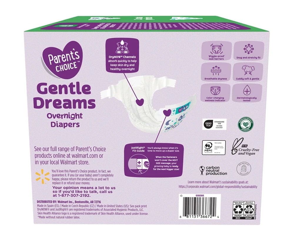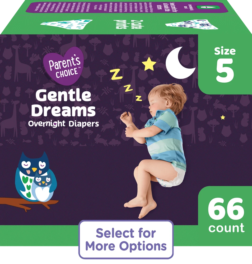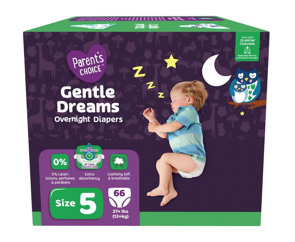 Parent's Choice Gentle Dreams Overnight Diapers, Size 5 66 Pcs Parent's Choice Gentle Dreams Overnight Diapers, Size 5, 66 Count (Select for More Options) Enhanced absorbency for up to 12 hours of nighttime protection Wetness indicator changes from yellow to blue Made from extra-soft breathable materials for ultimate comfort Dermatologically tested Available in 2 stylish and fun prints