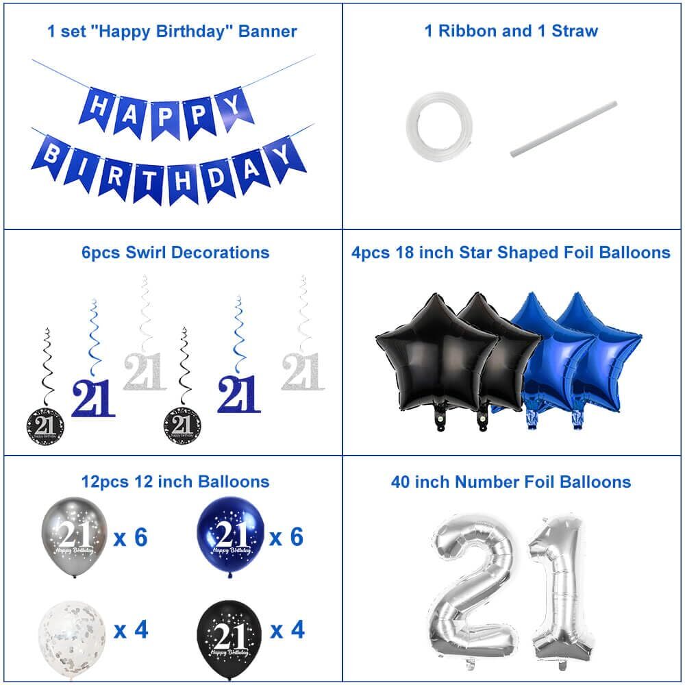 Pargleev 21th Birthday Decorations for Boys Girls, 21th Birthday Balloons with Swirl Decorations Happy Birthday Banner and Star Foil Balloons Confetii Latex Balloons for Party Decorations Silver Silver 21st Birthday Decorations:Our 21st Birthday Party Pack Includes 1pcs 40 Inch Number"21" Silver Foil Balloons,1 Set "Happy Birthday" Banner,4pcs Star Shaped Foil Balloons,20pieces-12 Inch Latex Balloons,6pcs 21st Swirl Decoration Glitter Silver,1 Set 10m Ribbon. Happy memories: Silver balloon will make the party memorable and goes well with your party, Which will make a memorable and special party that neither your or your guests will ever want to forget ! Easy to Use: It's easy to assemble and decor,you could hang the banners and swirl decor on the ceiling, mount on the wall or window, decorate the party as you wish. The latex balloons and confetti balloons and bunting banner perfectly reuse for your other improtant festival celebration, such as wedding, graduation,bridal shower decorations, navy blue baby shower decor. Quality Party Decorations: We are committed to provide quality satisfaction birthday decor. These foil balloons and latex balloons are safe and non-toxic, strong and long lasting,support helium or air. They can maintain inflated state for a long time. Pls kindly NOTE: the number foil balloons and other foil balloons can not be overfilled. Customer Satisfactory Solution: If you aren't satisfied with our birthday decoration sets for any reasons, please contact us by email, we hope to make it correct. Silver 21st Birthday Decorations:Our 21st Birthday Party Pack Includes 1pcs 40 Inch Number"21" Silver Foil Balloons,1 Set "Happy Birthday" Banner,4pcs Star Shaped Foil Balloons,20pieces-12 Inch Latex Balloons,6pcs 21st Swirl Decoration Glitter Silver,1 Set 10m Ribbon. Happy memories: Silver balloon will make the party memorable and goes well with your party, Which will make a memorable and special party that neither your or your guests will ever want to forget ! Easy to Use: It's easy to assemble and decor,you could hang the banners and swirl decor on the ceiling, mount on the wall or window, decorate the party as you wish. The latex balloons and confetti balloons and bunting banner perfectly reuse for your other improtant festival celebration, such as wedding, graduation,bridal shower decorations, navy blue baby shower decor. Quality Party Decorations: We are committed to provide quality satisfaction birthday decor. These foil balloons and latex balloons are safe and non-toxic, strong and long lasting,support helium or air. They can maintain inflated state for a long time. Pls kindly NOTE: the number foil balloons and other foil balloons can not be overfilled. Customer Satisfactory Solution: If you aren't satisfied with our birthday decoration sets for any reasons, please contact us by email, we hope to make it correct. Shipping from the USA All of our products are shipped from the USA, ensuring quick delivery to your destination. Payment We offer the following payment methods: PayPal, credit card, bank transfer, and eBay's secure payment system. Free Shipping & Free Returns Shipping within the USA is FREE. Additionally, any return is absolutely free for you. Risk-Free Purchase You have the option to return an item within 30 days without any justification. We cover the return shipping costs! Fast Shipping We ship immediately upon receipt of payment. Generally, the package is delivered within 2-3 days in the USA. If it takes longer, we will contact you. Quality and Costs Made in Europe, USA, China No customs fees or additional charges Total satisfaction guarantee Invoice with declared VAT available upon request in .pdf format Feedback Your feedback is very important to us. After you pay for your purchase, you will automatically receive positive feedback from us.