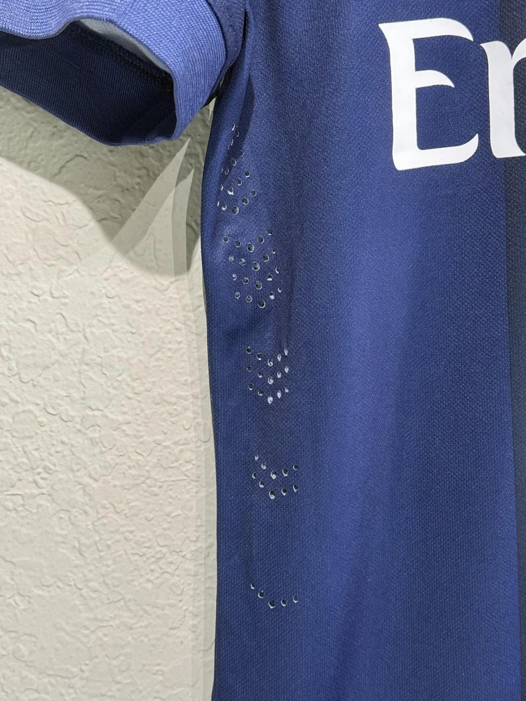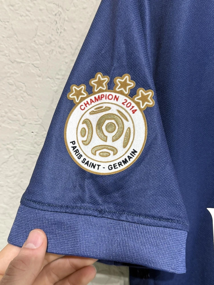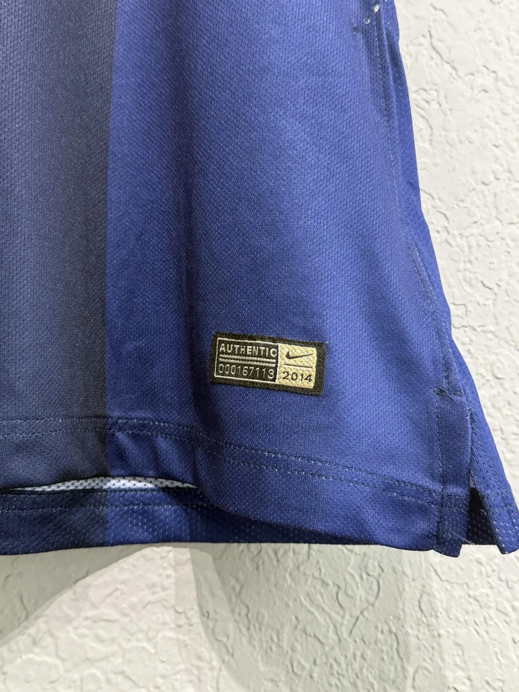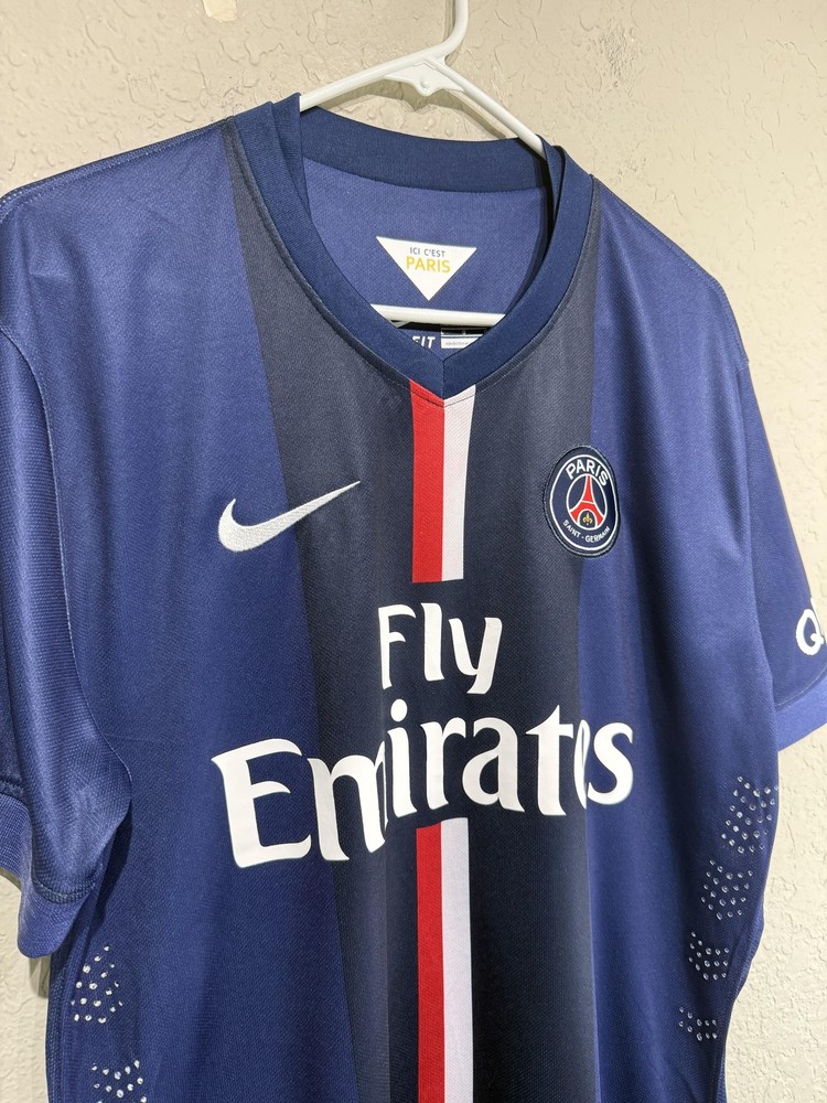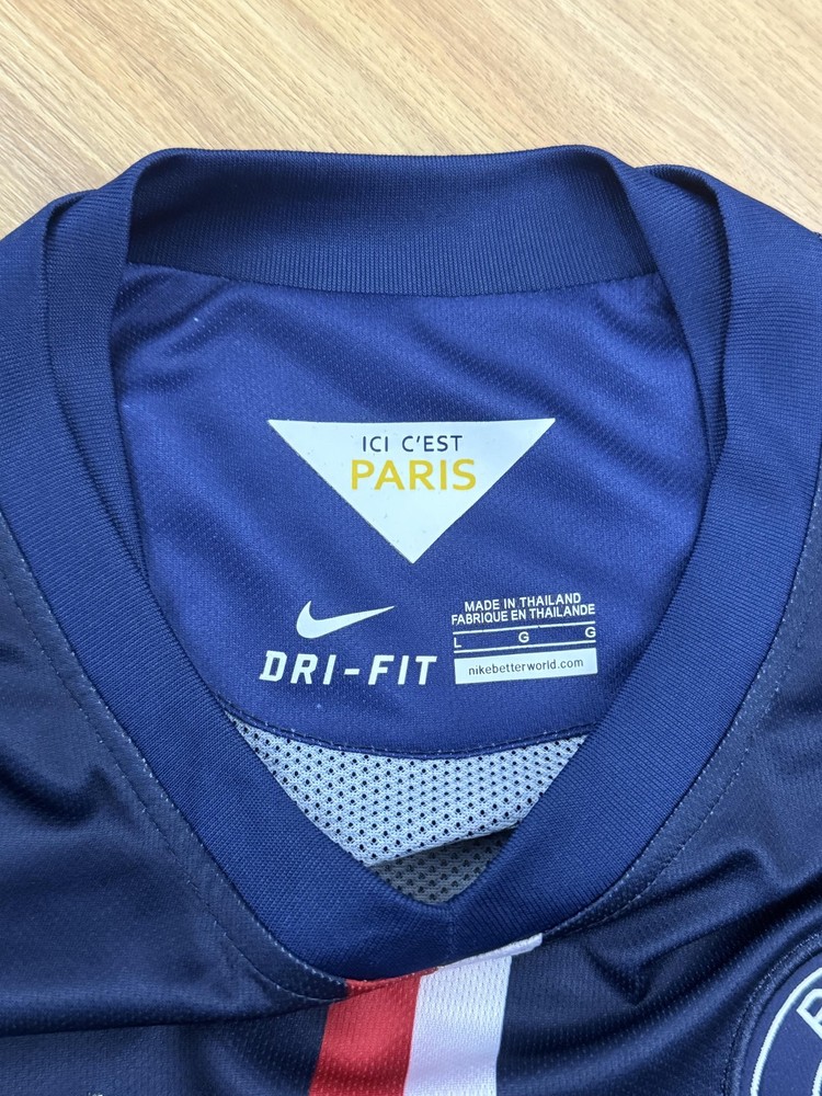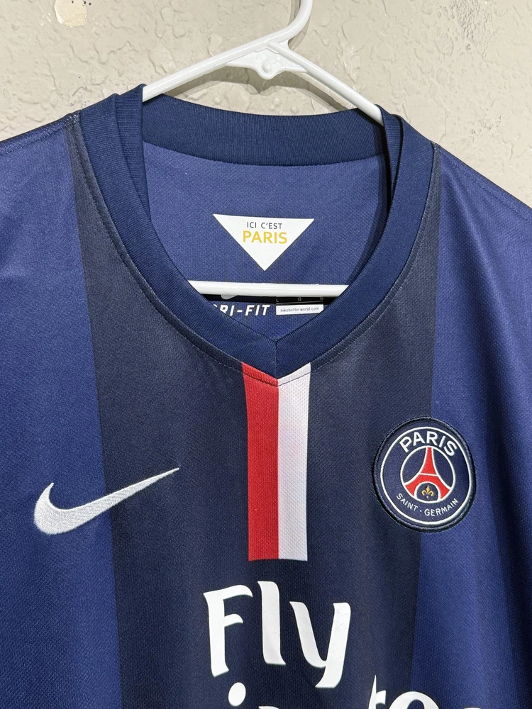 Brand: Nike Team: Paris Saint-Germain (PSG) Style: Authentic home soccer jersey with Zlatan Ibrahimovic name and number 10 on the back, central red and white vertical stripe, short sleeves. Season/Year: 2014-2015 with Champion 2014 Ligue 1 badge on sleeve. Color: Navy blue with darker navy striping and red and white accents. Size on tag: Large Materials: 100% polyester Dri-FIT performance fabric with mesh inner lining and laser-cut ventilation holes at the sides. Country of manufacture: Made in Thailand. Front details: Embroidered Nike Swoosh and PSG crest, Fly Emirates sponsor print, ICI CEST PARIS inner neck detail, authentic Nike 2014 jock tag with serial 000167113, Dri-FIT logo near hem. Back details: Ibrahimovic name set and large 10 with LFP logos, Ooredoo sponsor print, vertical red and white stripe. Additional sleeve detail: QNB sponsor print on one sleeve, Champion 2014 Paris Saint-Germain badge on the other. Inner tag codes: SU131204SYS, style code 479302-620. UPC: 826215900061