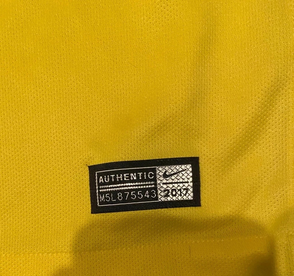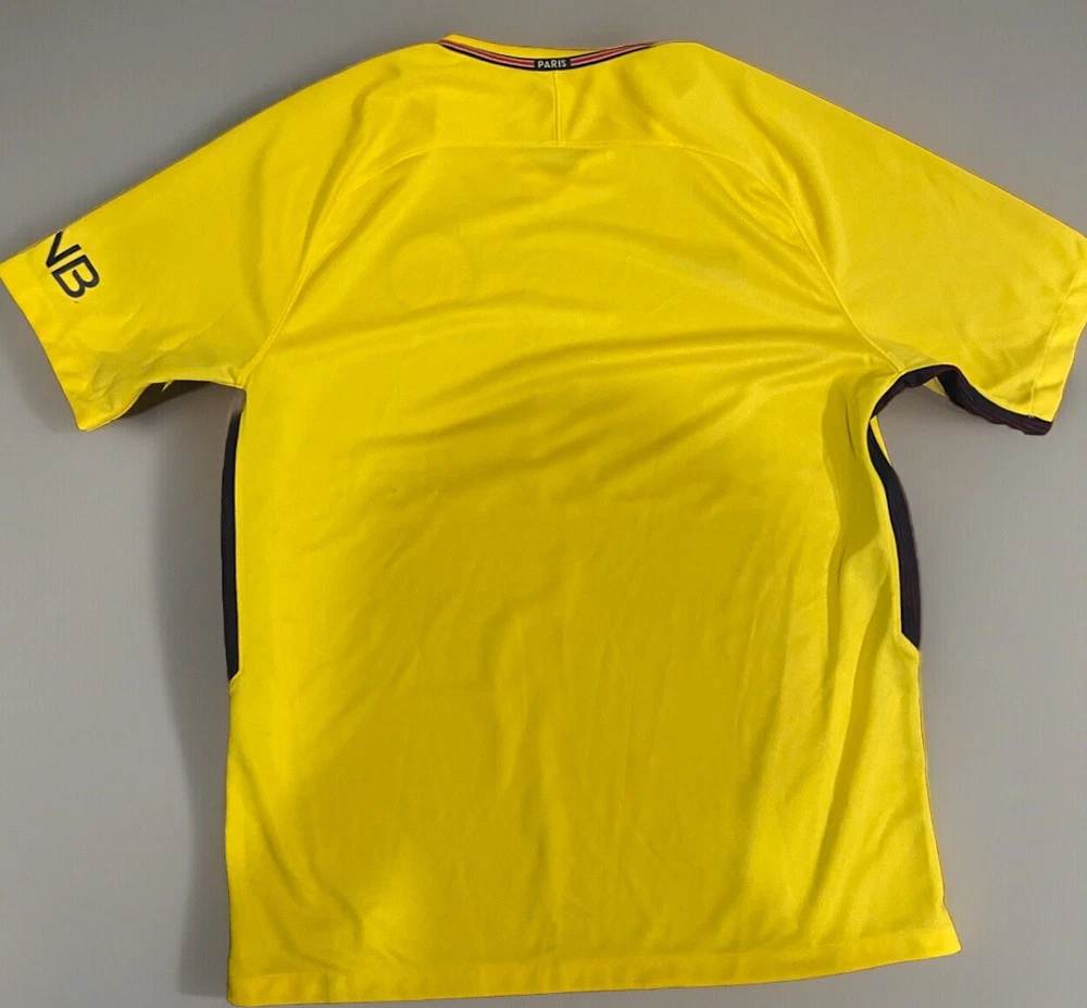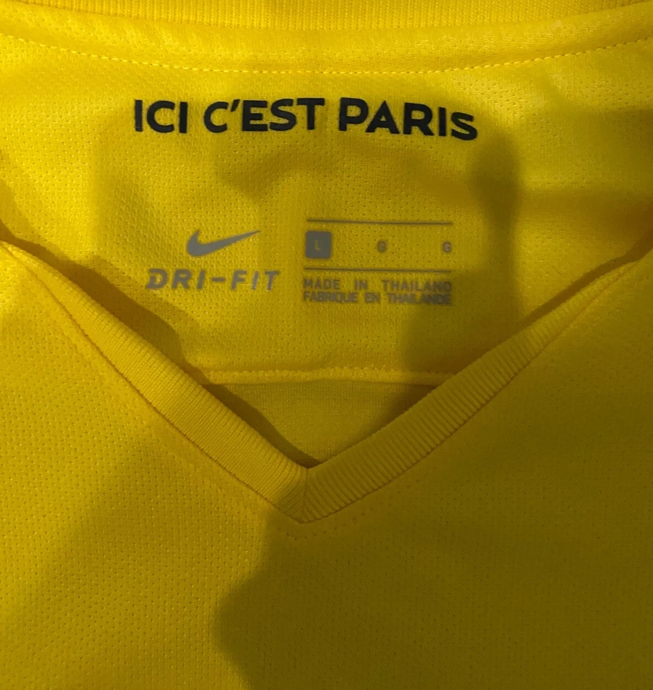 Product: Jersey Brand: Nike Sport: Soccer Color: Yellow Gender: Men Event/Tournament: 17/18 Ligue 1 Size: L Team: Paris Saint-Germain Country/Region of Manufacture: Thailand Officially Licensed: Yes