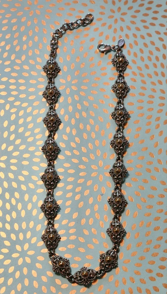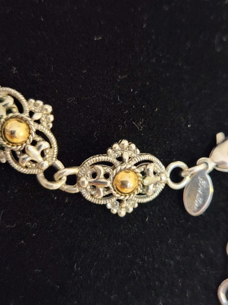 The Park Lane Signed Gold Silver Two Tone Necklace is a stunning piece of fashion jewelry handcrafted in the United States. This choker-style necklace features an adjustable closure and a gorgeous combination of gold and silver tones, making it perfect for all occasions. With its art deco-inspired design and retro theme, this necklace adds a touch of elegance and sophistication to any outfit. Signed by the renowned brand Park Lane, this masterpiece showcases quality craftsmanship and attention to detail.