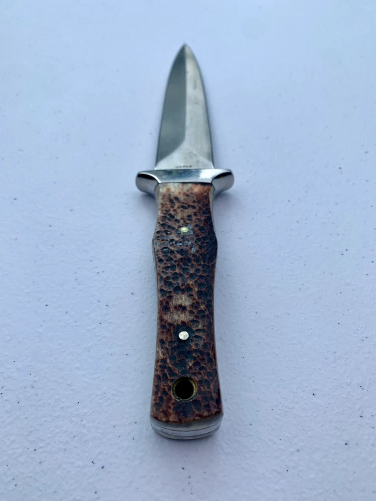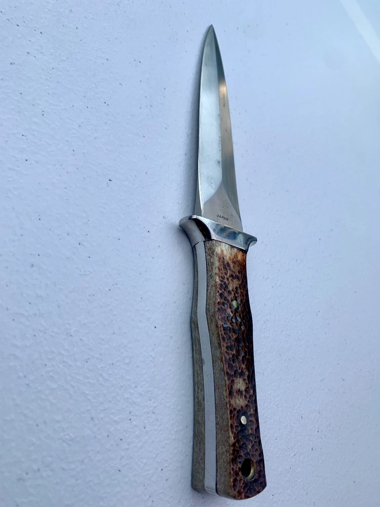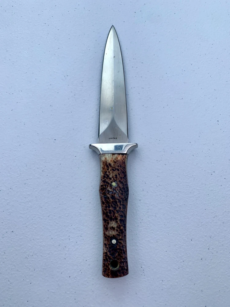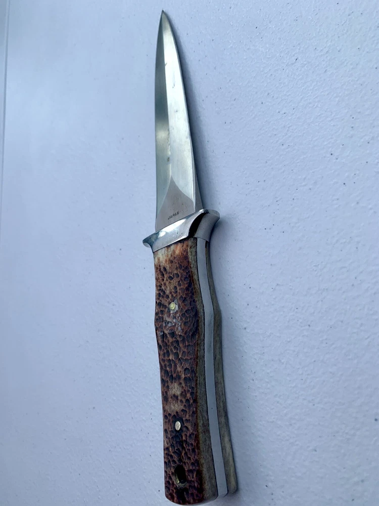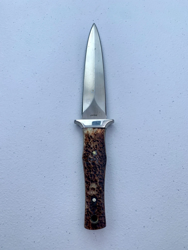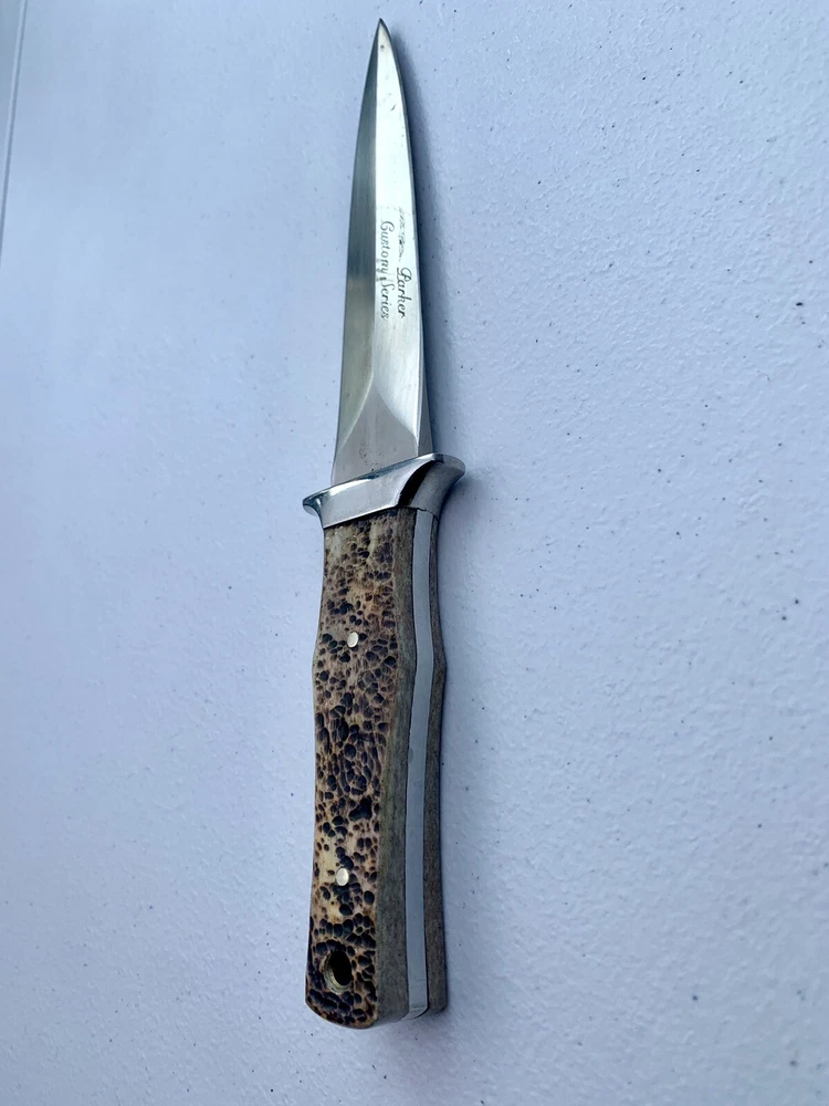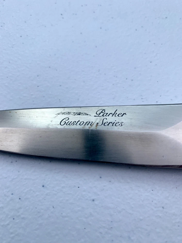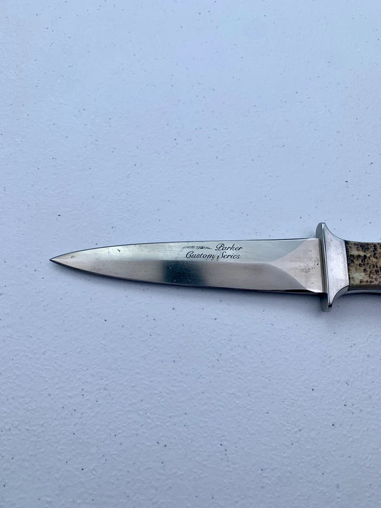 Parker Cutlery Company Custom Series fixed blade dagger knife. This is a knife sale only. There is no box/sheath. Knife measures 9”in overall length, blade length is 3-7/8”. Blade etched with Parker, eagle logo and Custom Series. Opposite side of tang stamped with Japan. Nickel bolster and pins and bone handles. This knife is in excellent condition and has never been carried or used. Knife has been securely kept in private collection for many years. B1-0645