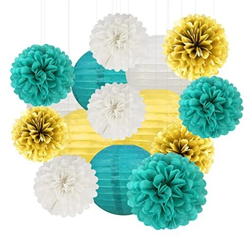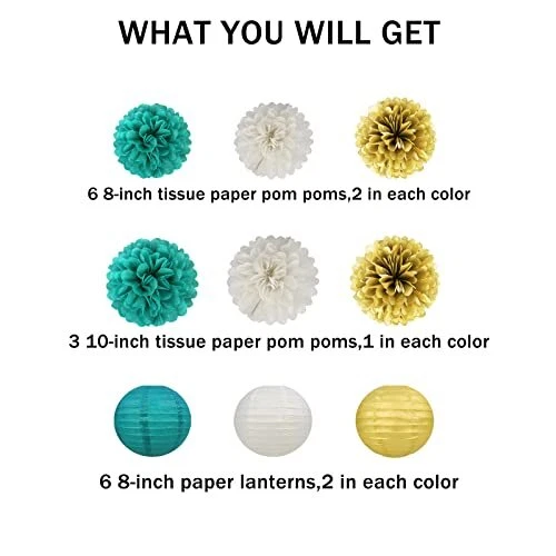 Return Policy Fast Delivery Trusted seller White Gold Teal Party Decorations – 15Pcs Tissue Paper Flowers Pom Poms Paper Lanterns for Women Birthday Party Decoration Baby Shower Bridal Shower Bachelorette Engagement Product Description 【Package Contains】The white gold and teal decorations kit include 6pcs 8inch paper lanterns.9pcs tissue pom poms,6psc 8in,3pcs 10in,in 3 color of white gold and teal. 【USing Scene】Made of high quality paper , the materials are non-toxic ,Environmental friendly, safe , but inedible. Hanging them up in walkways ,hallways ,tree branches ,on the ceiling. 【Wide Range Of Occasions】The Decoration kit perfect for teal birthday decorations, birthday decorations for women , women birthday decorations, turquoise party decorations baby shower decorations , wedding decorations, bridal shower decorations, bachelorette party decorations, etc. 【DIY crafts】The tissue paper pom poms and paper lantern need to assembled. It will take about some times, please diy them in advance. 【Quality Guarantee】IF you have any questions about white teal and gold party decorations ,please feel free to contact us,we'll make it right for you Shipping Returns Payment Shipping Shipping is FREE to all addresses other than APO/PO boxes in the lower 48 states. All our stock ships from US-based warehouses. Shipped via USPS or UPS (depending on location and package weight) Unless stated otherwise, all orders will ship within 24-72 hours of your payment being processed. Check our feedback to see the great reviews of FAST shipping we offer. Returns Seller does not accept returns Payment We currently accept payment via eBay managed payments only. Once payment is cleared, we will dispatch your shipment within 1-3 business days. Please refer to the "Shipping" tab for more information regarding shipping speed to your destination.