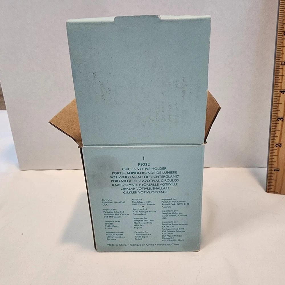 The Party Lite Circles Votive Candle Holder P9232 is a small, clear glass candle holder featuring a circle pattern. It is designed for parties and comes in its original box for easy gifting or storage. With dimensions of 2.75 inches in height and 2.5 inches in width, this decorative piece is ideal for creating a cozy ambiance with votive candles. The PartyLite brand ensures quality and style in this single candle holder pack.
