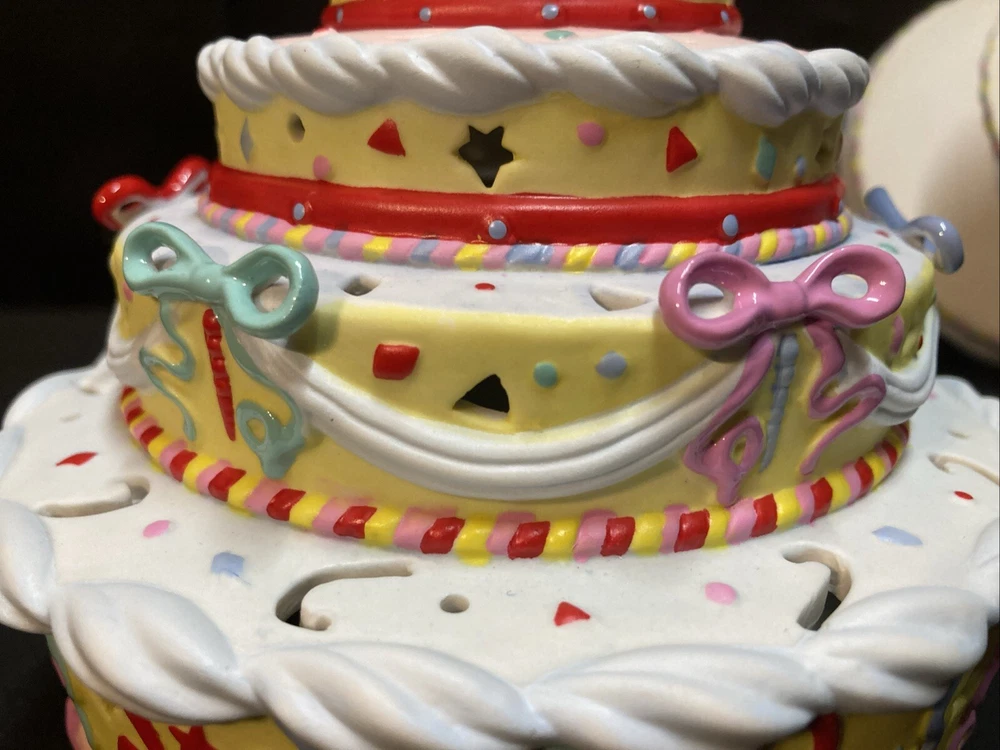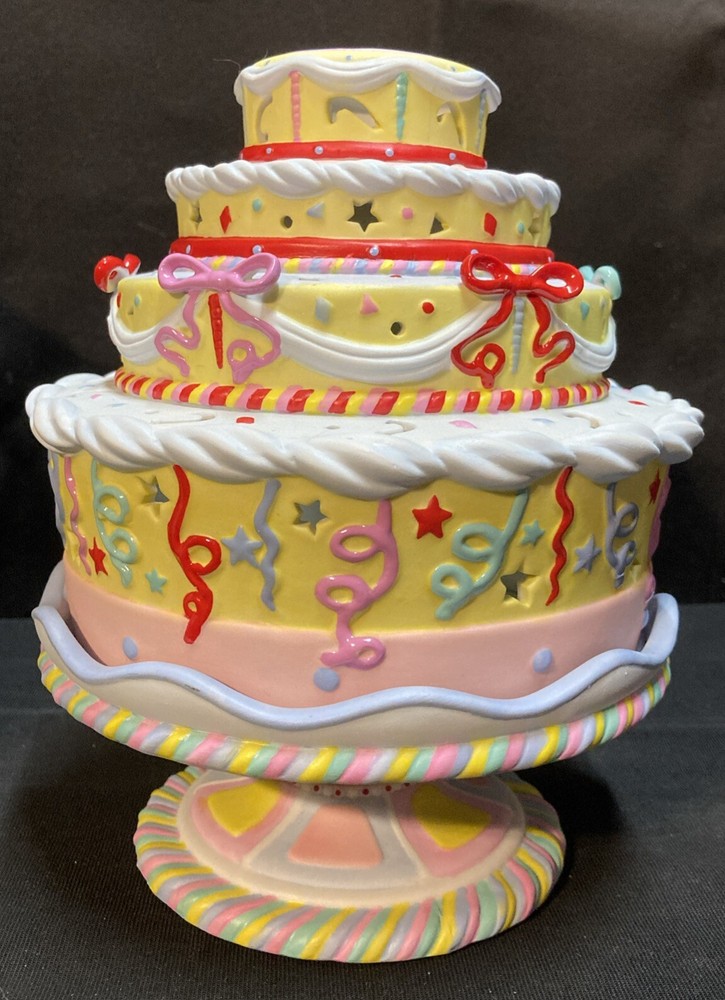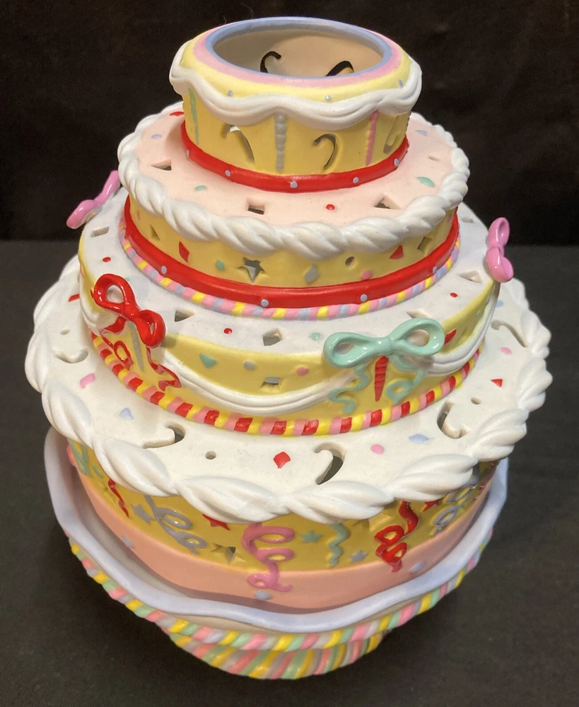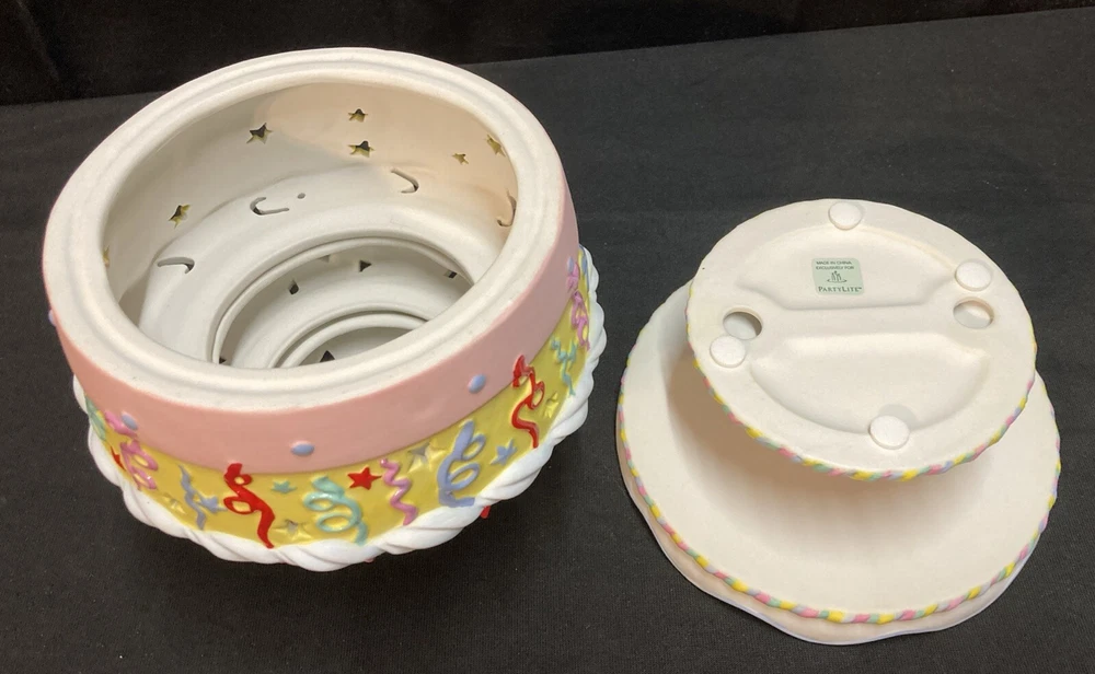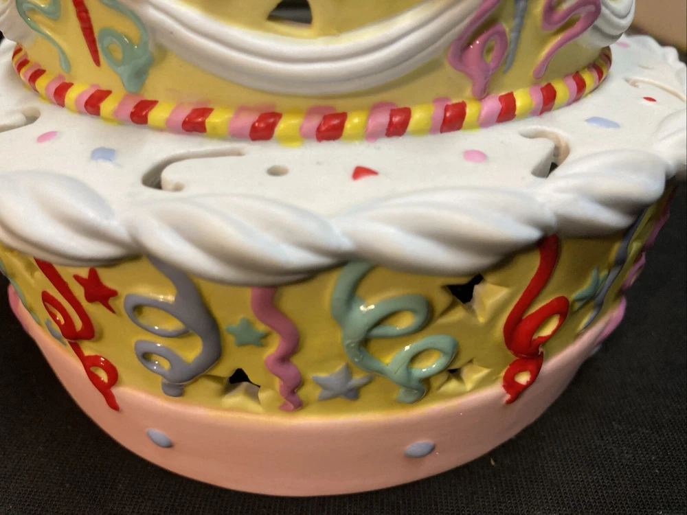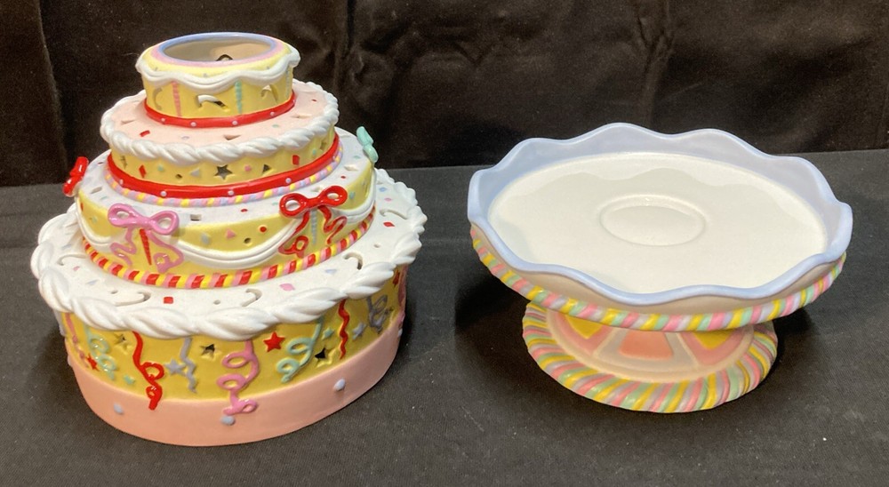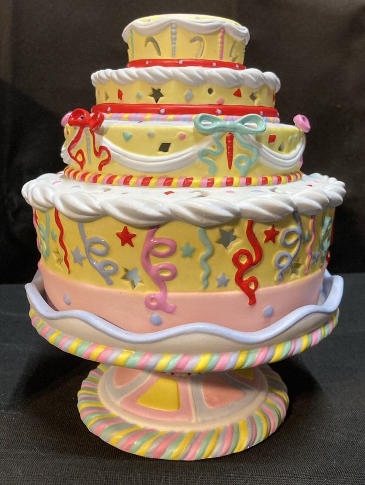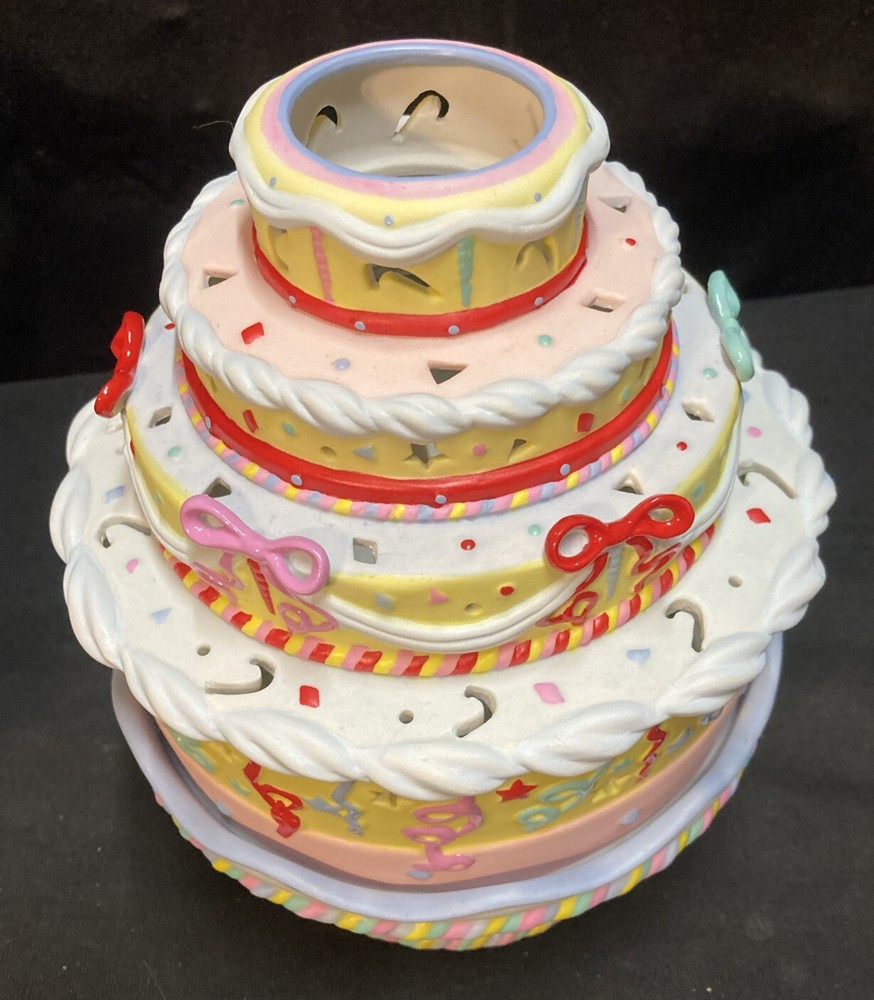 Occasion: Birthday Color: Multicolor Material: Ceramic Item Height: 7.5 in Item Length: 7.5 in Brand: PartyLite Modified Item: No Model: Cake Tealight Holder Subject: Birthday Type: Candle Holder Features: Retired Country/Region of Manufacture: China Theme: Celebrity