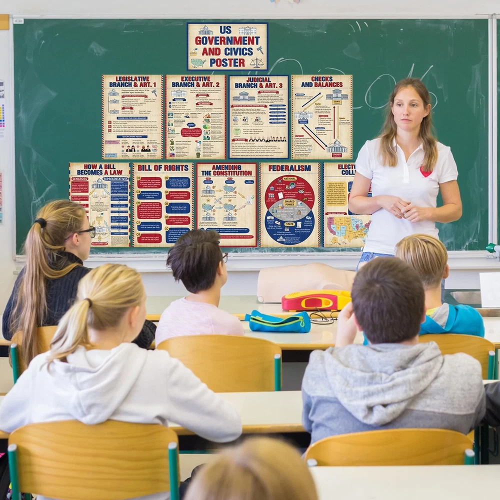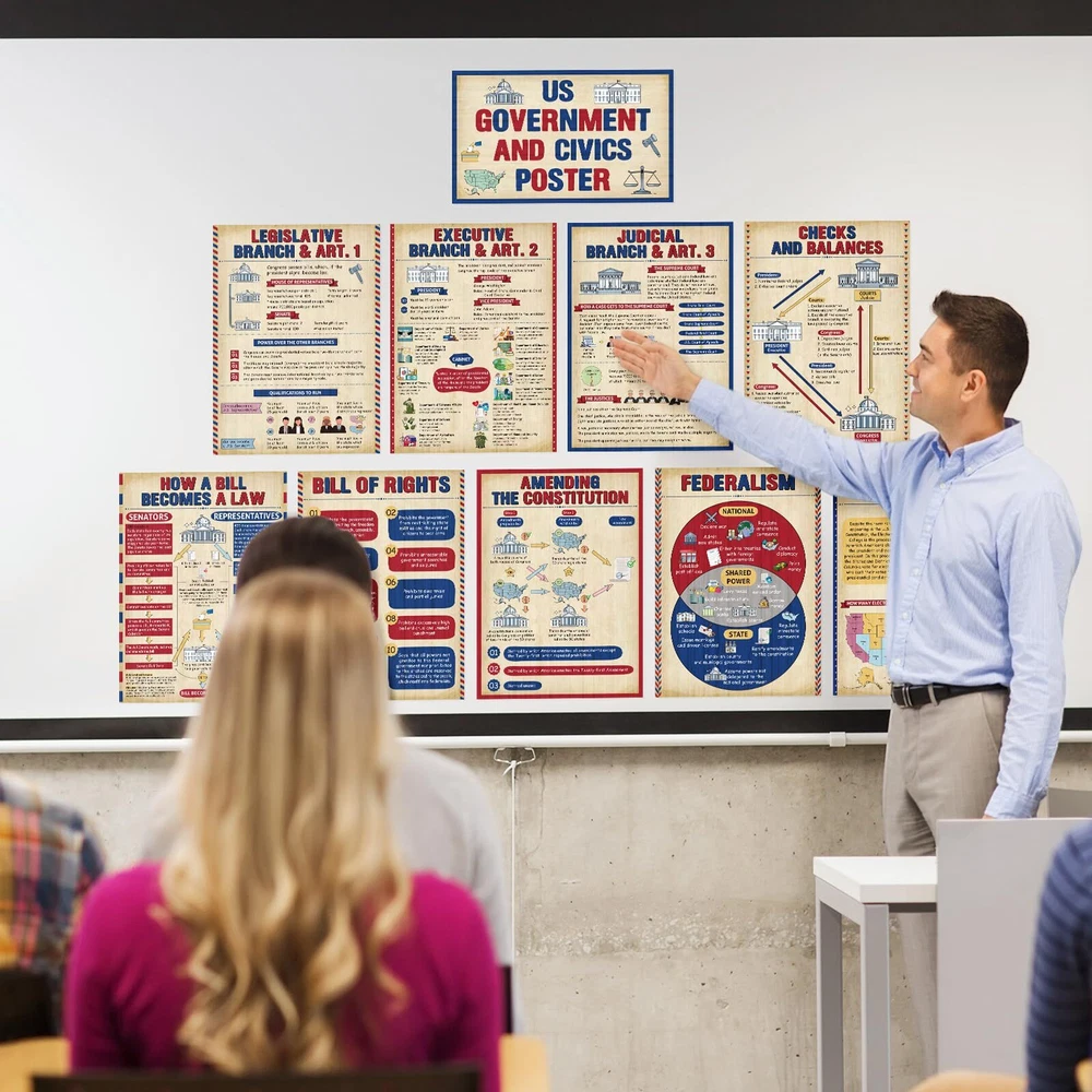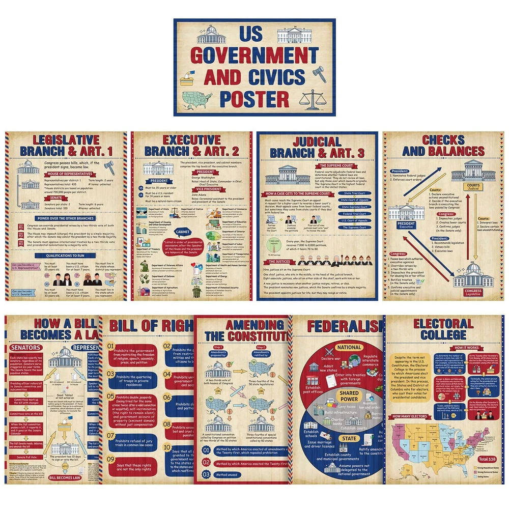 Features: The title of the US government and civics poster is large and clear, so there is no need to worry about students not being able to see it clearly, allowing students to remember it more deeply and understand it more intuitively. This US government classroom posters set teaches children about how the US government works and is suitable for school social education needs, social room decoration or home education needs. Specifications: Material: paper Color: multicolor Size: social studies poster measures about 13.8 inches x 9.8 inches, and the title poster measures about 7.9 inches x 13.2icnhes Package includes: 1 x Title Poster, 9 x Social studies posters Notes: Manual measurement, please allow slight errors on size. The color may exist a slight difference due to different screen displays. What You Get: uS government posters Includes 1 Title Poster, 9 social studies posters such as: legislative Branch, Executive Branch, Judicial Branch, Checks and Balances, Amending Constitution, Electoral College, and more, 60 adhesive points; Their beautifully designed, colorful pictures are eye-catching and will easily capture students' interest Durable Materials: each social studies poster measures 13.8 inches x 9.8 inches, and the title poster measures 7.9 inches x 13.2icnhes; Made of quality paper and waterproof membrane, our social studies classroom decorations are reusable, tear-resistant, and easy to clean Outstanding Design: these US government and civics poster bulletin board decorations are designed to fit the theme; Social studies educational posters are visually appealing to inspire their interest in social studies and can help increase students' interest in social studies while reviewing any key information they have learned School Educational Supplies: ideal for educational supplies and craft supplies, these social education posters are designed to enhance students' understanding of different US government and civics and cultivate knowledge acquisition skills; Dispensing glue helps you easily display them on classroom walls, home, tutoring areas and even toy rooms Wide Application: these government posters for classroom can be applied as classroom decoration and teaching tools, you can use them to decorate walls, bulletin boards or other places where students can easily recognize them, helping them learn and understand history, citizenship and government, they are also The nice gift to support middle high school students, families, and teachers in their learning journey