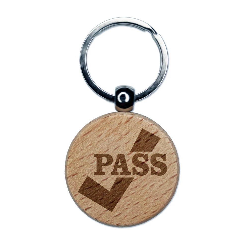Pass Checkmark Teacher Engraved Wood Round Keychain Tag Charm