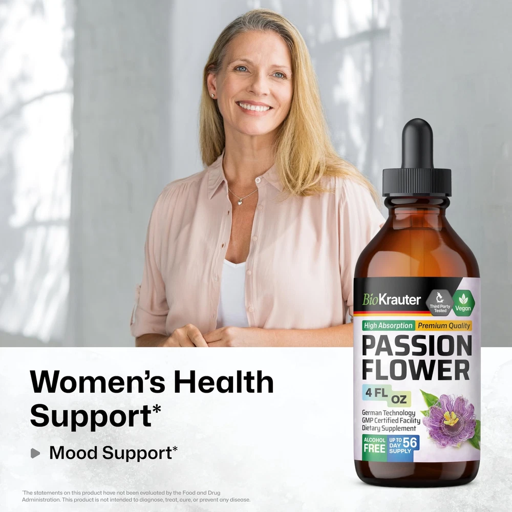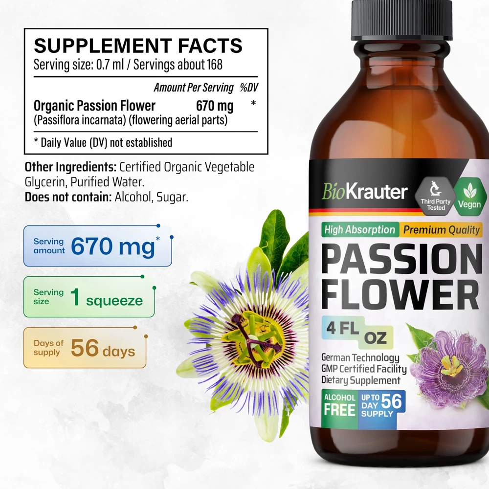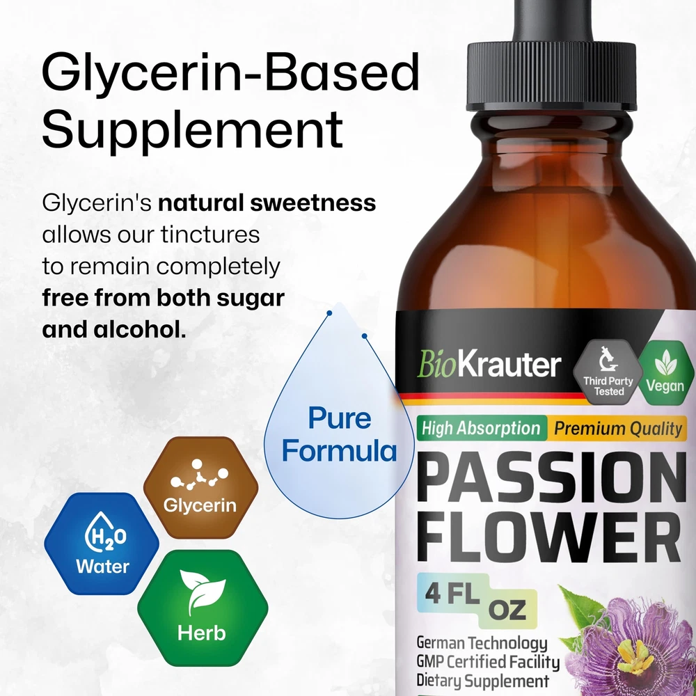 BioKrauter’s passion flower tincture distinguishes itself with unrivaled bioavailability, convenience, efficacy, and purity. This organic and vegan is a beacon of pure, safe, and natural means for achieving mood and support. Produced in a GMP-certified facility, our liquid passion flower extract undergoes meticulous third-party testing to ensure it stands as a premium quality . In contrast to passion flower tea, the liquid form of our tincture enables a faster and more comprehensive absorption of the beneficial compounds inherent to passion flowers. This efficiency positions it as a right choice over both tea and capsule forms. BioKrauter strives to deliver the maximum efficacy, with every drop brimming with the wholesome goodness of organic passion flower extract. This pasionflower offers a pure solution for those desiring the mood support benefits of passion flower without additives. BioKrauter’s Passion Flower tincture emerges as a more versatile and effective alternative to pasiflora tea or , extending profound support for your holistic well-being. More information about our tincture: 2-month supply 670 mg per serving No sugar Alcohol-free Vegan Passionflower Tincture for Women's : BioKrauter Passion flower extract, made from Passiflora incarnata (commonly known as passion flower), supports women's . Vegan & Non-alcohol: Our passion flower formula is vegan, non-GMO, and free from alcohol, artificial colors, and flavors, designed to align with a wide range of lifestyles. No Bitter Taste: Our Passionflower liquid extract is crafted with glycerin, which naturally eliminates bitterness, ensuring a smooth and pleasant flavor without the need for any added sugars. German Technology: We utilize German technology to craft passion flower liquid drops that naturally and effectively support . Made with only three simple ingredients: water, glycerin, and passion flowers—this formula provides up to 98% absorption. Usage Instructions: Shake well before use. Our passion flower tincture is easy to use—simply add a few passion flower drops to your favorite beverage or directly under the tongue. Avoid touching the dropper with your lips or tongue.