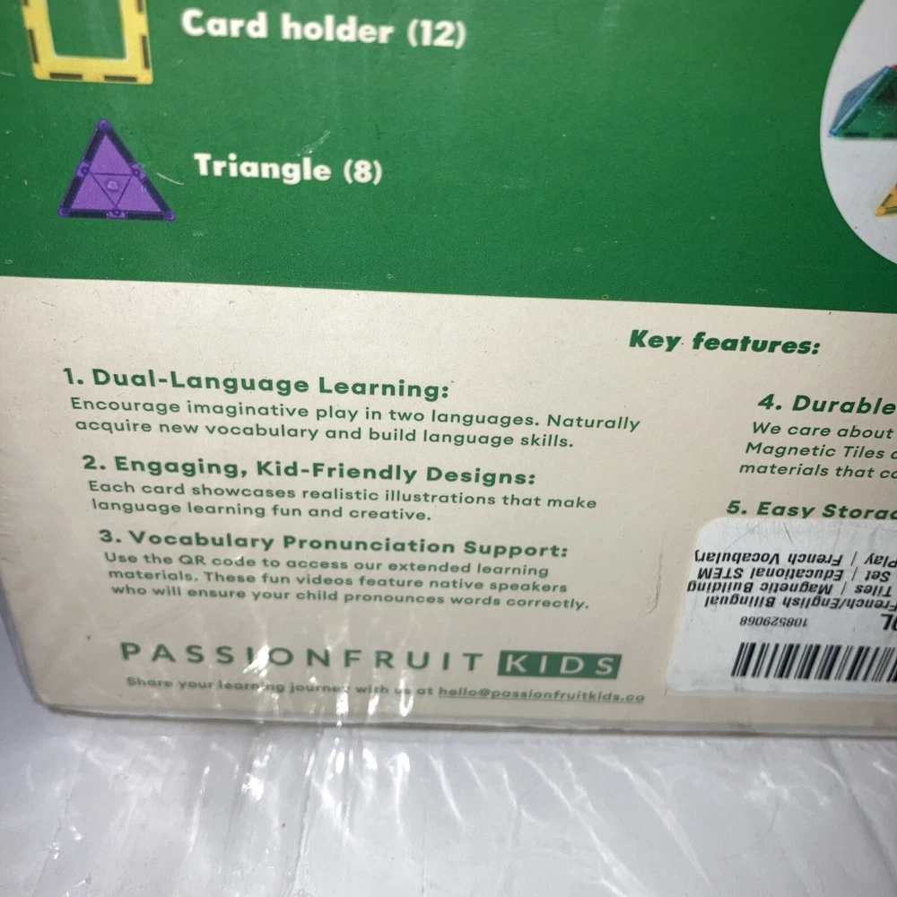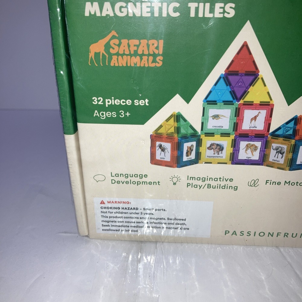 The product is a set of magnetic tiles for kids, designed to help them learn French and English. The tiles are from the Passionfruit Kids brand and come in a Safari color pattern. The package dimensions are 6.89x5.87x2.13 inches and the weight is 1.48 pounds. These tiles are part of a complete set and are suitable for building toys and blocks.