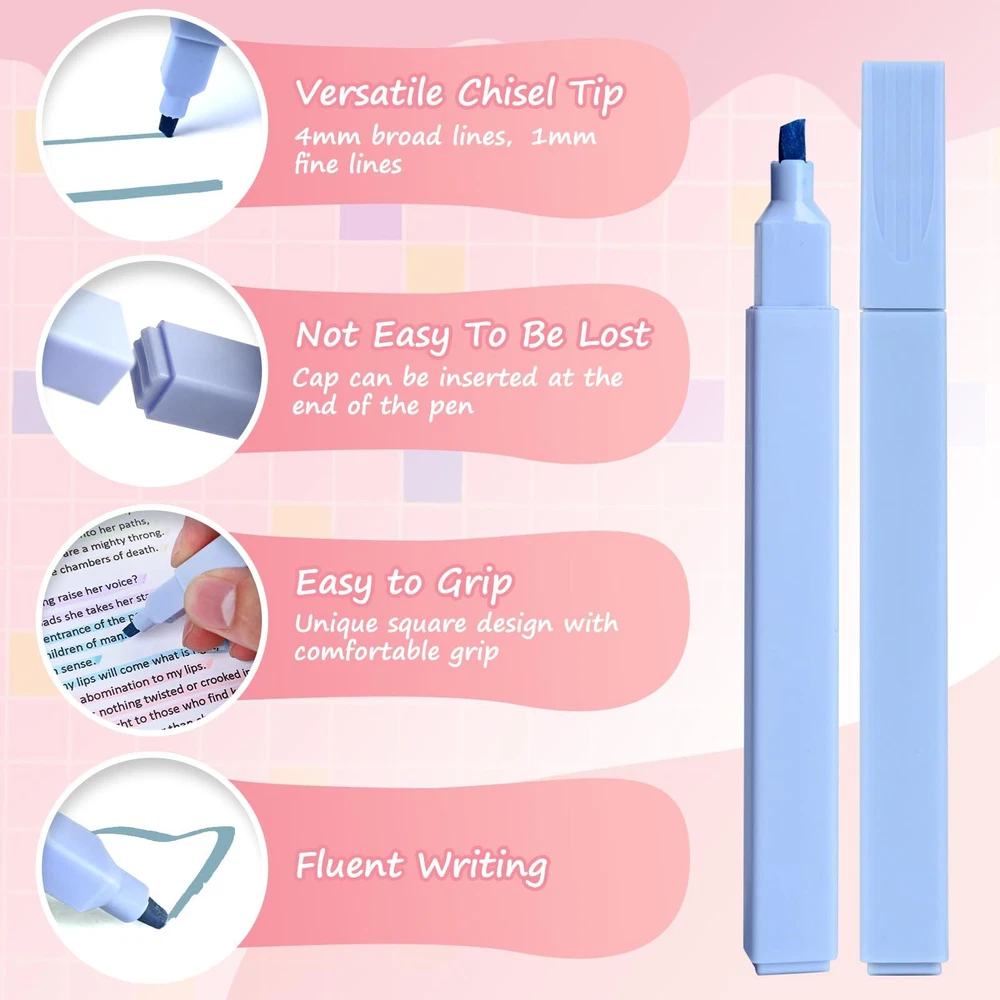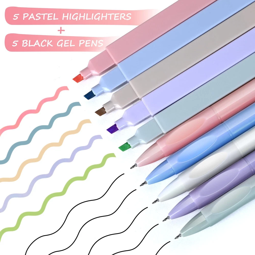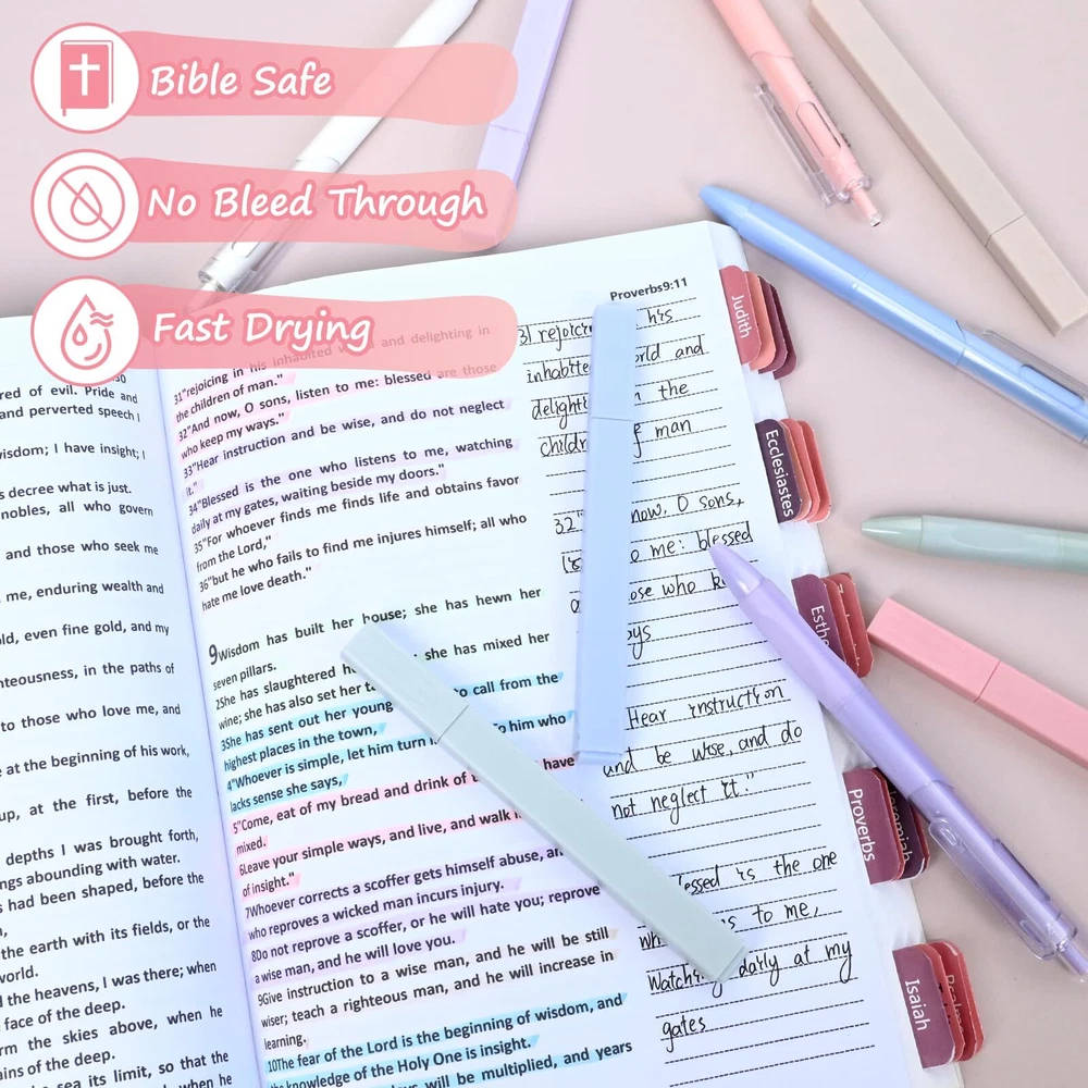Droaful 5 Pcs Aesthetic Cute Assorted Colors Highlighters and 5 Pcs Black Ink Bible Cute Pens 〓Product Features 【Highlighters Assorted Colors】 Versatile Chisel Tip:The colorful highlighters tip can create both a bold line of 4mm width and showcase the precision of a fine line measuring 1mm. Not Easy To Be Lost:The bible highlighters no bleed cap easily inserts at the pen end, ensuring loss prevention. Soft Colors: The pastel highlighters offer soft, non-neon, and mild but vibrant colors that are easy on the eyes and not distracting. Dry Fast: Water-based ink in the assorted highlighters ensures quick drying. No Bleed: The bible highlighters are designed not to bleed through pages under proper use. Easy to Hold: The highlighter pack feature an ergonomic design for comfortable use without causing hand strain. Smooth:The neutral highlighters boast free-flowing ink with a soft chisel tip for a smooth highlighting experience. Easy to Carry: The thin highlighters are small, lightweight, and easy to carry around in purses or pencil cases. 【Bible Cute Pens】 Durable Clip:Pastel pens allow you to clip them onto clothing or books anytime, anywhere. Sealed With Wax:Each aesthetic pen is sealed with wax to prevent ink from drying. Quick Dry:This bullet journal pens utilizes a special quick-drying formula, ensuring the ink dries rapidly upon writing, effectively preventing smearing and maintaining clear, neat writing. Twin-Ball Nib Design: The cute pens features a 0.5mm tip, employing twin-ball tip technology that significantly reduces writing resistance with its dual-ball tip, providing a more stable and smooth writing experience. 【Wide Applications】 The bible highlighters and pens no bleed not only effortlessly tackles the demands of school and office tasks but also showcases its multifaceted functionality in various settings. Whether highlighting passages in the Bible,taking meticulous notes, penning down your thoughts in a diary, or planning your schedule, these bullet journal markers emerge as indispensable allies in your daily life. From study sessions to work commitments and family affairs, this bible pens and highlighters no bleed set effortlessly empowers you to navigate through life, fostering a more organized and efficient lifestyle. 〓Note Due to lighting, display settings, and other factors, it is possible that there may be slight color differences between the product images on our website and the actual product that you receive. 【Bible Journaling Supplies】Package includes 5 aesthetic highlighters assorted colors and 5 aesthetic black ink gel pens, perfect for taking notes in your Bible. It allows you to highlight and record without damaging the pages, serving as the ideal writing companion for your bible studies. Whether you're delving deep into scripture, taking notes, or making annotations, this bible highlighters and pens no bleed set caters to your diverse writing needs. 【No Bleed Highlighters】These pastel highlighters boast a comfortable feel, easy grip, and no discomfort or rolling during use. The versatile chisel tip effectively creates both broad and fine lines, delivering precise highlighting and underlining. The bible highlighters dry quickly, ensuring no leakage or smudging under correct usage, unless excessive pressure is applied during highlighting, marking, or writing. The unique eye-friendly color scheme of the cute markers ensures comfort during extended use, reducing eye fatigue. 【Cute Aesthetic Pens】The cute pen features a 0.5mm tip, employing twin-ball tip technology that significantly reduces writing resistance with its dual-ball tip, providing a more stable and smooth writing experience.The round body design of the aesthetic pens cleverly prevents hand fatigue during extended writing sessions. This bullet journal pens utilizes a special quick-drying formula, ensuring the ink dries rapidly upon writing, effectively preventing smearing and maintaining clear, neat writing. We've thoughtfully equipped the planner pens with a carefully designed pen clip for easy portability, allowing you to clip it onto clothing or books anytime, anywhere. 【Wide Applications】This pastel highlighter set excels not only in handling various tasks at school and the office but also demonstrates its versatile functionality in multiple settings. Whether highlighting bible, taking notes, writing journals, or planning schedules, The bible pens no bleed through become indispensable assistants in your life. In studying, working, and everyday life, this cute pens for school supplies helps you effortlessly tackle tasks, creating a more organized and efficient lifestyle. 【The Perfect Gift】An excellent reward for students, a standout gift for art enthusiasts, and a thoughtful choice for birthdays, Christmas, or New Year. Whether for friends or family, this highlighters assorted colors will bring joy and surprise. The bible highlighters and pens no bleed inspires creativity and serves as an emotional engine for capturing thoughts. Encourage your loved ones to take more notes, unleashing their inner inspiration and creativity. 【Best Service】If you have any questions or suggestions about our bible highlighters no bleed , please contact us BY EMAIL as soon as possible.Our business philosophy is customer first , and we will do our best to solve your problems.We guarantee 30-day money-back for any reason ,will send you a replacement for ANY quality-related issues within one year of the date your purchase.