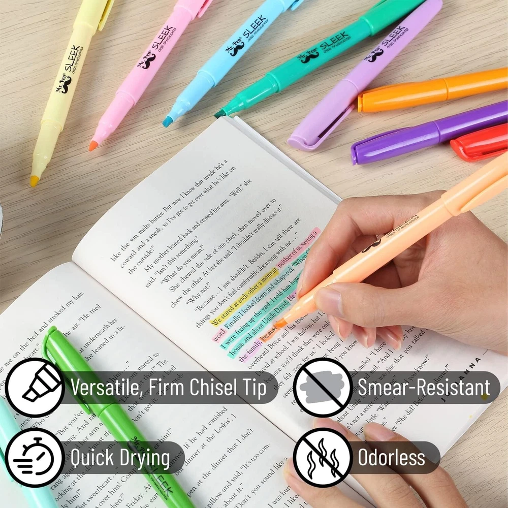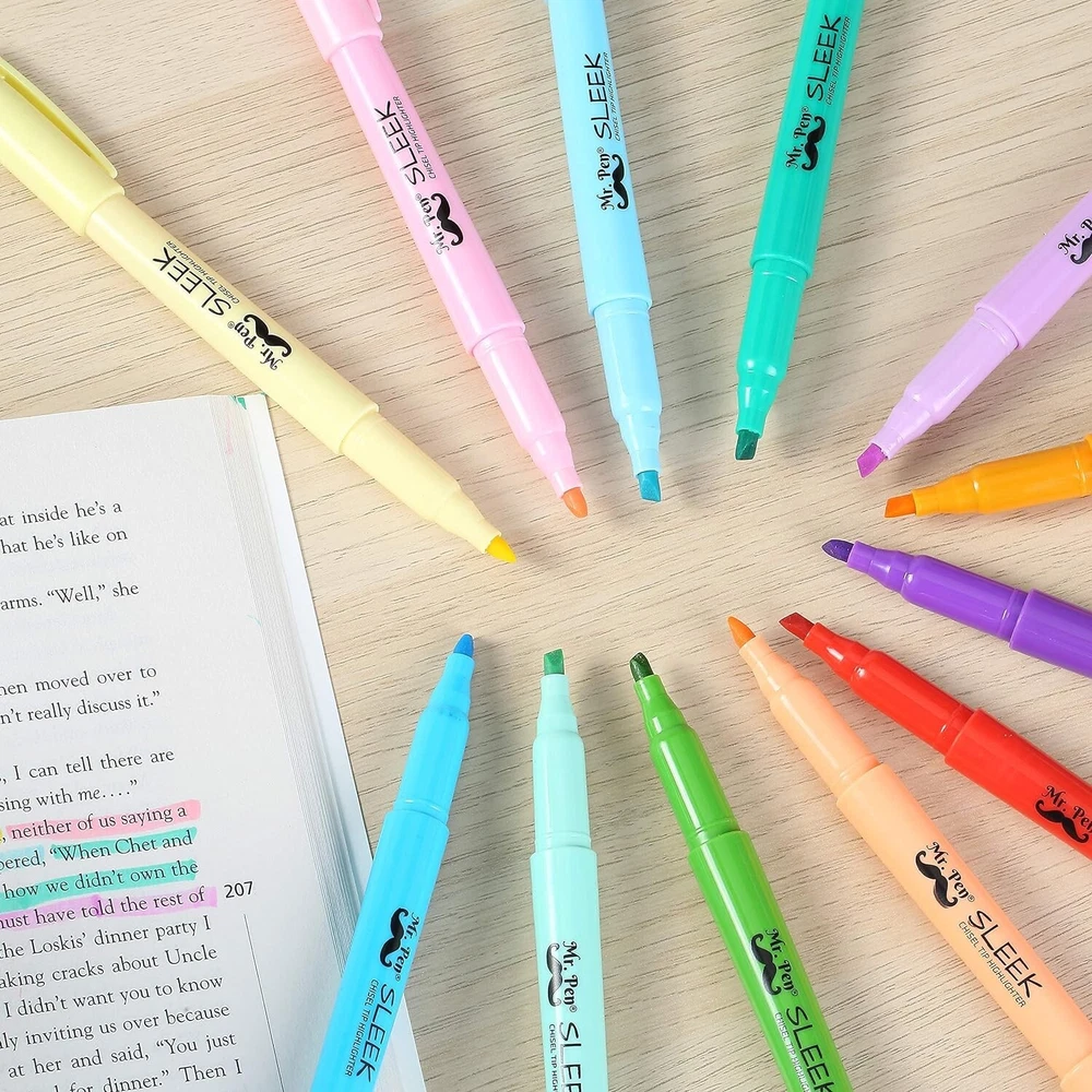 Pastel Highlighters , 12 Pack , Assorted Colors , Fast Dry , Highlighter Pastel , Set , Bible Journaling Highlighter , Marker , Colored School Supplies Ink Color Multicolor Number of Items 12 Point Type Chisel Recommended Uses For Product Writing About this item Mr. Pen Highlighter Pack Includes 12 Pastel Color Highlighters In Assorted Colors Multi-Purpose Chisel Tip Highlighters, Great For Highlighting, Underlining Or Writing Notes Quick Dry, Odorless And Non-Toxic Ink Highlighters Resist Smearing Of Many Pens And Marker Inks (Let Ink Dry Before Highlighting) Premium Highlighters Great For Highlighting And Emphasizing Words And Sentences At School, Home, Or Office