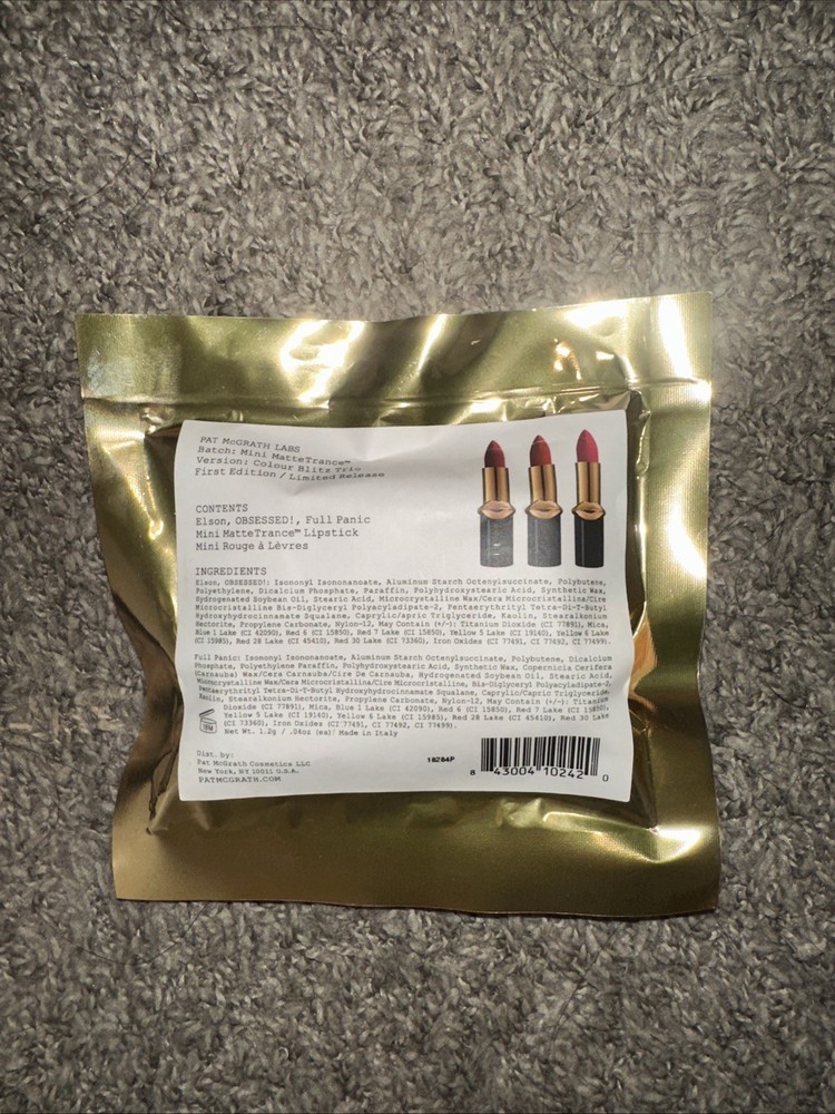 The Pat McGrath Labs Mini Mattetrance Color Blitz Trio Limited Edition is a set of three lipstick sticks from the brand's BlitzTrance line. The lipsticks are formulated for a matte effect and are unscented with an unflavored taste. The limited edition set includes assorted shades, perfect for those looking to add a pop of color to their lips with a high-quality makeup product from a reputable brand. Three shades: Elson, OBESSED!, Full Panic Mini MatteTrance lipstick, Mini Rouge à Lèvres.