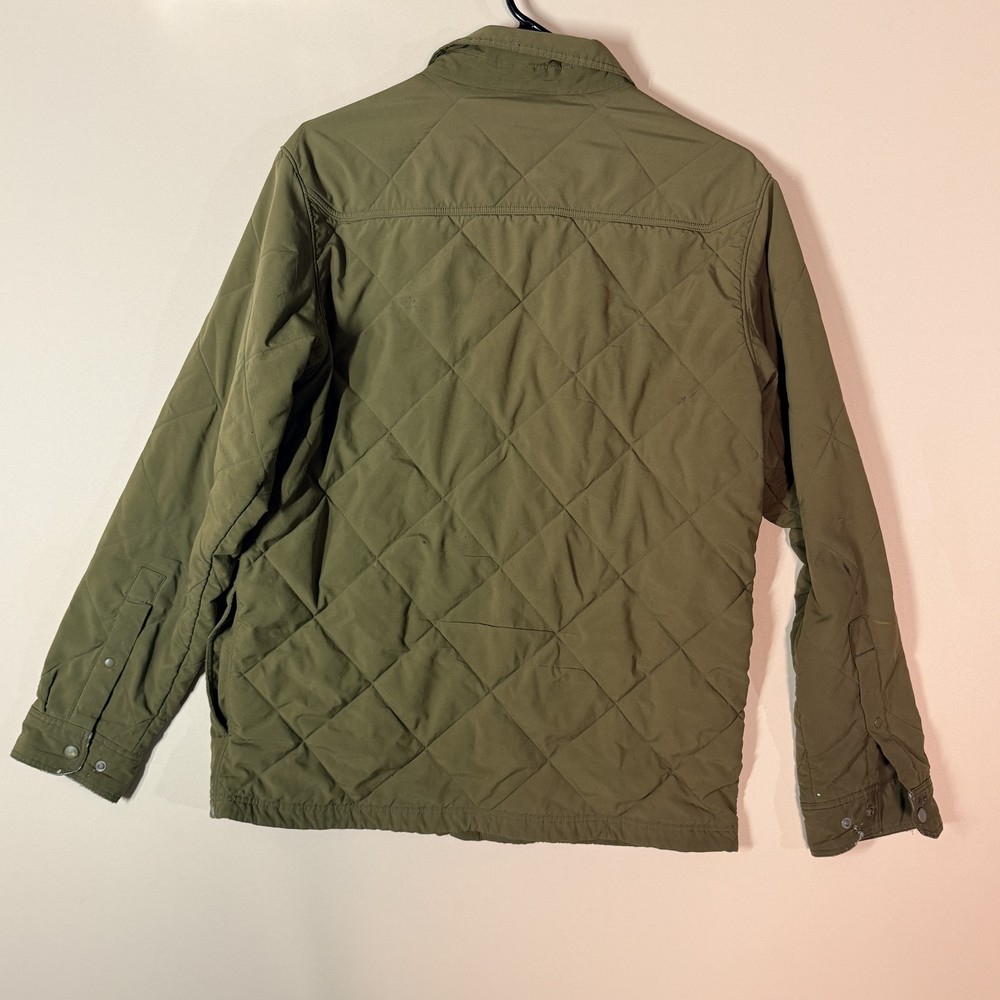 The Patagonia Fitz Roy Diamond Quilted Puffer Snap Shirt Jacket in green is a stylish and practical addition to any man's wardrobe. Made of durable nylon with a cozy polyester lining, this jacket features a solid pattern and a stand-up collar for added warmth and style. The regular fit and size small make it a comfortable and versatile piece for everyday wear. Easy to care for with machine washable instructions, this jacket is perfect for outdoor adventures or casual outings. Made by the trusted brand Patagonia, you can trust in the quality and craftsmanship of this jacket. Marks on front and possibly elsewhere. Priced accordingly.