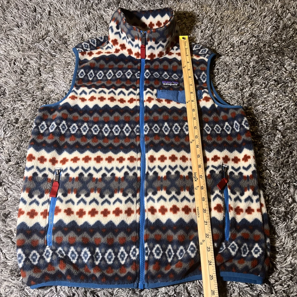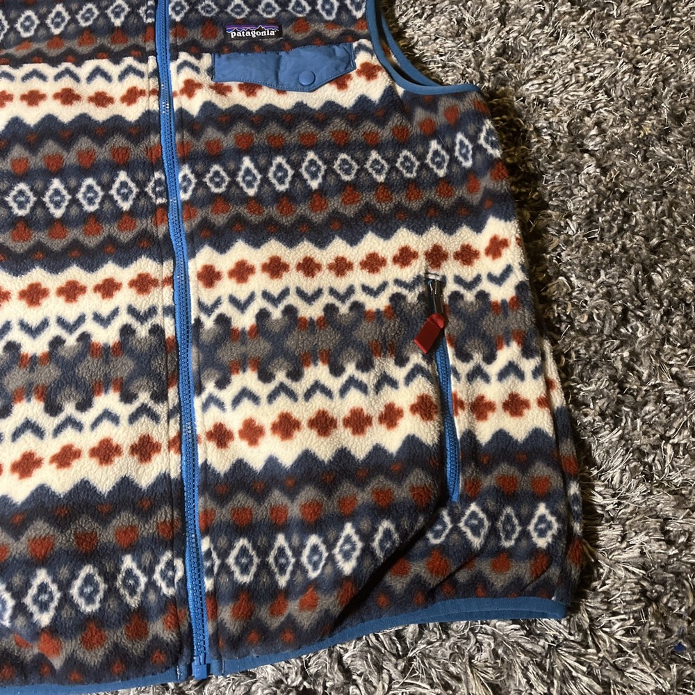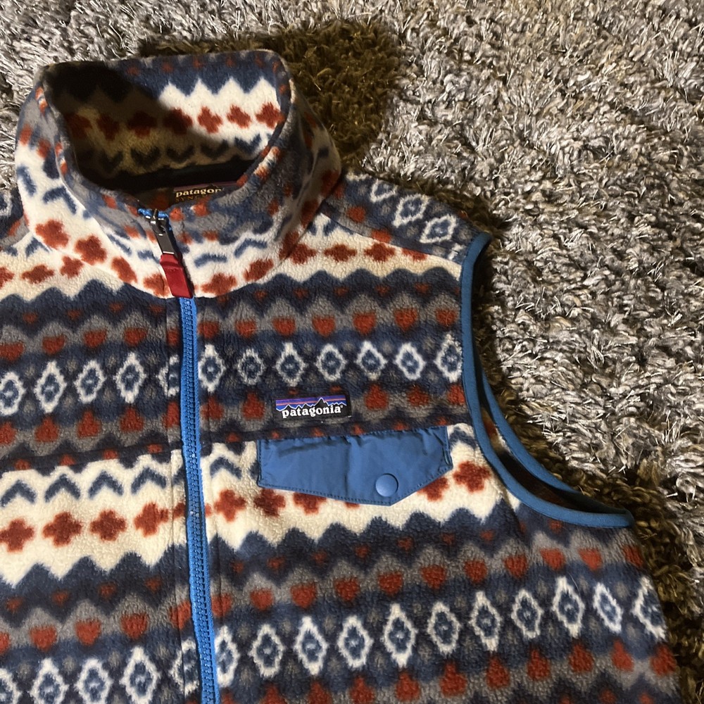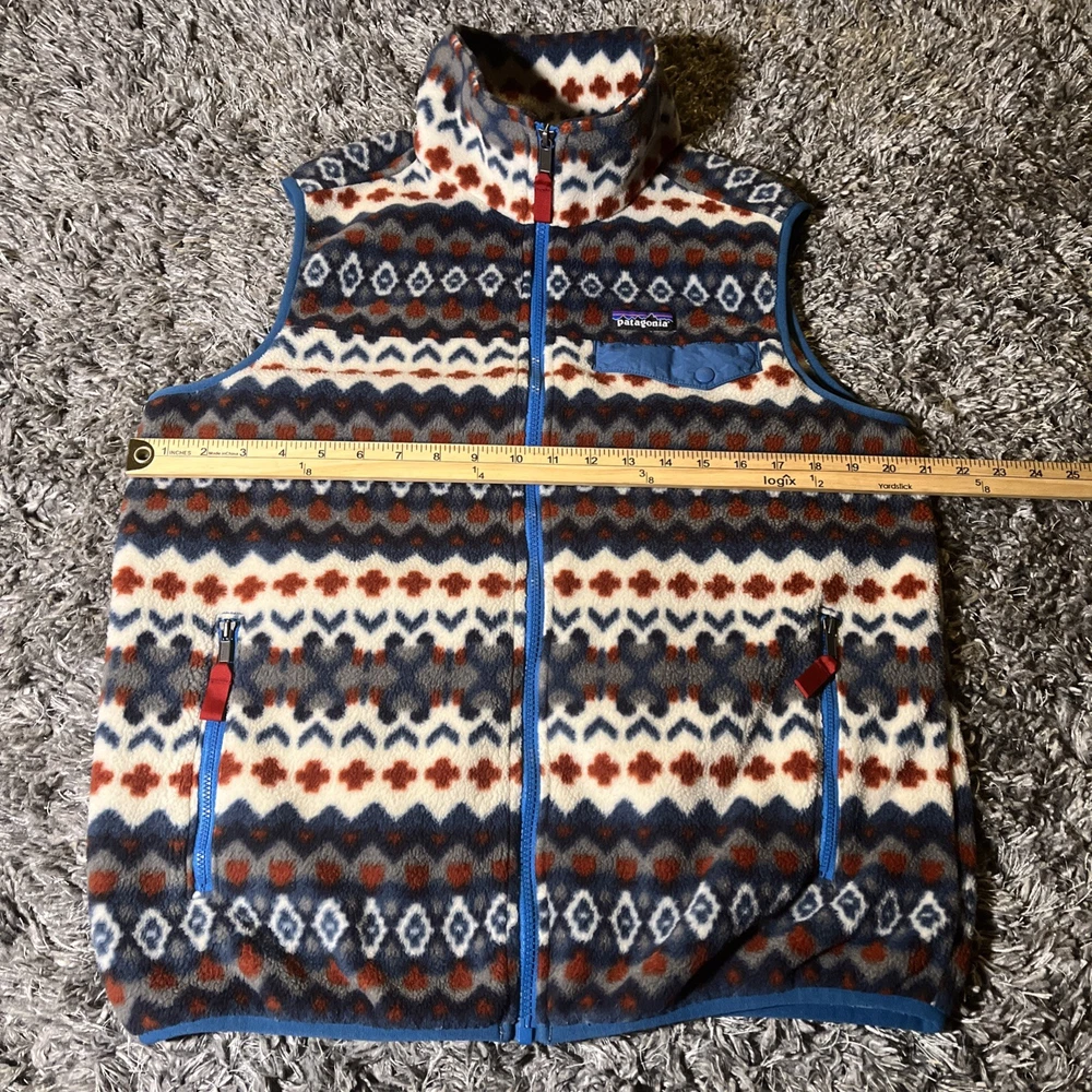 The Patagonia Lightweight Snap T Vest is a stylish and versatile outerwear piece for men. Made with polyester fleece fabric, this vest is perfect for travel, casual outings, or parties. The Aztec tribal geometric pattern adds a unique and stylish touch to the bomber jacket style. With a full zip closure and stand-up collar, this mid-length vest is both functional and fashionable. Machine washable and suitable for winter, fall, and spring seasons, this Patagonia vest is a must-have for outdoor enthusiasts and those who appreciate a southwestern flair in their wardrobe.