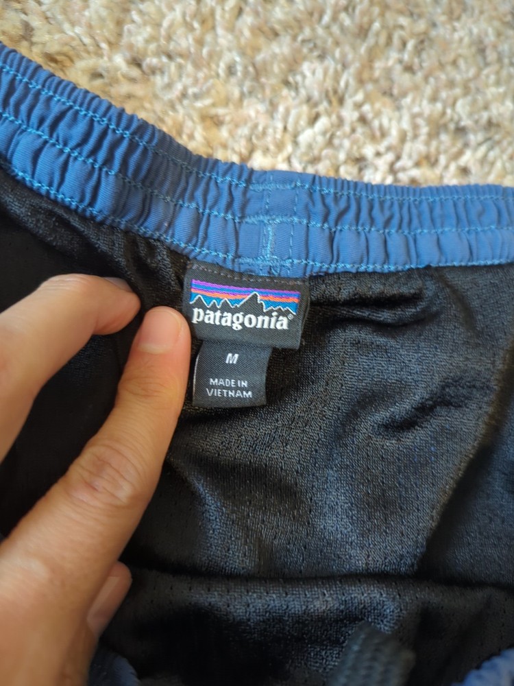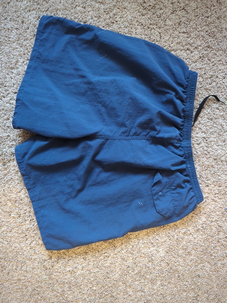 There are a few area of light discoloration on back of trunks as shown in photos. no rips or holes. drawstring works well.