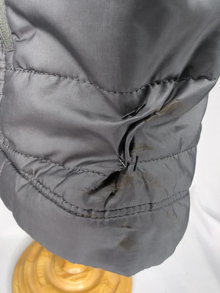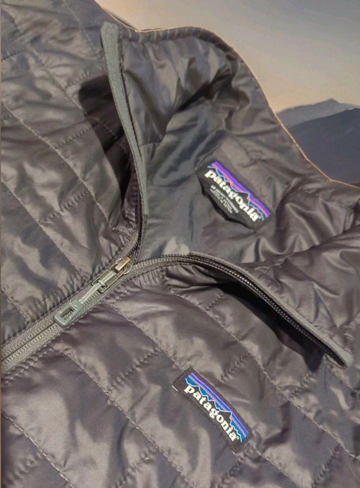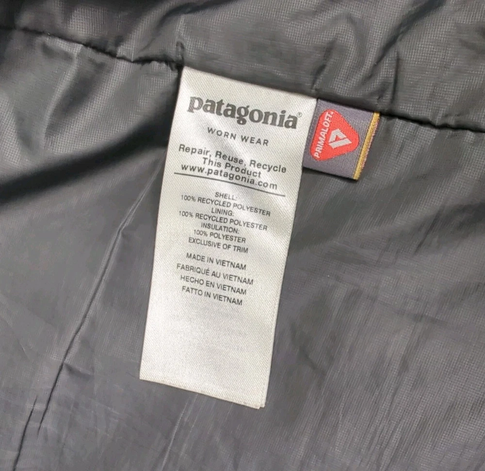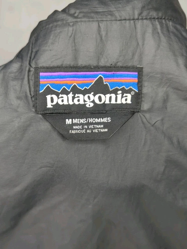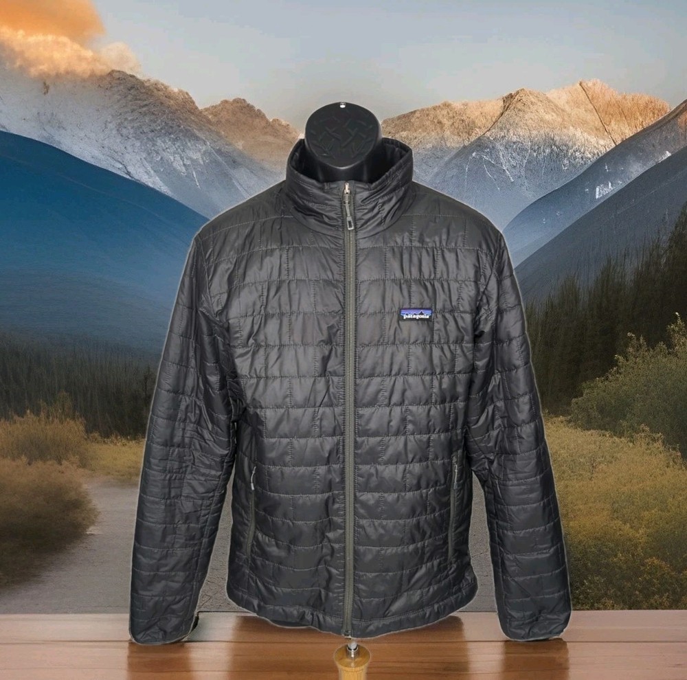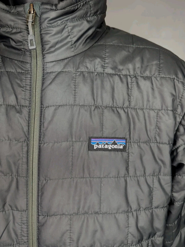 PATAGONIA NANO PUFF PRIMALOFT INSULATED WINTER JACKET MENS SIZE MEDIUM - 22" ACROSS EXTERIOR CHEST LAID FLAT FORGE GREY IN COLOR Lightweight, 100% recycled polyester ripstop shell and lining fabric has a DWR (durable water repellent) finish The most thermally efficient synthetic insulation available now with 55% post-consumer recycled content, 60-g PrimaLoft® Gold Insulation Eco is water-repellent, highly compressible and maintains 98% of warmth, even when wet Brick quilting pattern with horizontal quilt lines on side panels stabilizes insulation and uses durable thread for abrasion resistance Center-front zipper has wicking interior storm flap and zipper garage at chin for next-to-skin comfort Two zippered handwarmer pockets have cleanly finished zipper garages; zippered internal chest pocket doubles as a stuffsack with a reinforced carabiner clip-in loop Drawcord-adjustable drop-tail hem seals in warmth Fair Trade Certified™ sewn PRE OWNED CONDITION - UNFORTUNATELY THERE ARE A FEW IMPERFECTIONS UNDERNEATH THE LEFT SIDE AREA WHERE THE SLEEVE SITS (WEAR MARKS AND A PATCHED HOLE - YOU CAN'T REALLY TELL THEY ARE THERE WITH THE SLEEVE DOWN UNLESS YOU'RE REALLY LOOKING FOR THEM BUT PRICE REFLECTS THESE FLAWS) - SO PLEASE SEE PICS (FIRST PHOTO IS STOCK FOR REFERENCE OF SAME MODEL - LAST 3 PHOTOS SHOW THE FLAWS/REPAIRS)