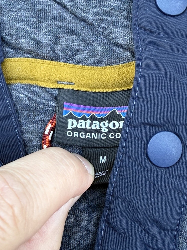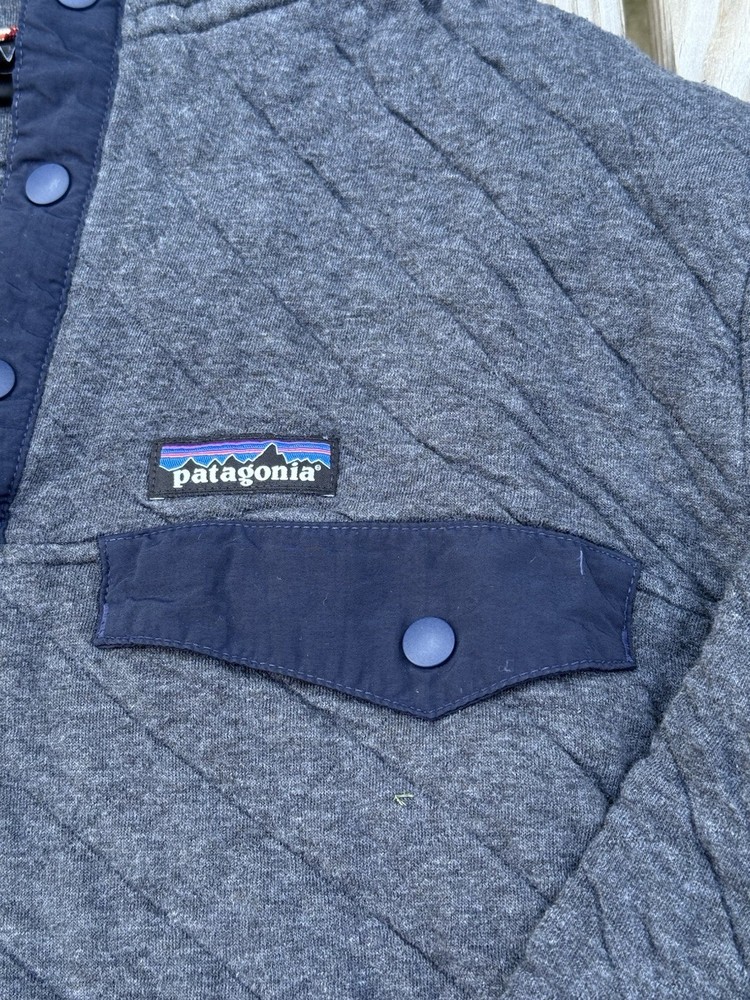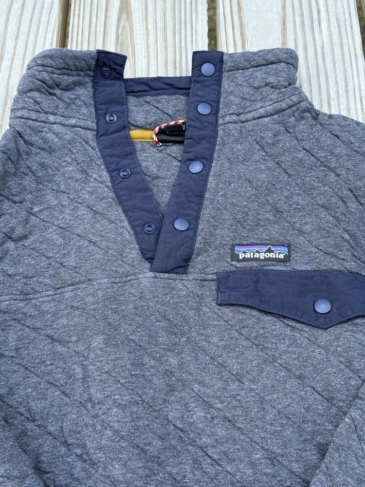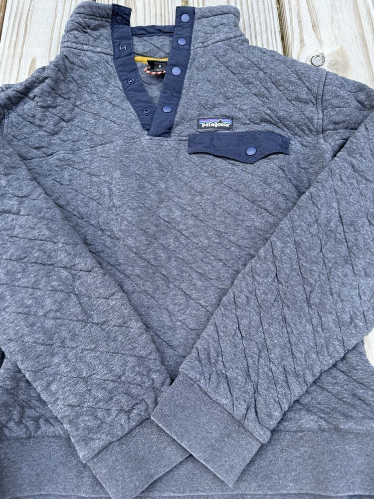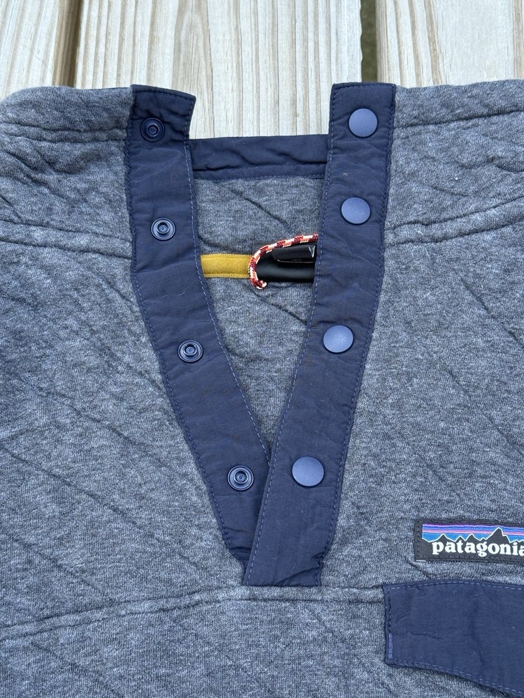 🔷 Patagonia Cotton-Quilt “Snap-T” Pullover – Heather Gray | Men’s M (see measurements) ❄️ 🔷 🧵 Description Slip into Patagonia’s cozy take on a classic with this quilted Snap-T pullover. The diamond-stitched jersey knit blends organic cotton with recycled polyester for sweatshirt-soft comfort and lightweight warmth. A four-snap nylon placket lets you vent on the trail or button up against a breeze, while elastic-bound cuffs and hem keep drafts at bay. Finished in versatile heather gray with tonal trim—perfect for shoulder-season hikes, campus commutes, or couch Sundays. 📏 Measurements (laid flat; slight variance possible) Point Inches Chest (pit-to-pit) 21.5 Shoulder width 18.75 Sleeve A (shoulder seam → cuff) 24.25 Back length (bottom of collar) 24.5 Sleeve A = shoulder-seam → cuff (raglan-style means Sleeve B not taken). Fits like a trim Men’s Medium —please compare to a pullover you own. 🔑 Key Features Fabric: Diamond-quilt knit — ~79 % organic cotton / 21 % recycled polyester (soft & breathable) Color: Heather gray body with tonal nylon placket and interior collar trim Design: Stand collar • 4-snap nylon front placket • Elastic-bound cuffs & hem Details: Hip-length curved hem • P-6 Patagonia flag tag at left side seam Ethos: Fair-Trade Sewn; low-impact dye process ⚙️ Condition — Very good pre-owned Area Notes Fabric No holes, stains, or pilling; quilting still lofty Placket snaps All function smoothly Wear freshly laundered & ready to wear 💡 Why You’ll Love It Quilted cotton-poly blend —sweatshirt comfort with light-jacket warmth. Classic Patagonia Snap-T styling —heritage outdoor look that never dates. Eco-friendly build —organic cotton, recycled poly, and Fair-Trade sewing.